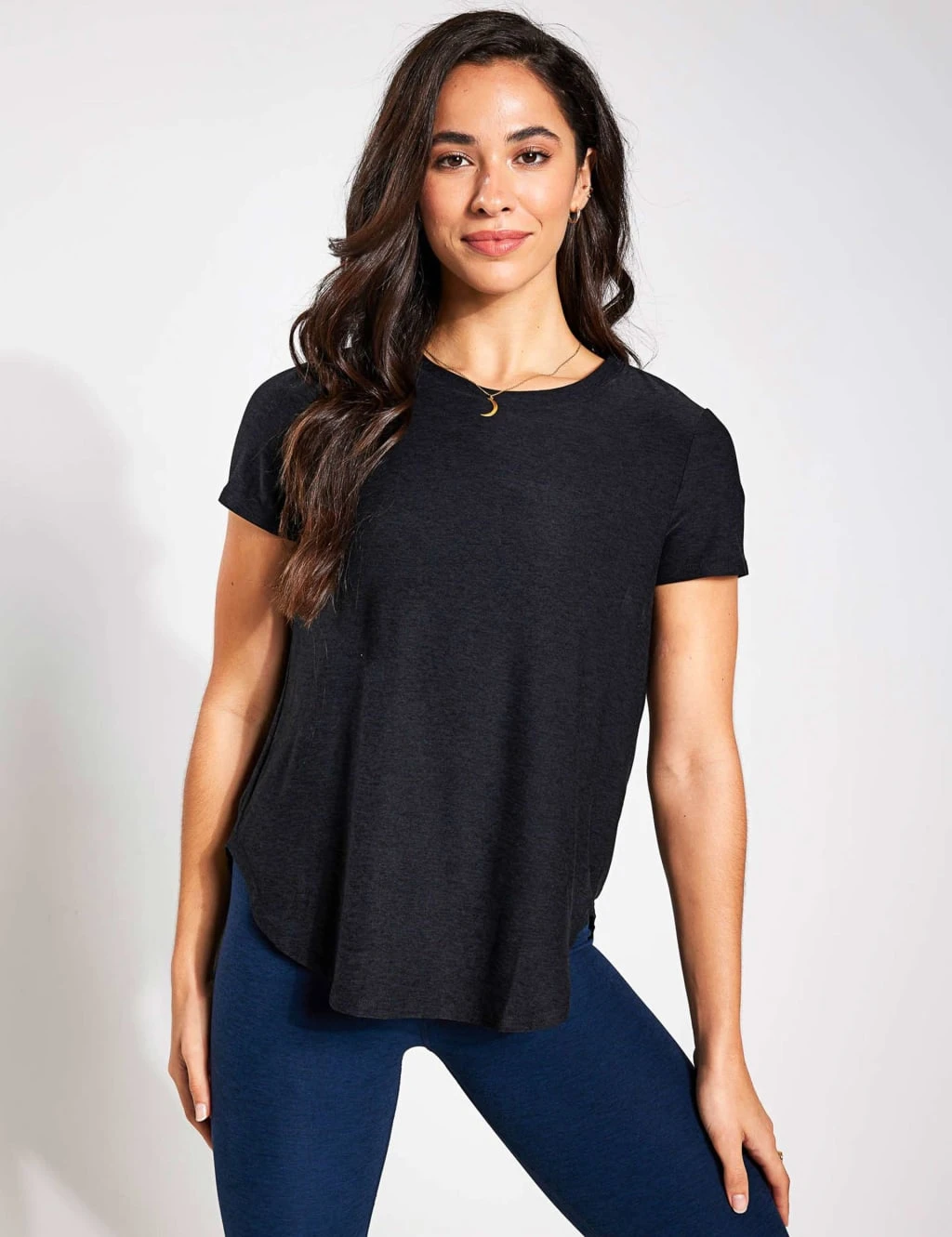 This Featherweight t-shirt from Beyond Yoga is crafted from ultra-soft, lightweight fabric for an extra comfortable feel. The short-sleeved design is cut in a flowing relaxed fit. Sweat-wicking and quick-drying properties mean you stay cool and focused throughout your practice. Four-way stretch ensures freedom of movement, while the curved hem gives a flattering finish.
