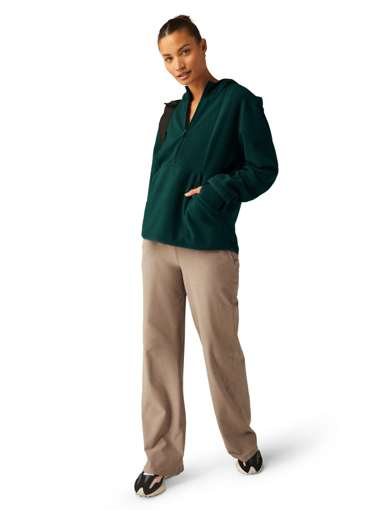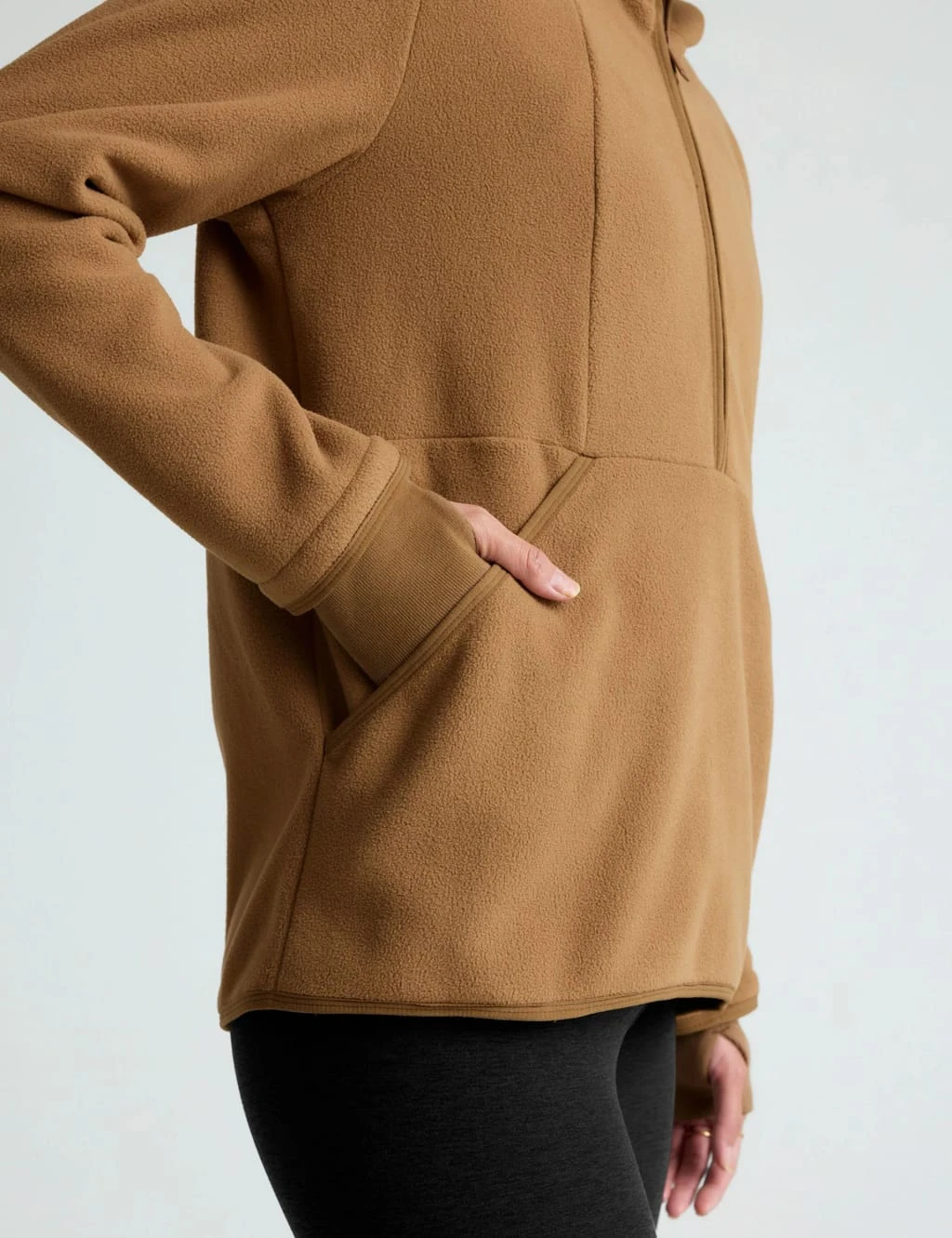 This fleece sweatshirt from Beyond Yoga is ideal for keeping you cosy on your way to and from the gym. It’s made in an easy relaxed fit with a slightly longer hem, perfect for when you need that extra coverage. A half-zip fastening offers versatile styling, while a hood provides added warmth. The design is complete with a kangaroo pocket at the front.