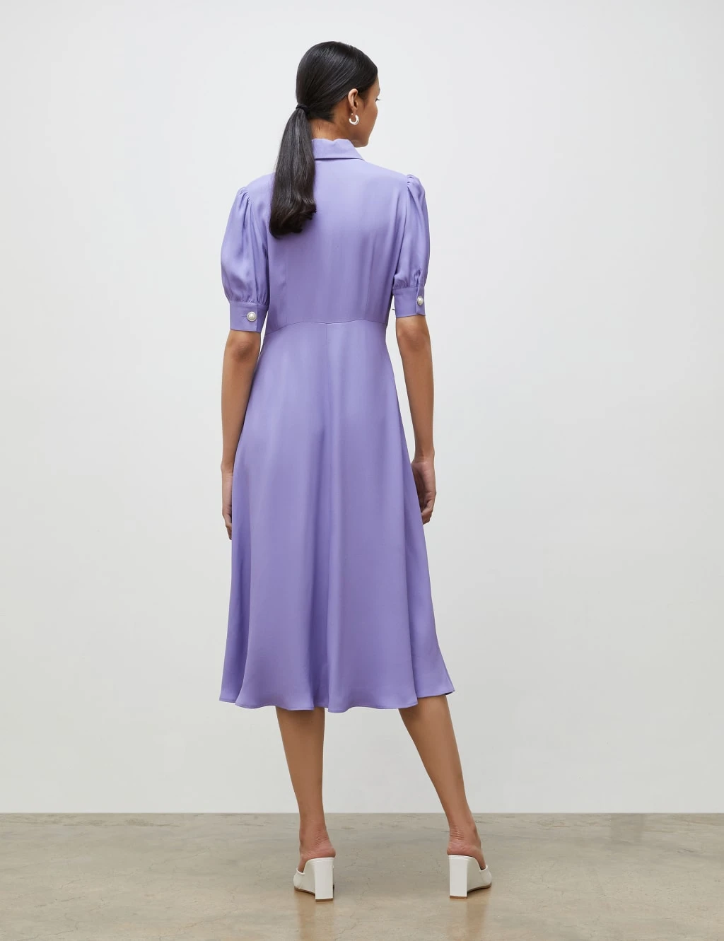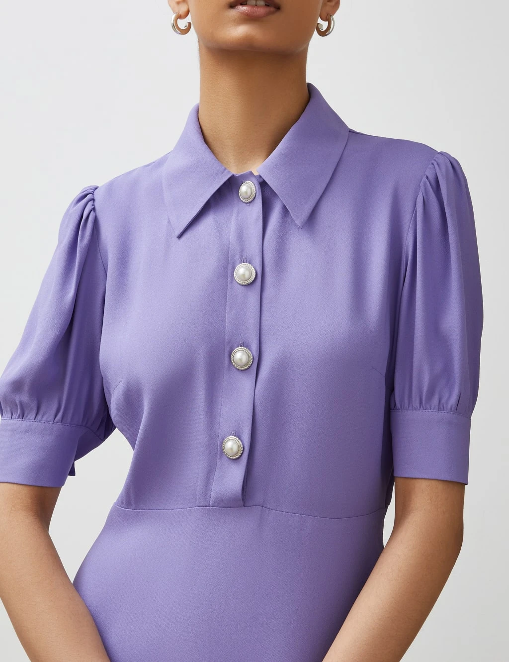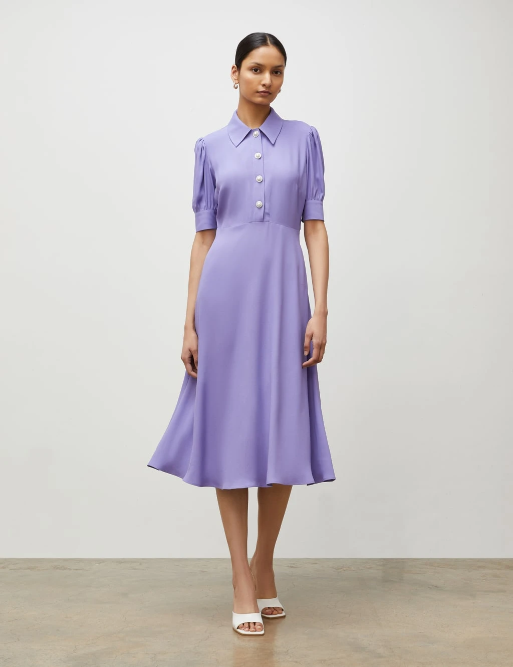 A modern take on 70s style, this waisted dress from Finery London has timeless appeal. It’s cut to a comfortable regular fit with a smart collared neck and short cuffed sleeves. This midi-length piece is elevated with a faux-pearl button fastening from the collar through to the waist.