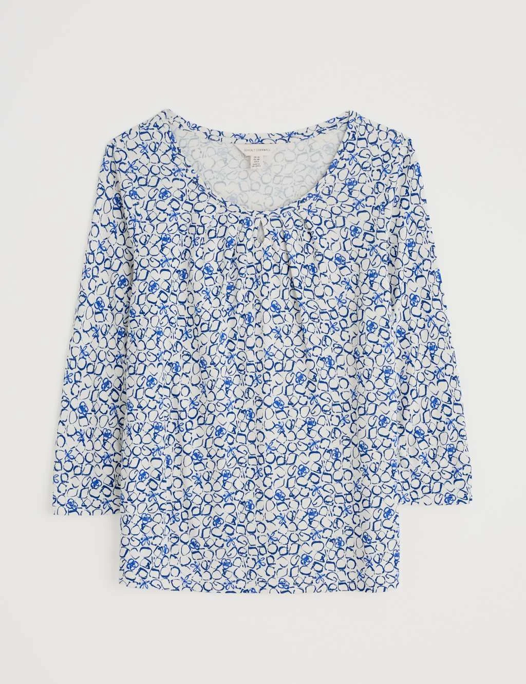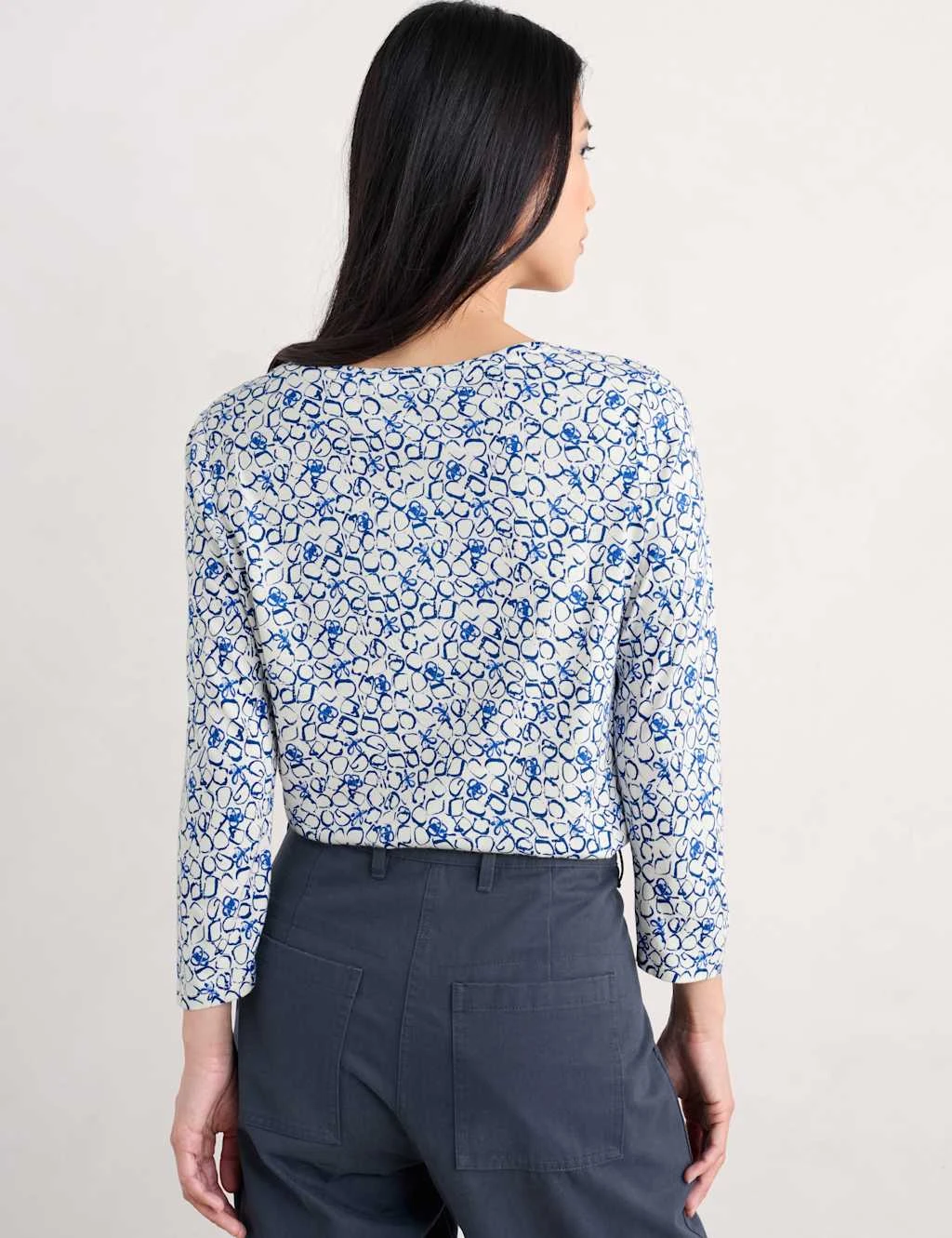 This tunic-style top from Seasalt Cornwall with three-quarter-length sleeves is crafted from cotton-blended fabric for a soft handfeel and a drapey effect. It’s cut in a relaxed fit, with a pretty scoop neckline featuring a dainty teardrop-shaped cutout in the centre. An all-over two-tone geometric print ensures a striking look.