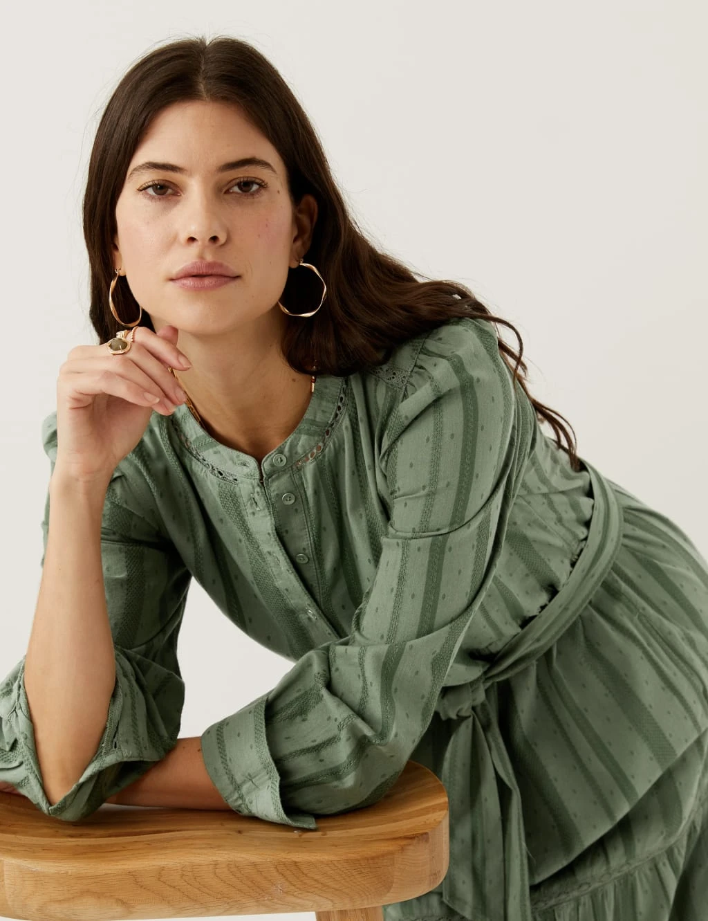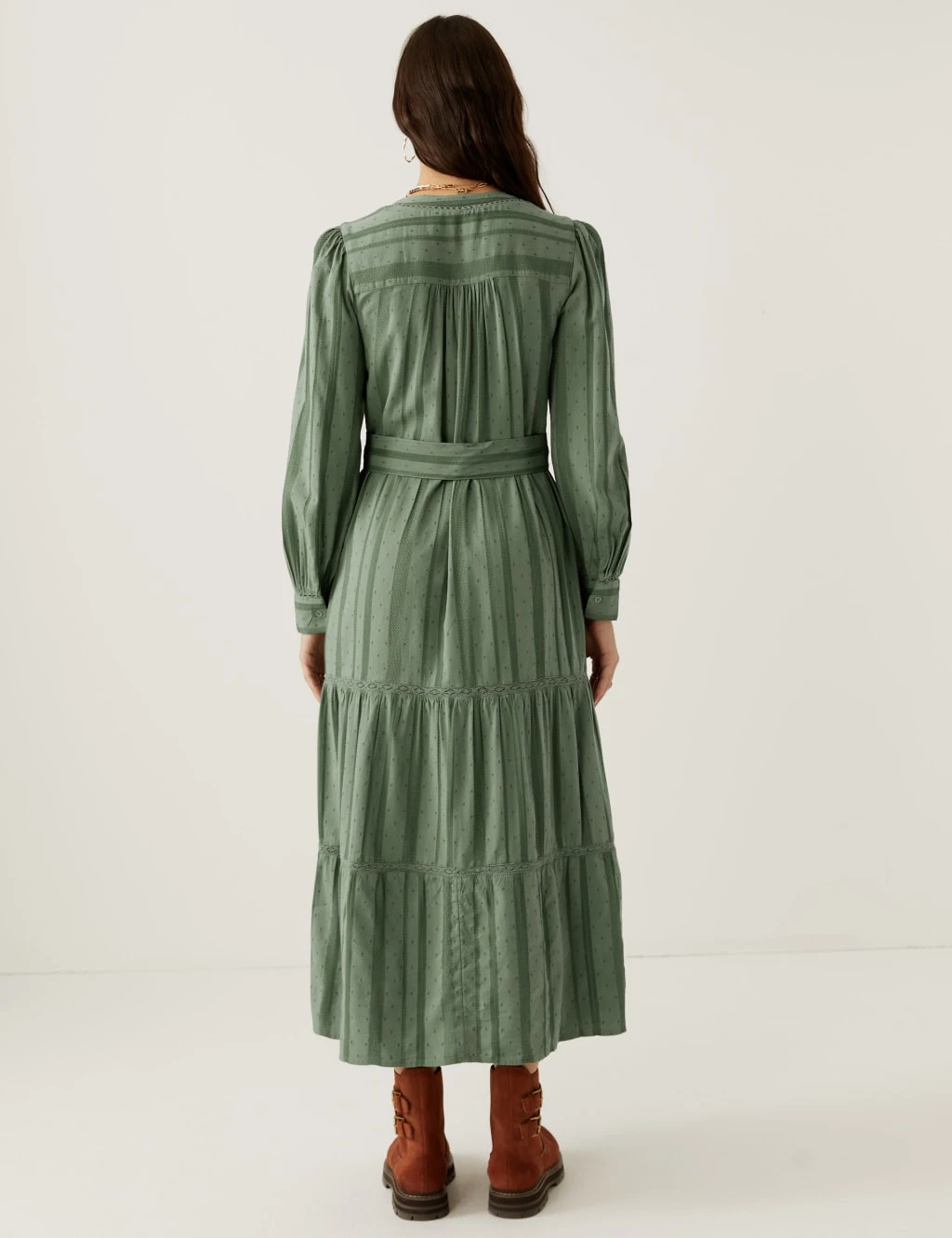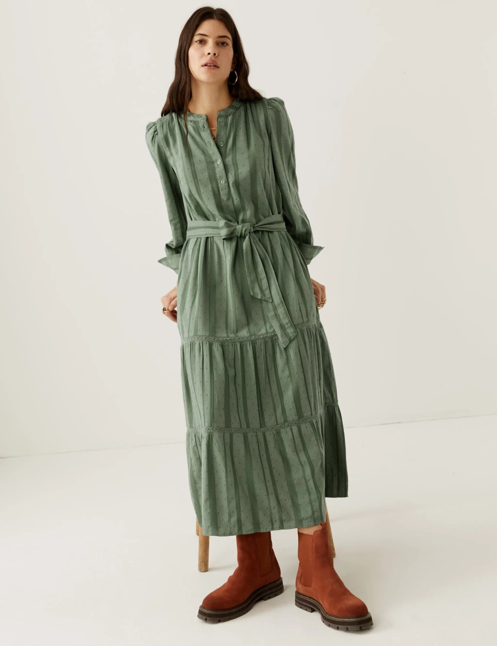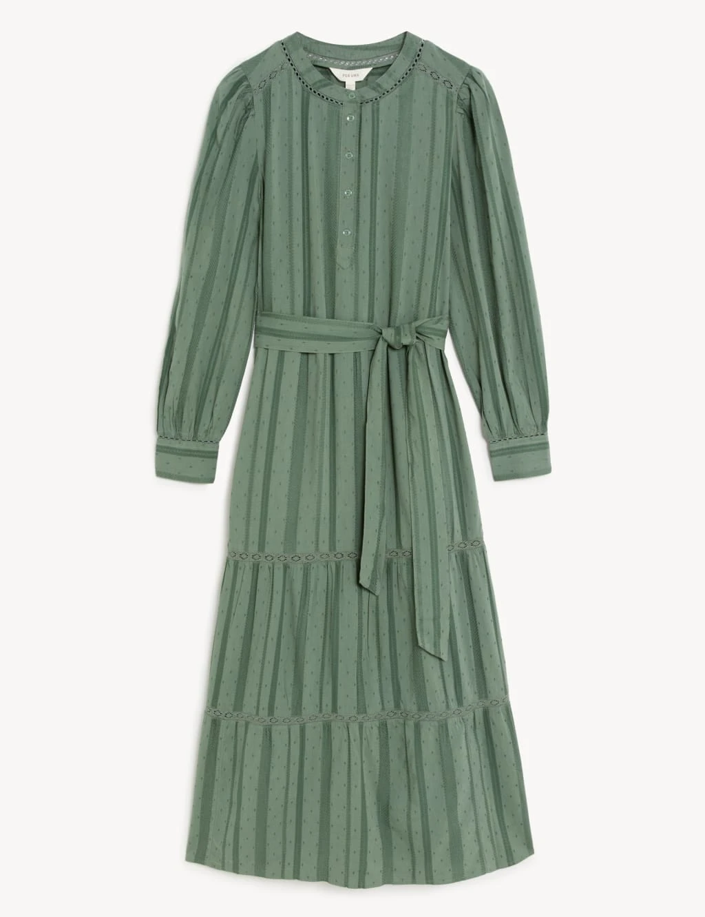 This Per Una dress has the breezy, cotton-blend comfort your summer wardrobe calls for. Cut to a regular fit, it’s flowy and freeing with a tiered midaxi skirt and a self-tie belt for added shape. A round neck and front button placket add neat detail. Its puffed sleeves are complete with smart buttoned cuffs. Dobby-textured fabric and lace inserts deliver a delicately light feel. Per Una: stylish designs crafted with carefully considered details and feminine flourishes.