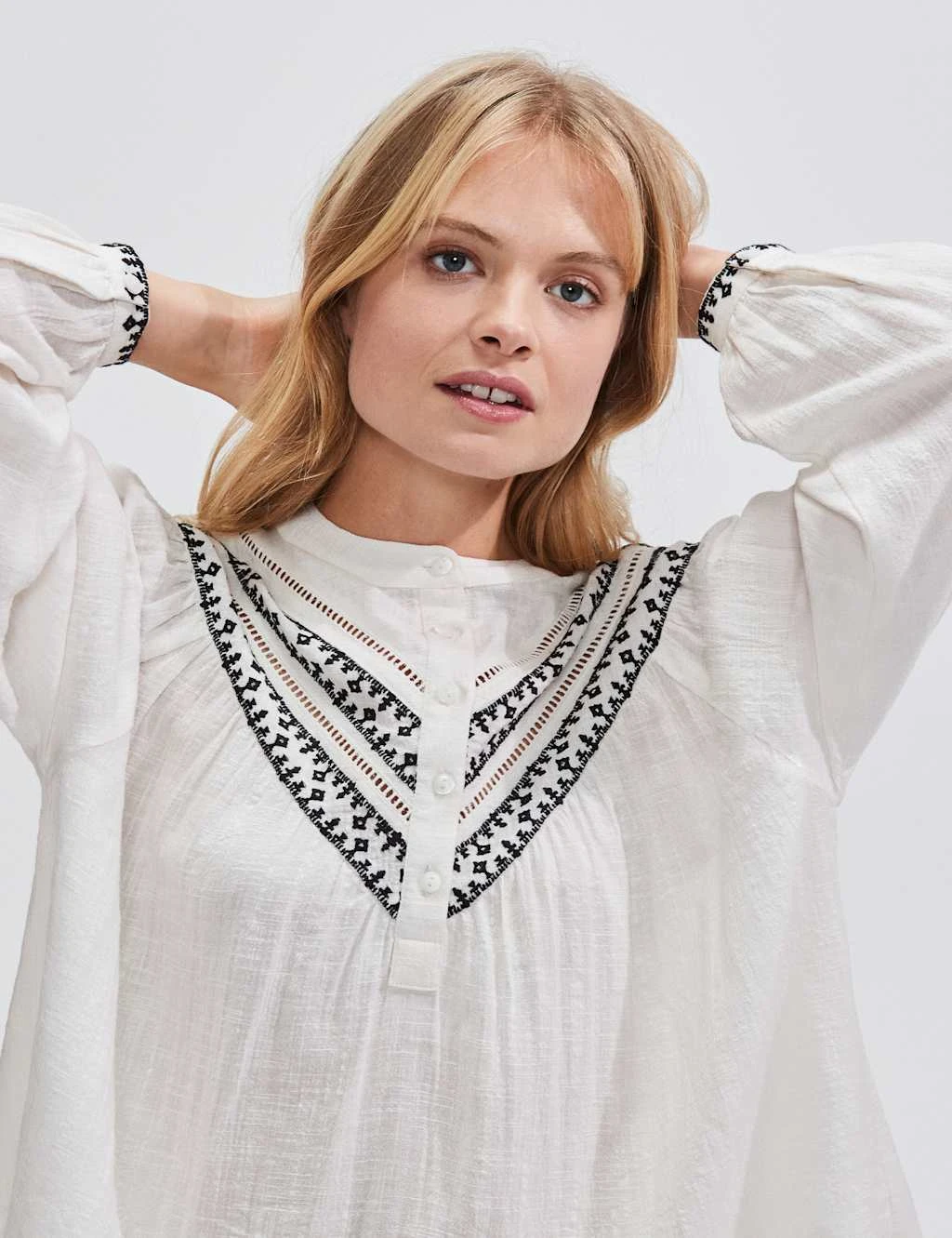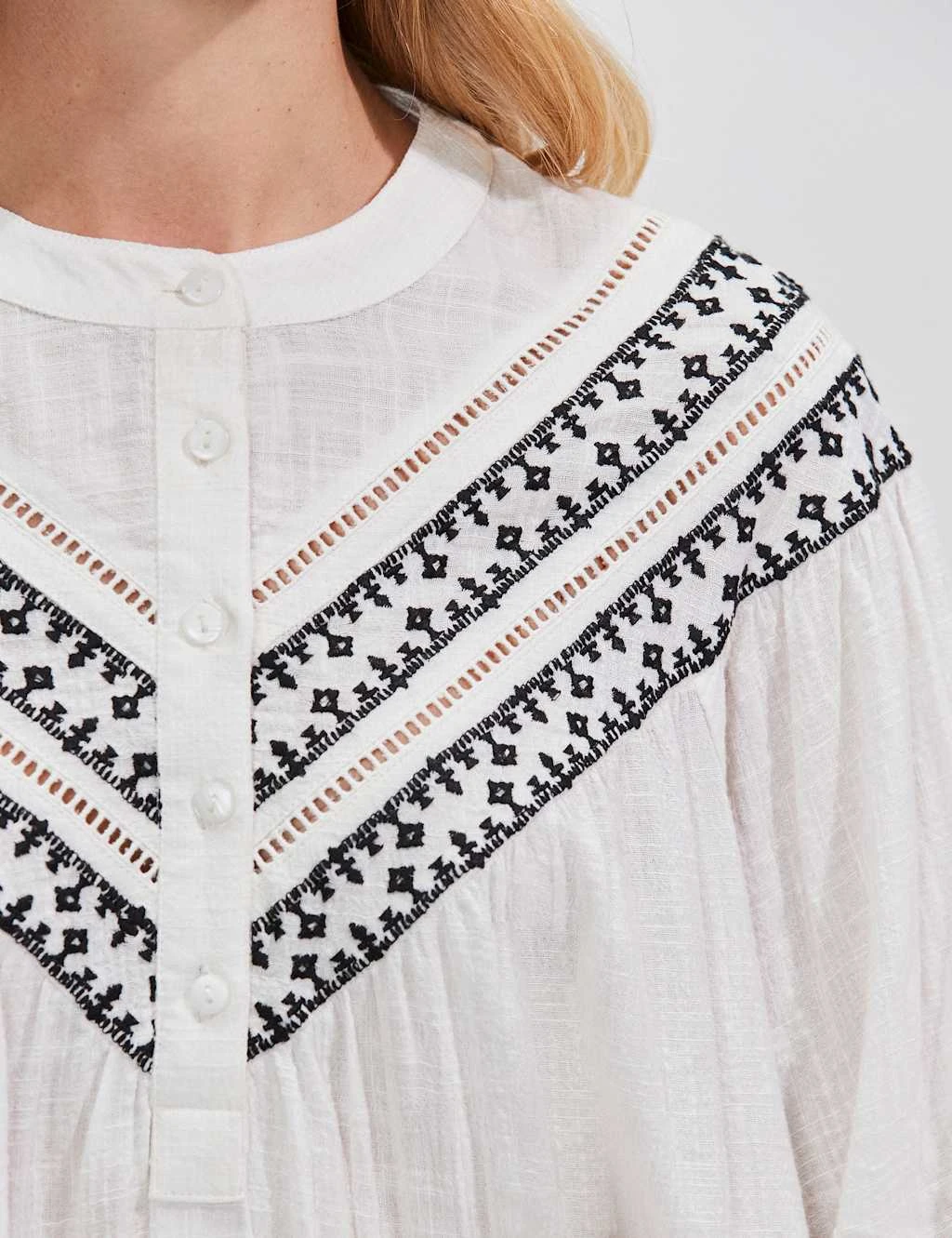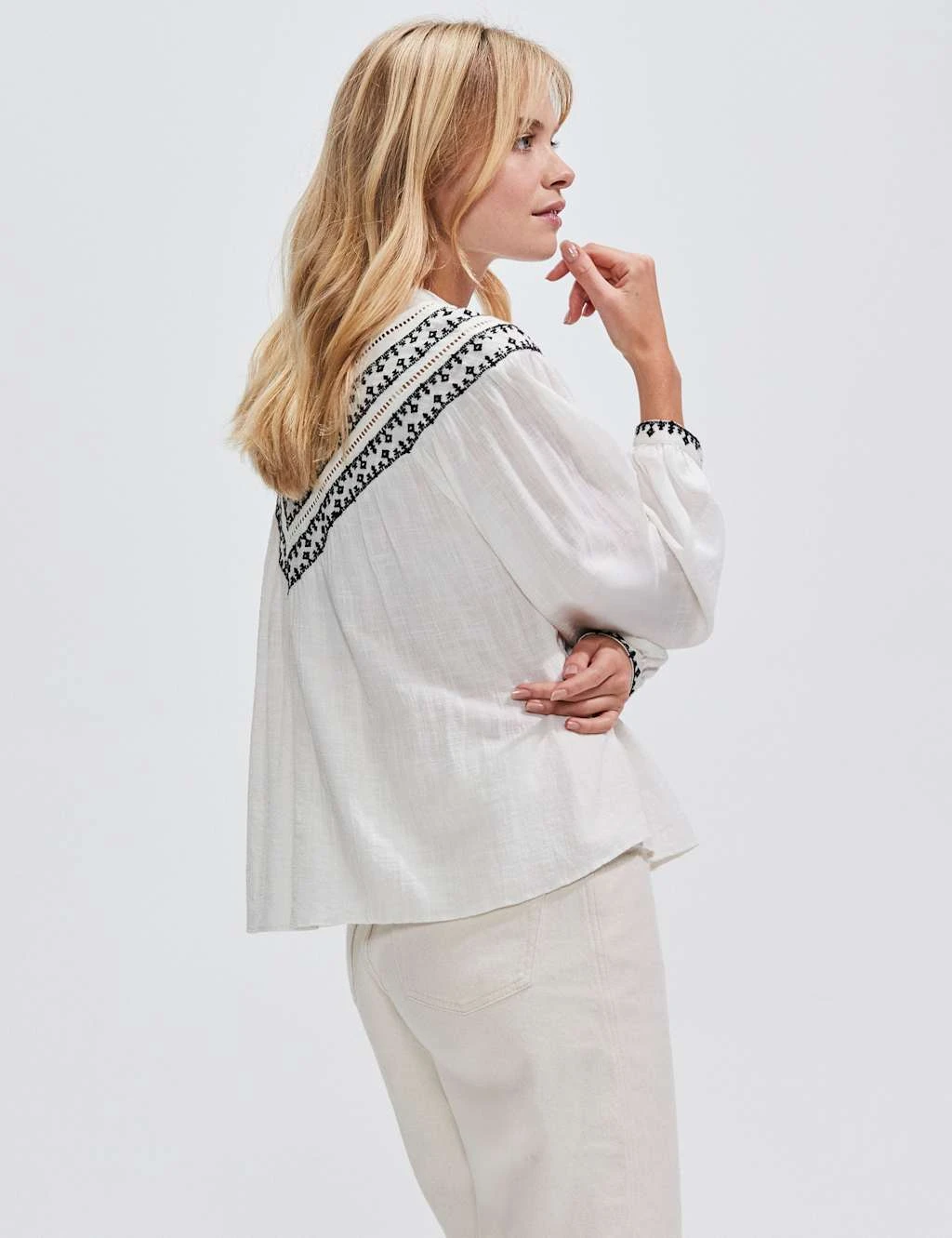 This cotton-rich blouse from RO&ZO is full of romantic charm. It’s made in a relaxed fit, with a neat crew neckline and a button-up placket for versatile styling. Embroidered detail on the cuffs of the long blouson sleeves and yoke gives this boho piece a pretty finish.