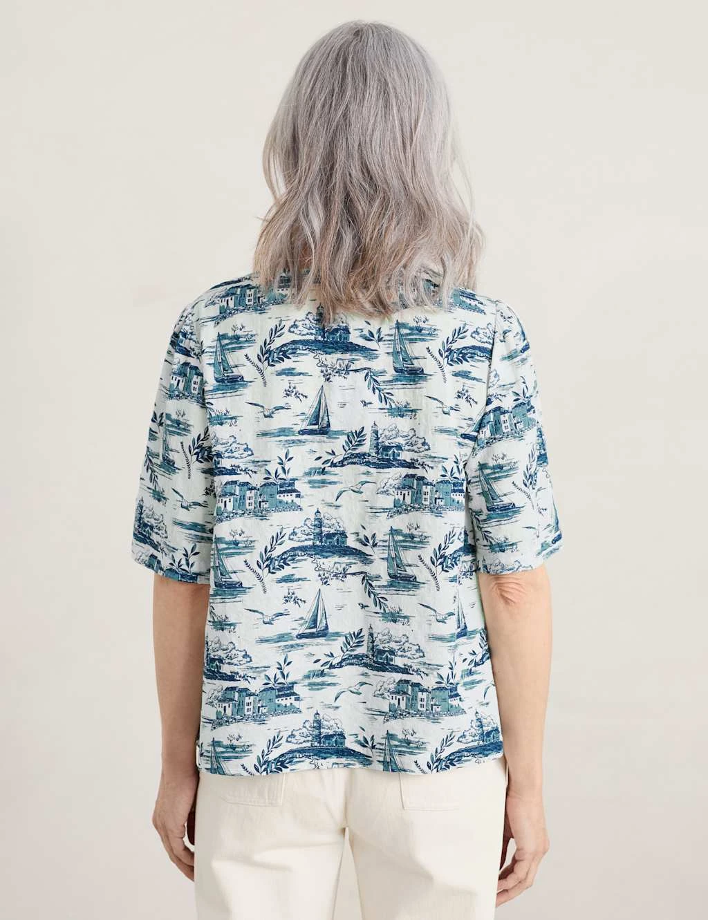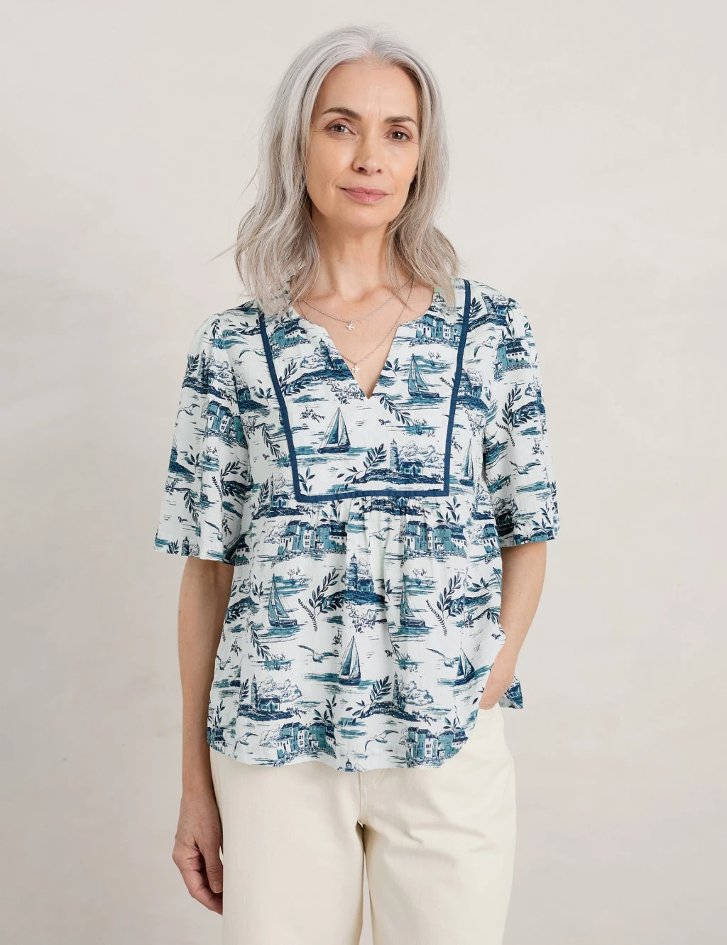 This cotton-rich blouse by Seasalt Cornwall captures a quintessential Cornish coastal scene. It’s cut in an easy regular fit, with soft gathers through the front emphasising its drapey shape. The v-neckline is beautifully framed by squared ribbon trims. Subtle pleats at the shoulders add floaty movement to the short sleeves.