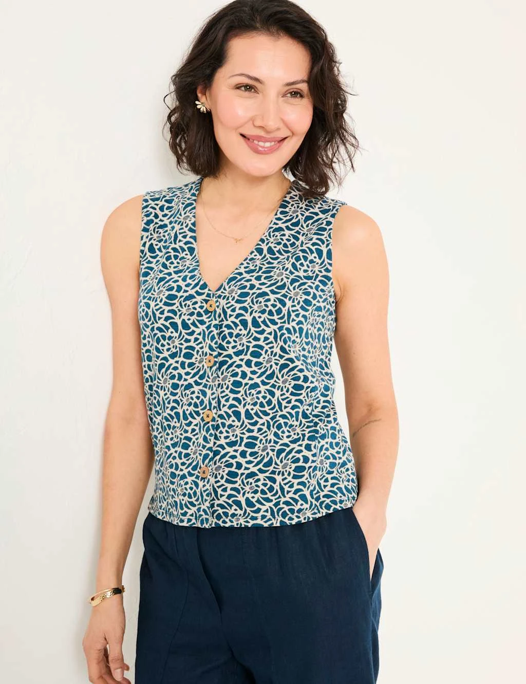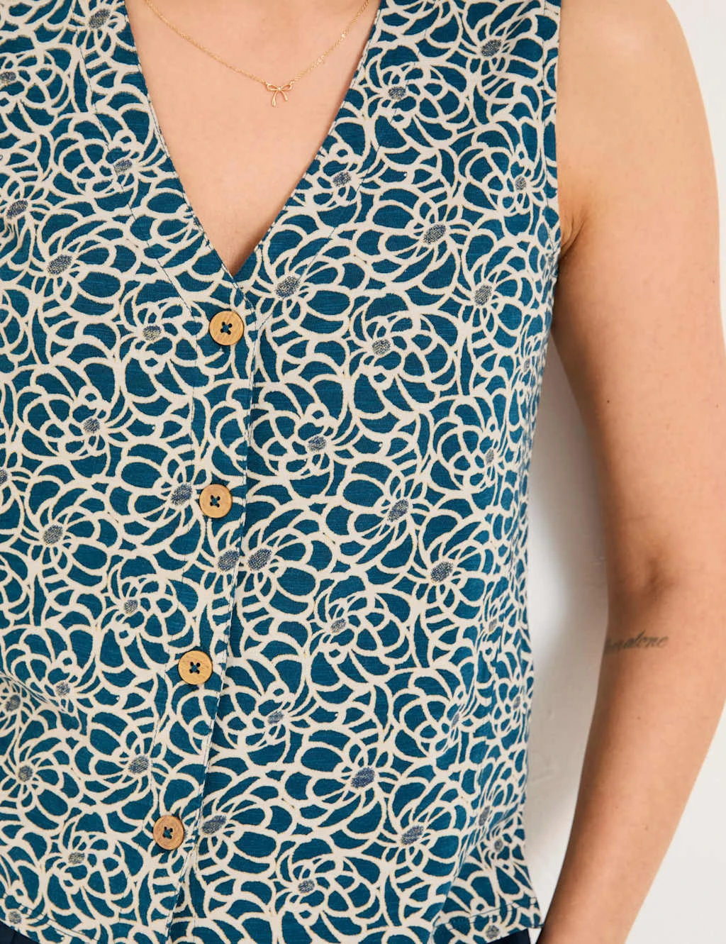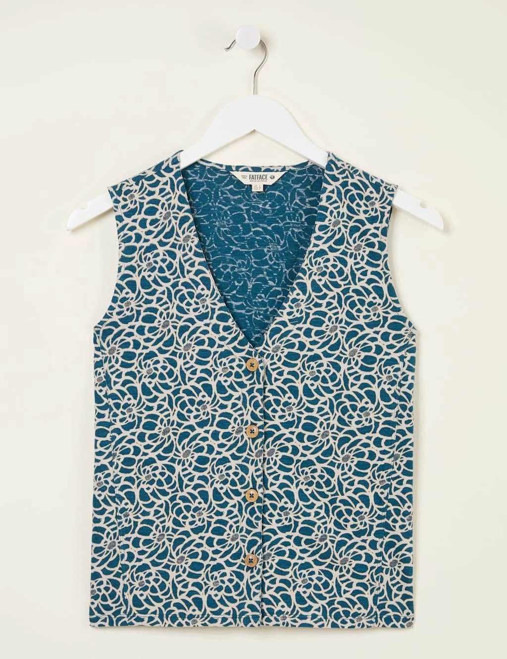 Add stylish print to outfits with this cotton-rich waistcoat from FatFace. It’s designed in an easy regular fit with a wooden button-through front. A flattering V-neckline and the sleeveless style make it a versatile piece for easy layering.