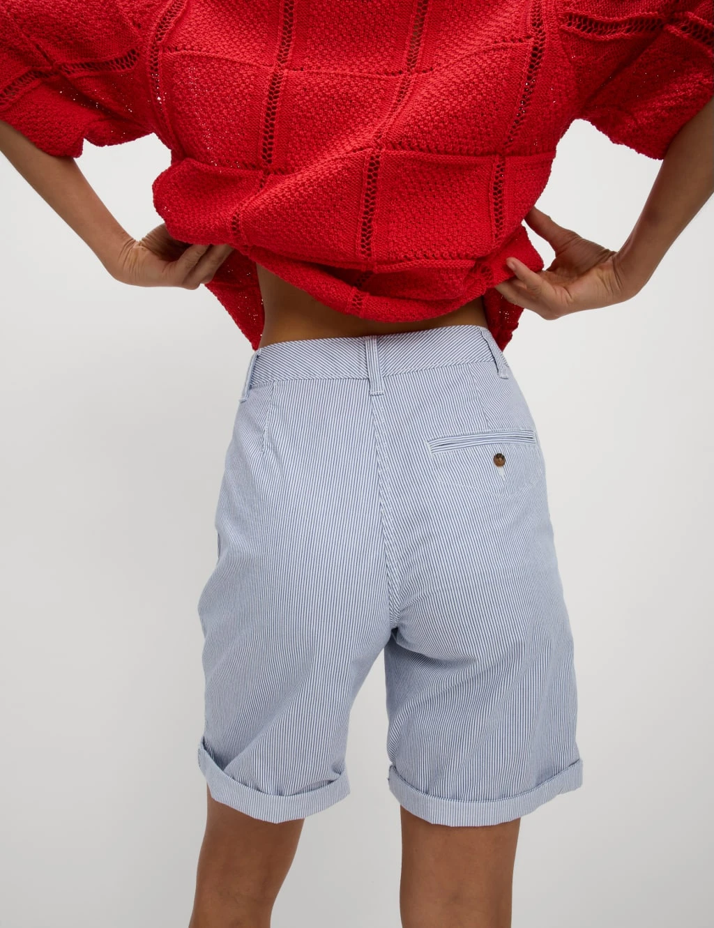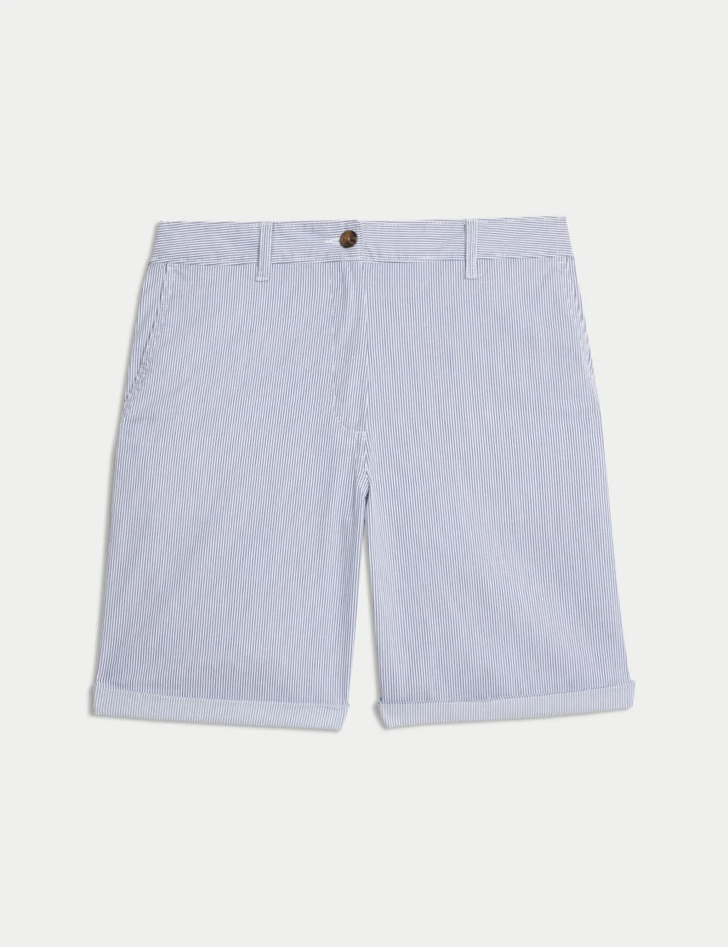 Create an effortlessly stylish summer look with these striped cotton-rich chino shorts. Made with added stretch for a flexible feel, this high-waisted design is cut in a comfy regular fit with a button and zip fastening. Two handy side pockets and a buttoned pocket at the back complete the look.