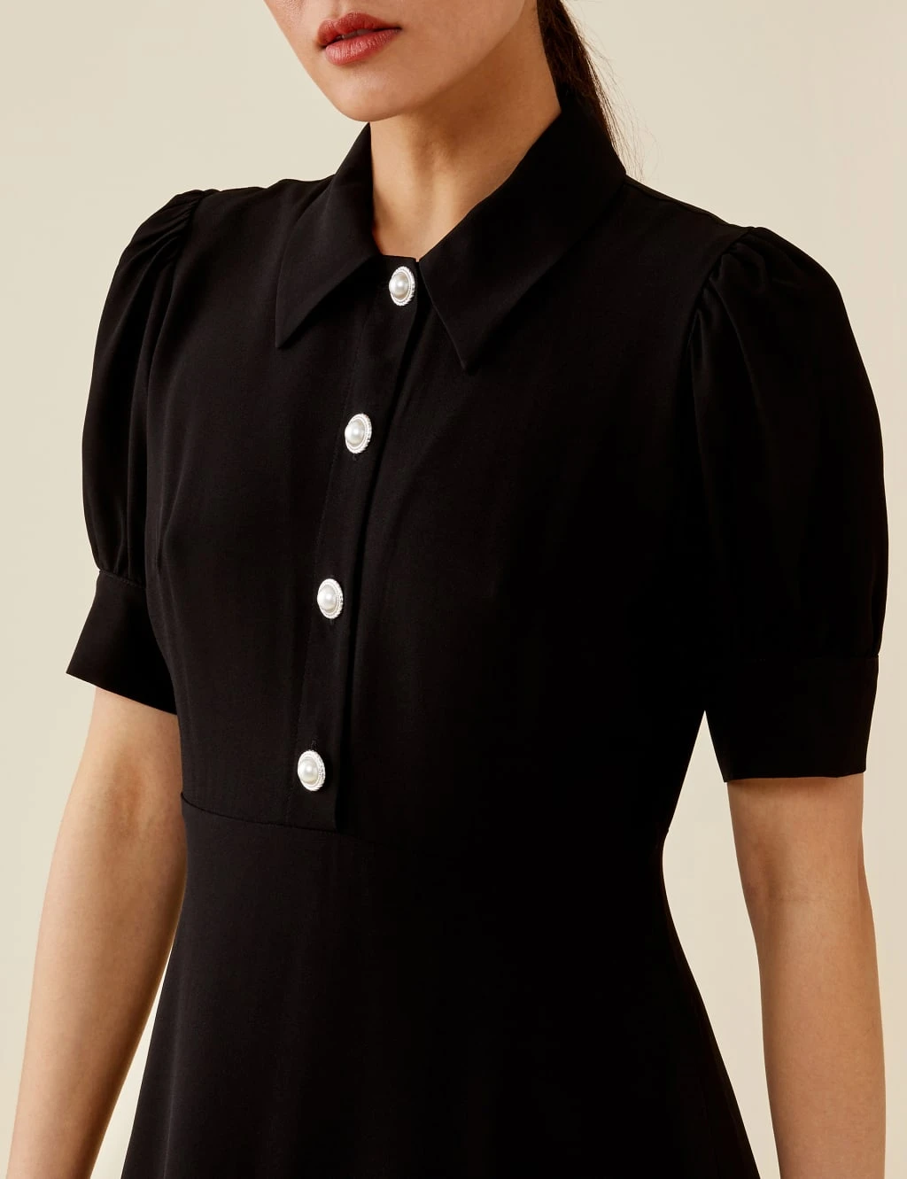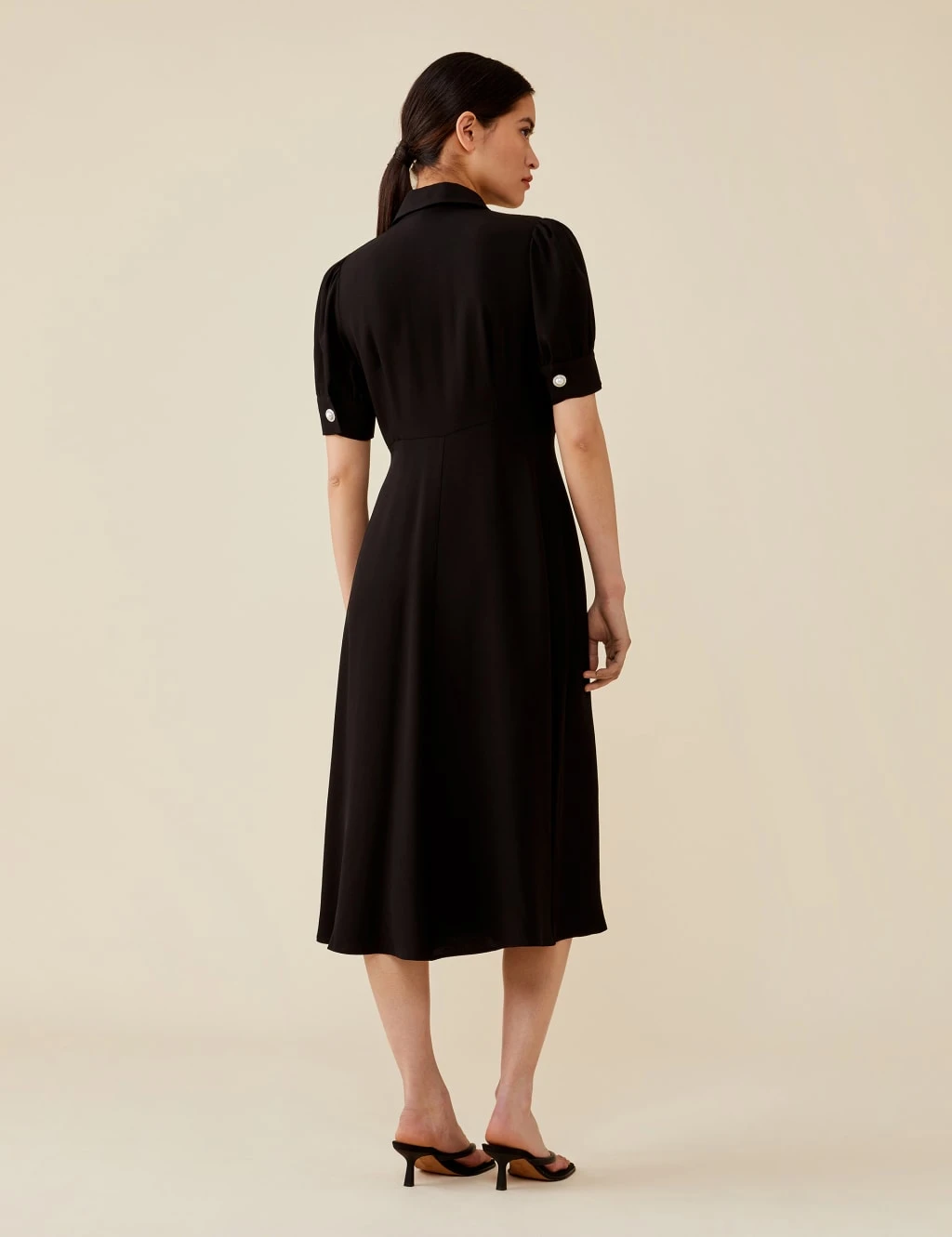This midi tea dress from Finery London will make a charming addition to your wardrobe. Cut to a flattering regular fit, it’s crafted from crepe fabric for an elegant drape. The stylish piece features short puff sleeves and a smart collared neck, plus oversized pearl button detailing with eye-catching metallic edges.