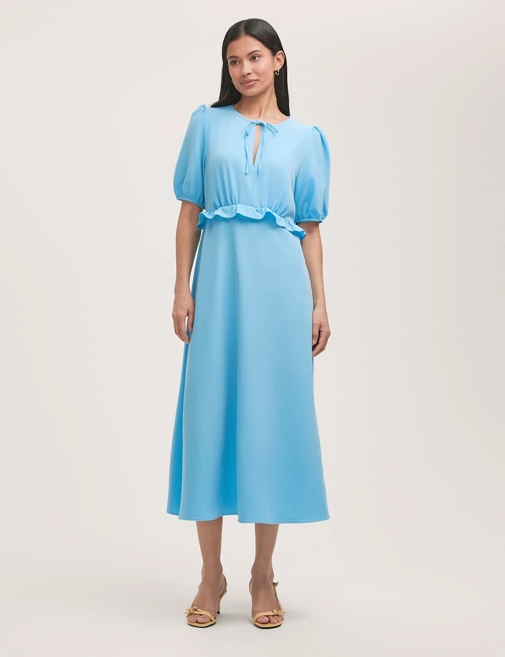 This Finery London tea dress is crafted from crepe fabric for a gorgeously drapey look. It’s cut in a comfy regular fit, with a frilled seam at the waist for a fitted silhouette. Short sleeves with gathered cuffs and a tie neckline add feminine detail. The hemline finishes at an on-trend midi length.