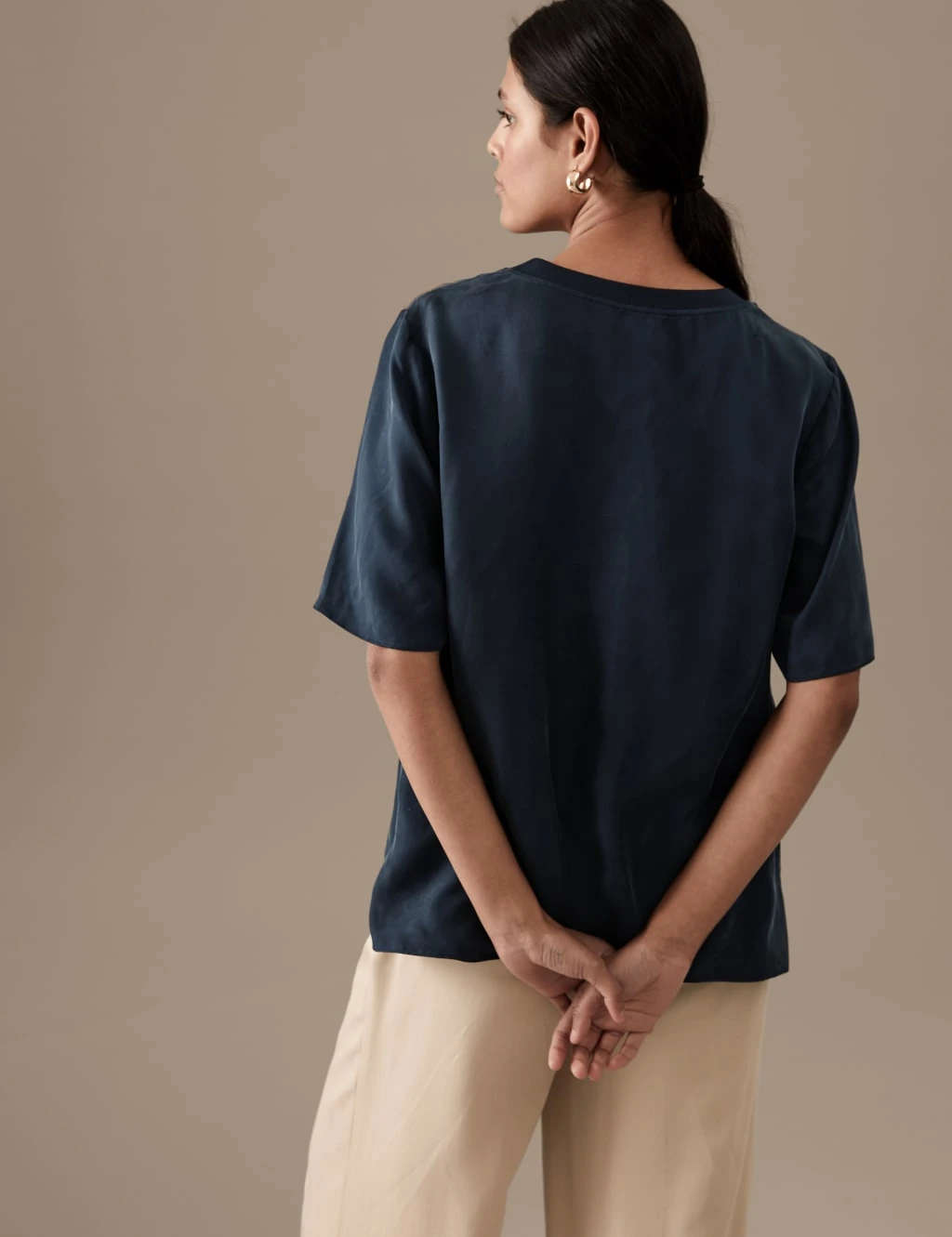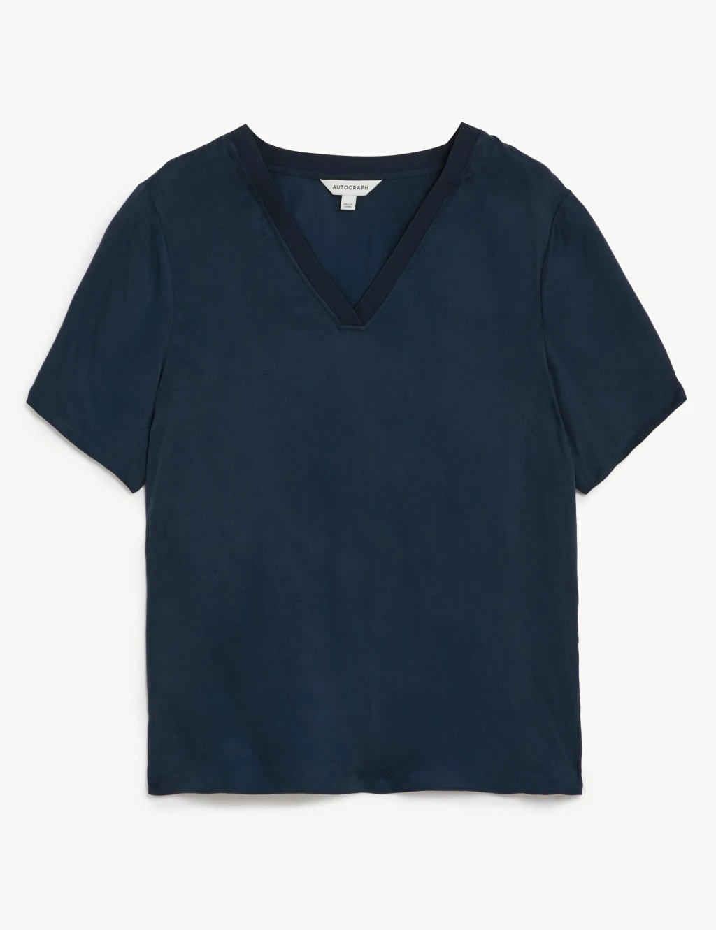 We’ve crafted this Autograph blouse using cupro-rich fabric for a luxurious, drapey feel. It has a regular fit with short sleeves for easy wear. A ribbed trim lines the v-neck for an extra dash of detail.