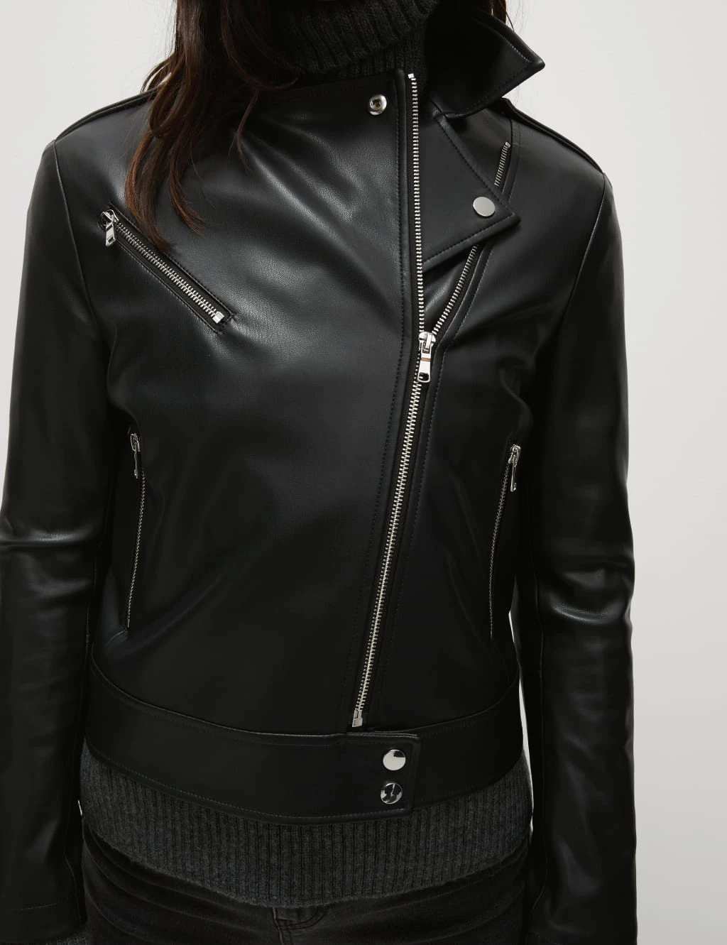 This jacket is crafted from supple faux leather for a contemporary biker look. It’s cut in a boxy regular fit, with epaulettes and an off-centre zip adding authentic styling. Poppers fasten the collar and waistband, while two zipped pockets provide a secure space for your belongings. This piece is complete with a full lining for a smooth feel. M&S Collection: easy-to-wear wardrobe staples that combine classic and contemporary styles.