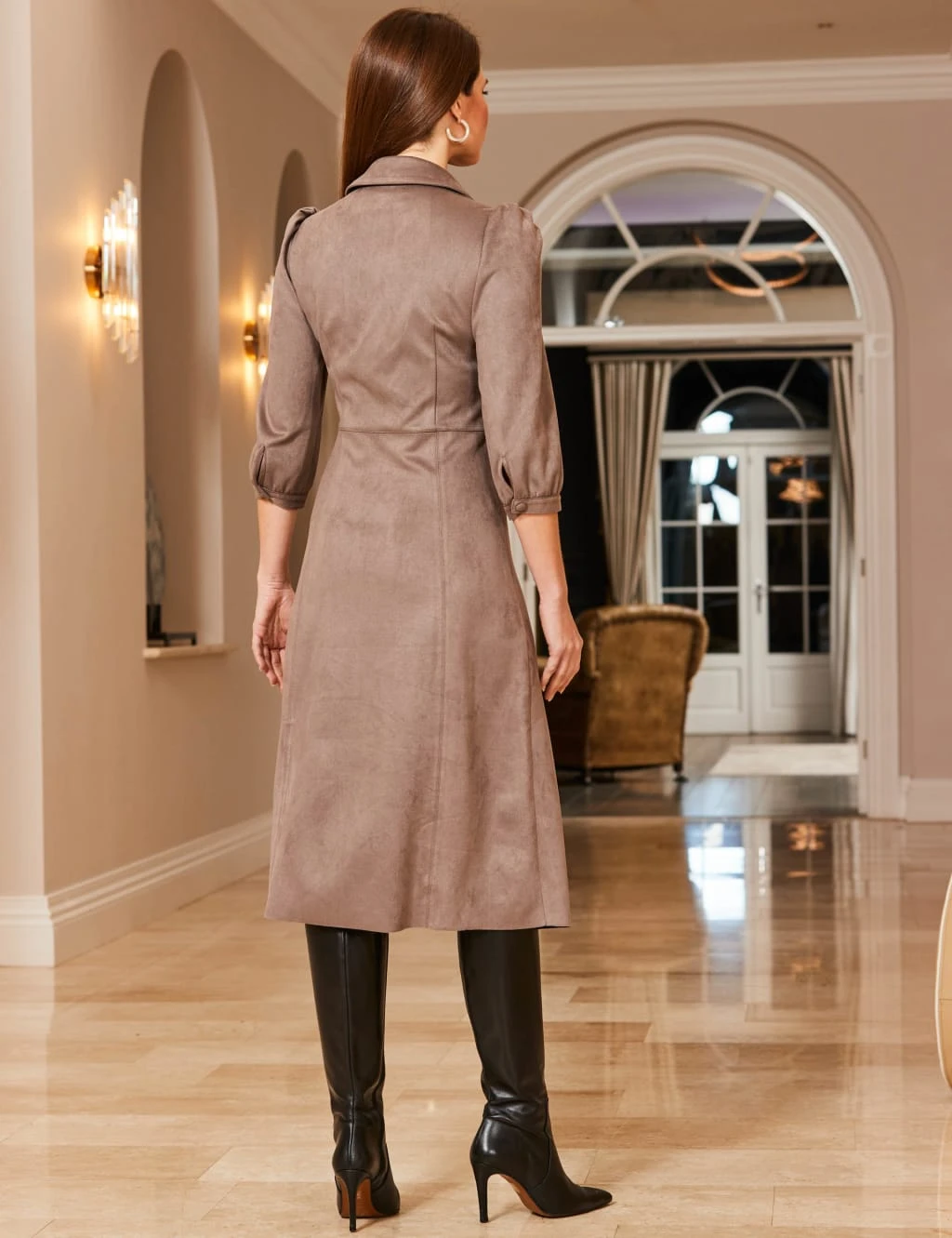 Soft faux suede lends a sumptuously smooth texture to this Sosandar shirt dress. It’s designed in a regular fit, with seam details through the front for subtle shaping. Covered buttons, a collared neckline and three-quarter blouson sleeves deliver stylish sophistication. A split opening at the midi-length hem ensures easy movement.