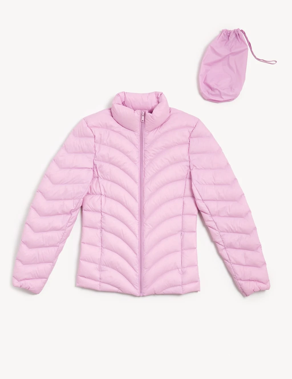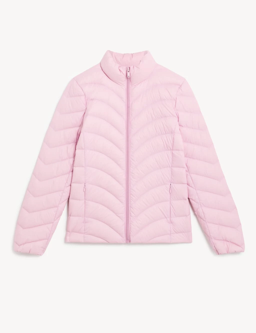 Keep out the cold with this naturally warm and breathable feather and down puffer jacket. It has a regular fit, with a practical front zip fastening. Lightweight fabric keeps you cosy without weighing you down for easy layering. We’ve crafted it with a funnel neck and chevron quilting for a contemporary look. A water-repellent Stormwear™ coating protects against showers, while elasticated cuffs lock in heat. Zip-up pockets offer a safe place to store essentials. Plus, it packs away neatly into its own bag. Made with recycled nylon.