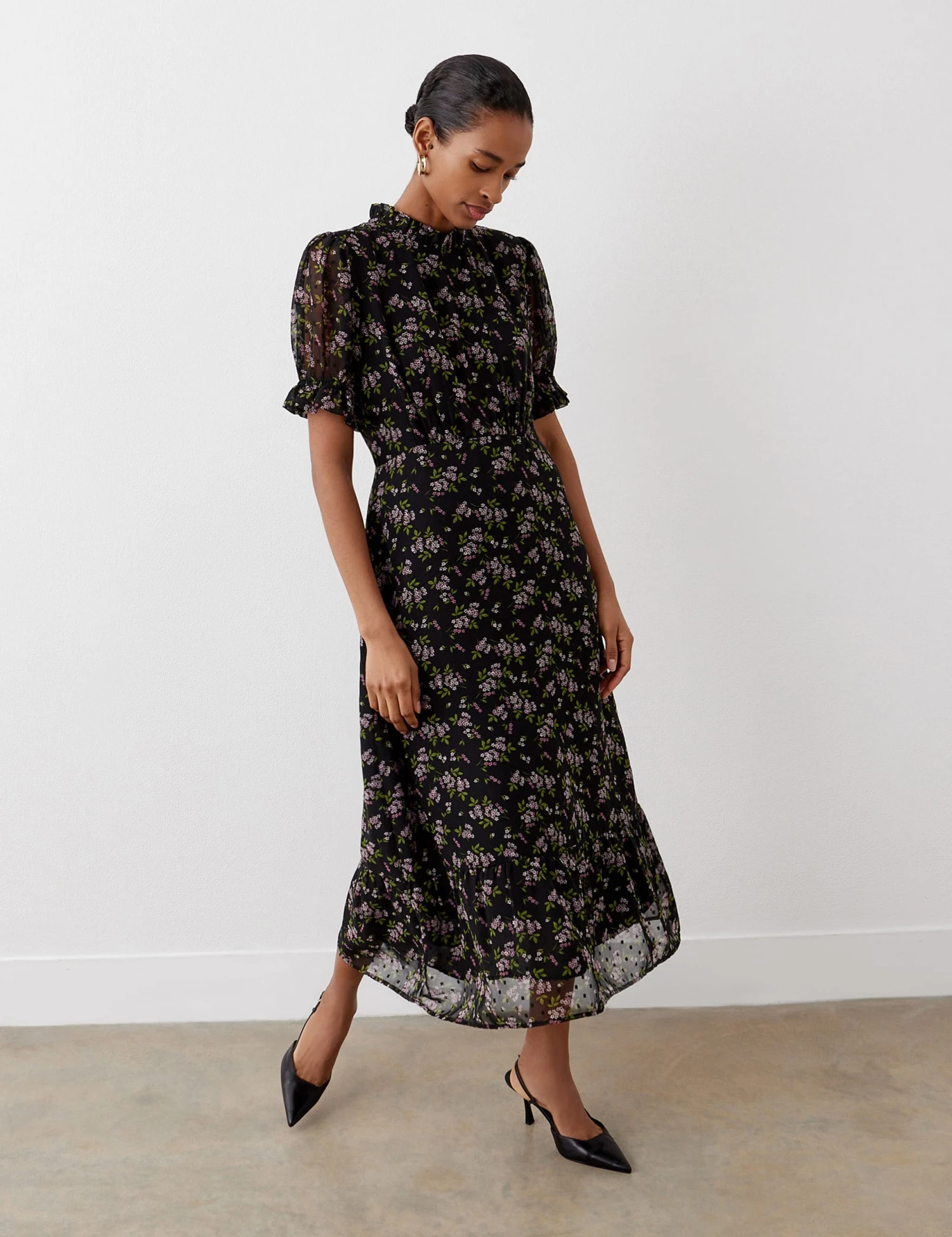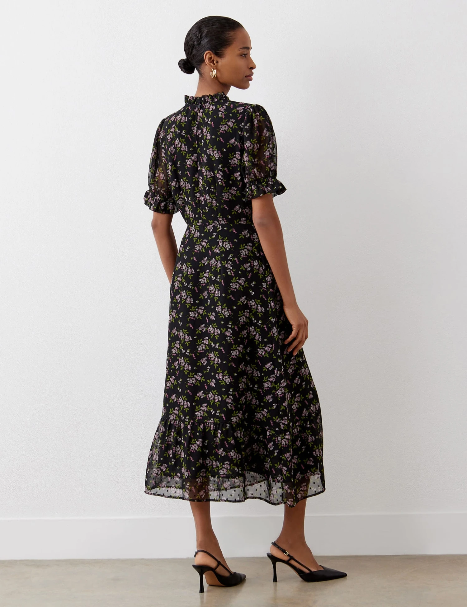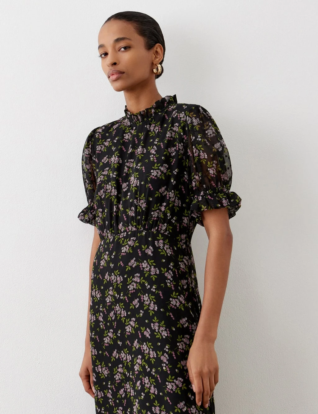 Bring a romantic feel to your daywear with this floral tea dress from Finery London. It’s cut to a comfy regular fit, with a stand frill at the crew neckline and short puff sleeves. The midi-length hemline is finished with a deep ruffle to create fluttery movement. This piece is lined for comfort and coverage.