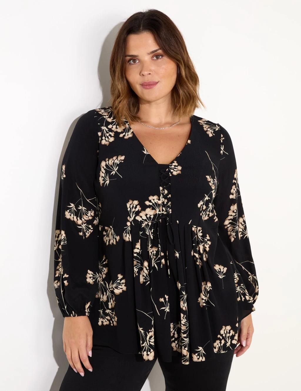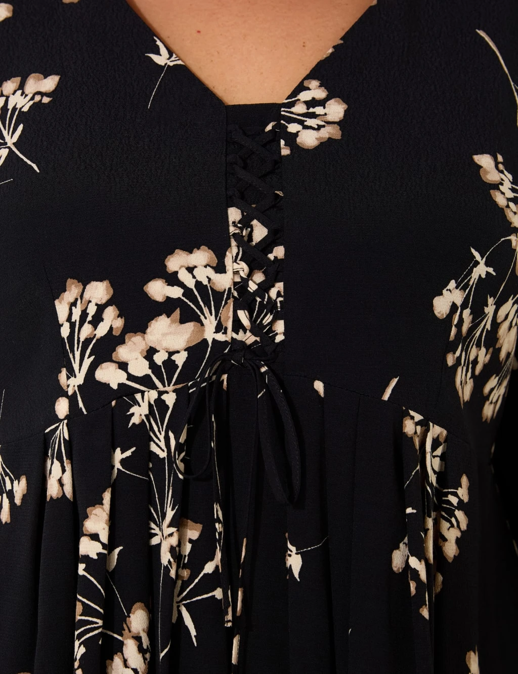 Opt for a feminine look with this floral print blouse from Live Unlimited London. It’s cut in an easy regular fit, with pleated detailing for a flattering shape. The V-neckline and lace-up front add elegant touches. This versatile piece is complete with voluminous cuffed long sleeves.