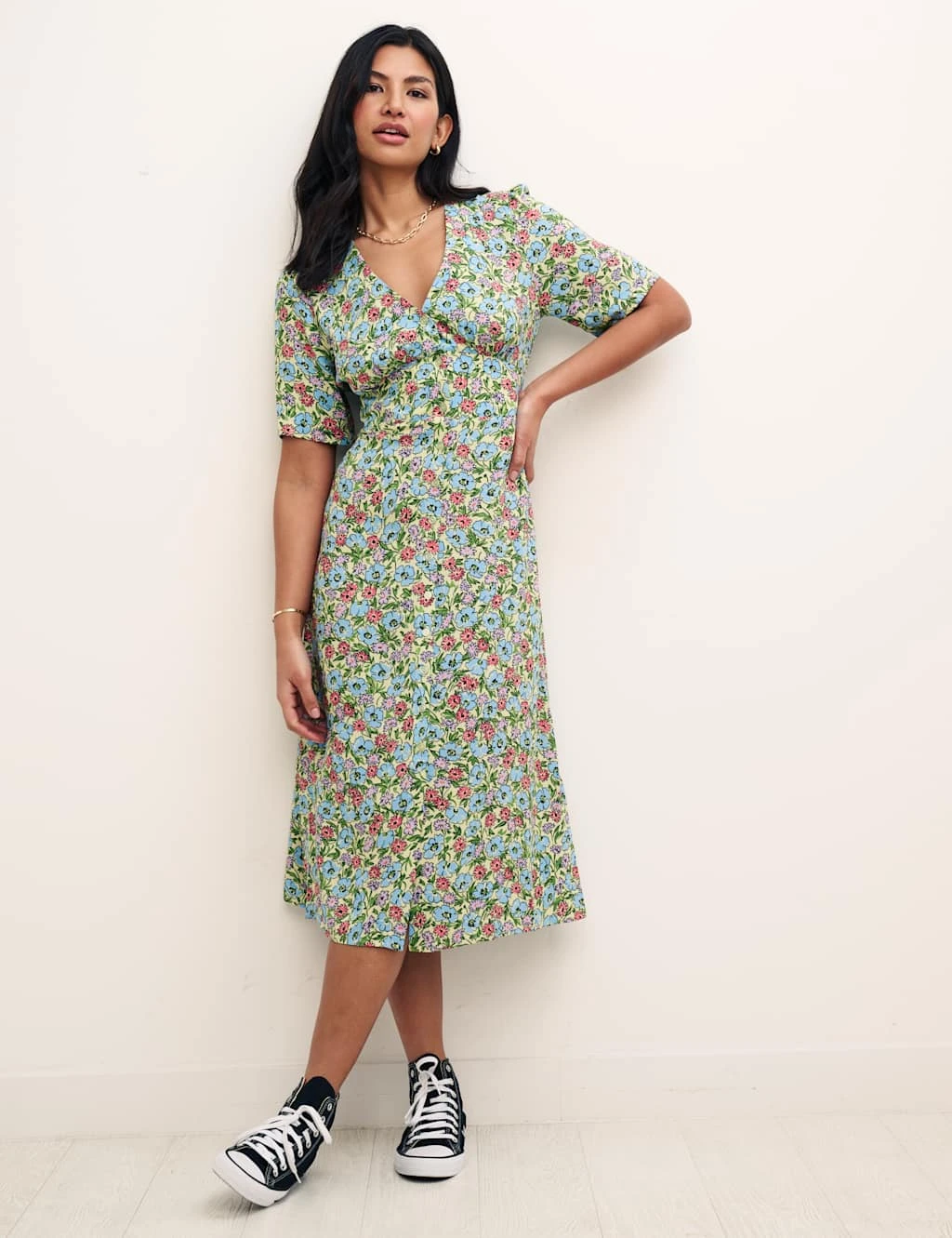 Bring a floral flourish to your look with this printed tea dress by Nobody’s Child. It’s fitted through the body, with elasticated shirring at the back and a flowy midi hem for a flattering silhouette. Buttons through the front, a v-neckline and short sleeves complete the feminine look.
