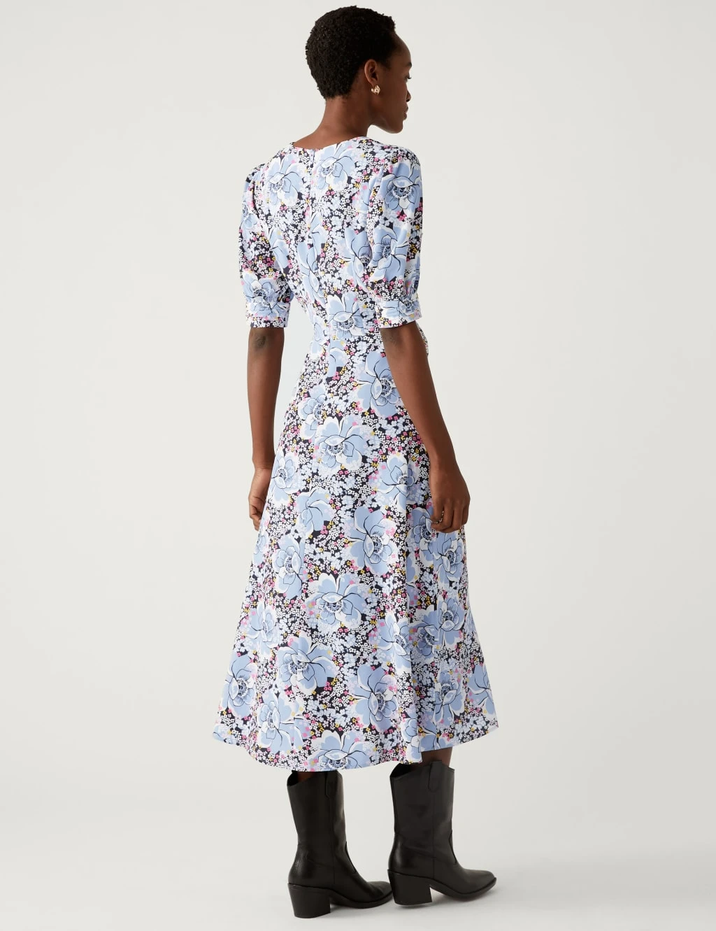 This occasion-ready floral tea dress hits all the right style notes. It’s cut in a regular fit with a flattering v-neck and back button fastening. Short puff sleeves add feminine detail, while the gathered waist creates an elegant silhouette.