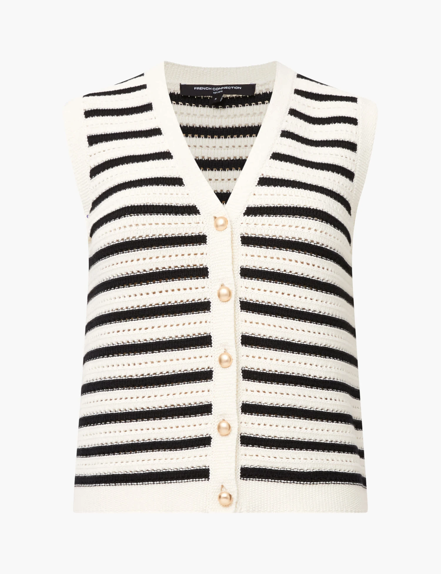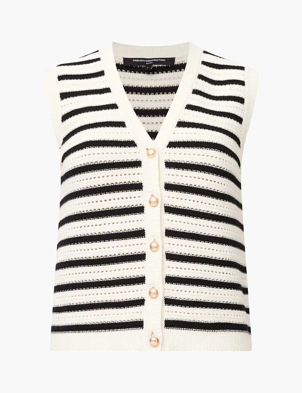 Get ready for warm-weather dressing with this knitted waistcoat from French Connection. It’s made in a regular fit, with lustrous pearly buttons adding pretty detail to the placket below the v-neckline. Horizontal stripes bring a classic nautical-inspired feel, with textured and open stitches creating a tactile look.