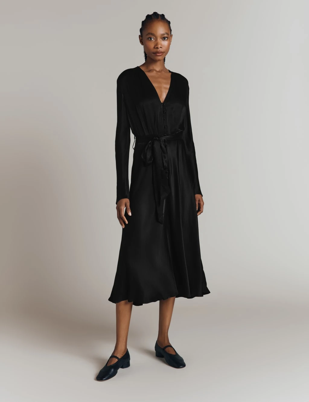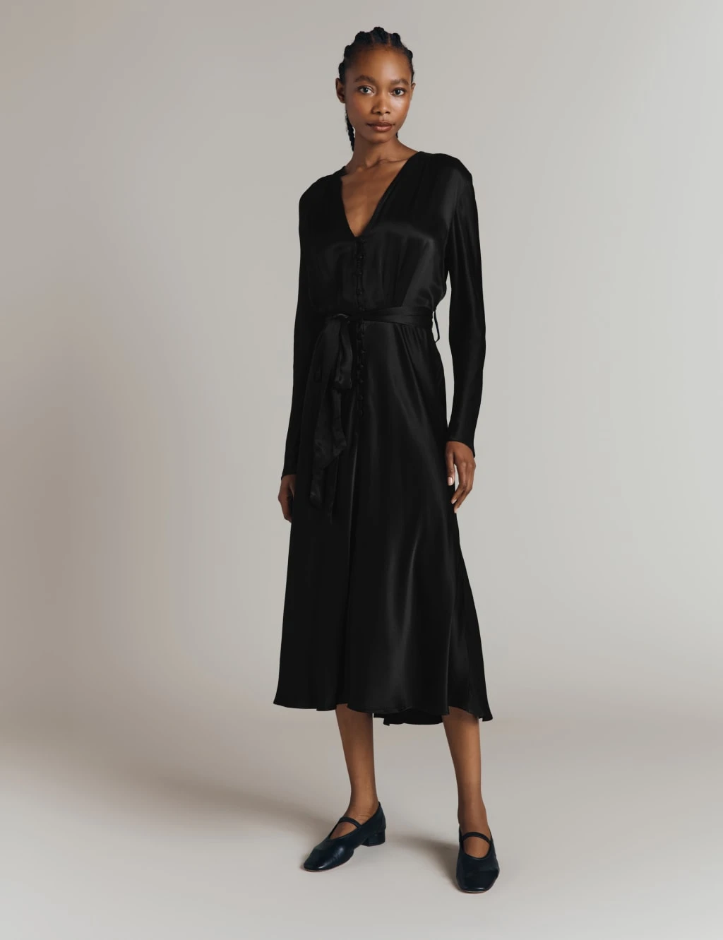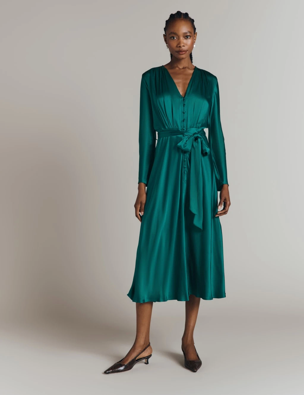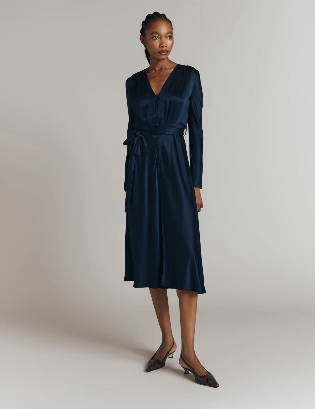 Bring a touch of luxe to your wardrobe with this satin midi dress from Ghost. It’s cut in a comfy regular fit, with a flattering v-neckline and a buttoned front. A self-tie belt cinches your figure and completes the look.