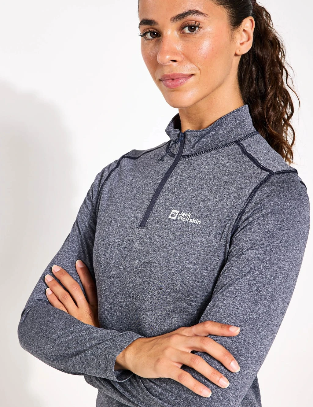 Outdoor adventures call for this thermal base layer from Jack Wolfskin. The long-sleeved top is made in a fitted cut and features a brushed interior that feels soft against your skin. Its snug funnel neck is complete with a convenient half zip. Advanced fabric technology ensures efficient moisture management, keeping you dry and comfortable even during intense activity.