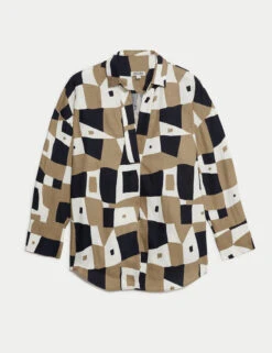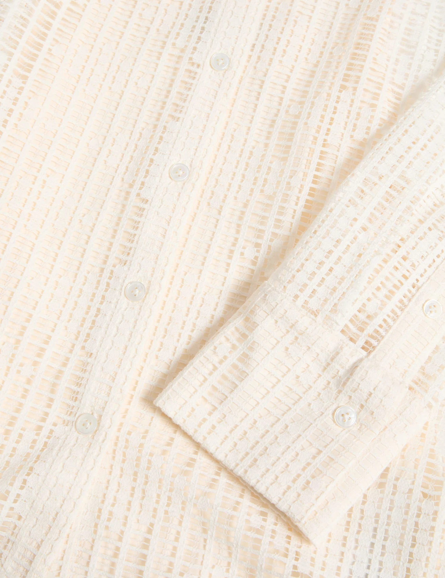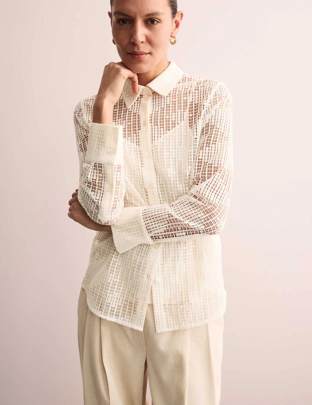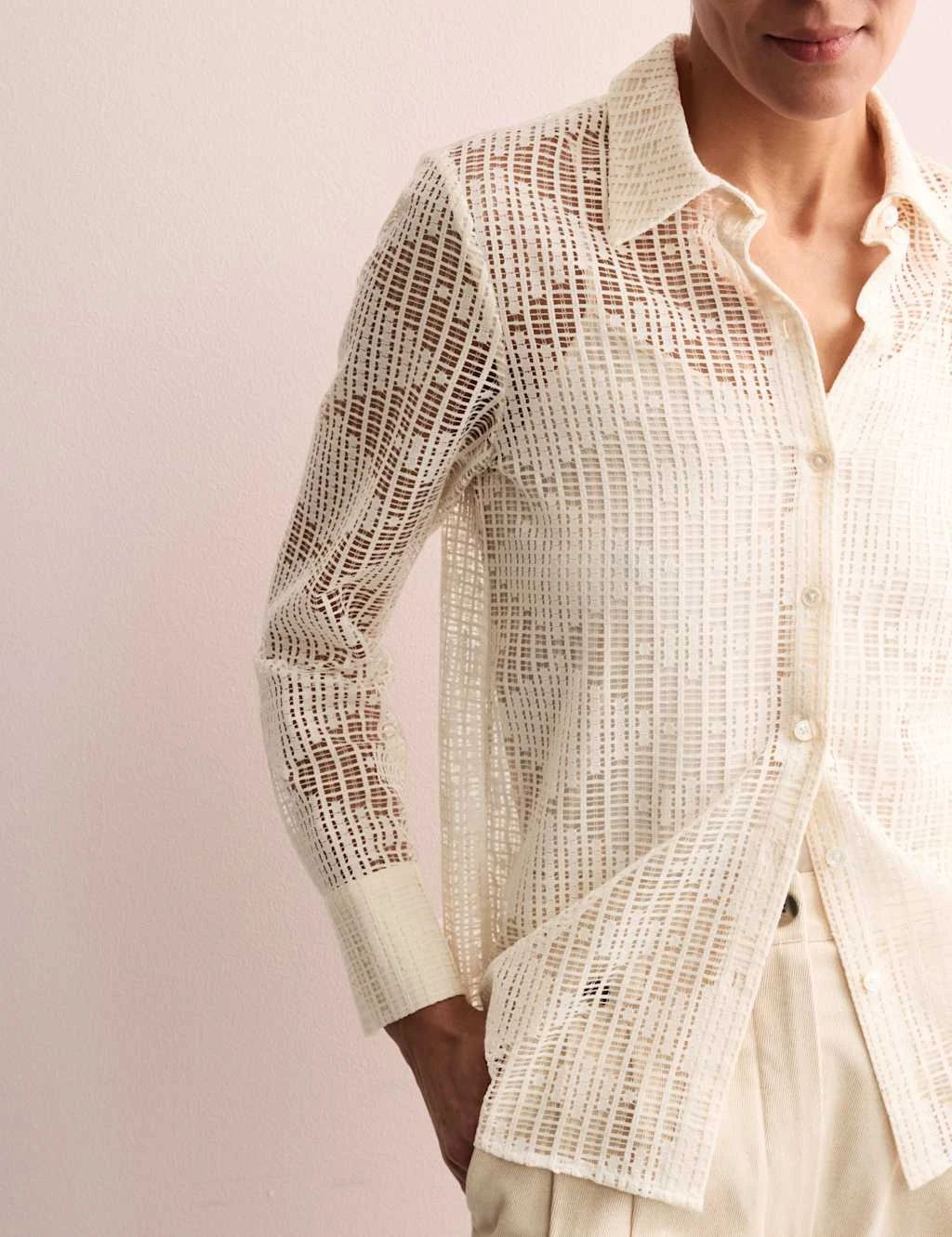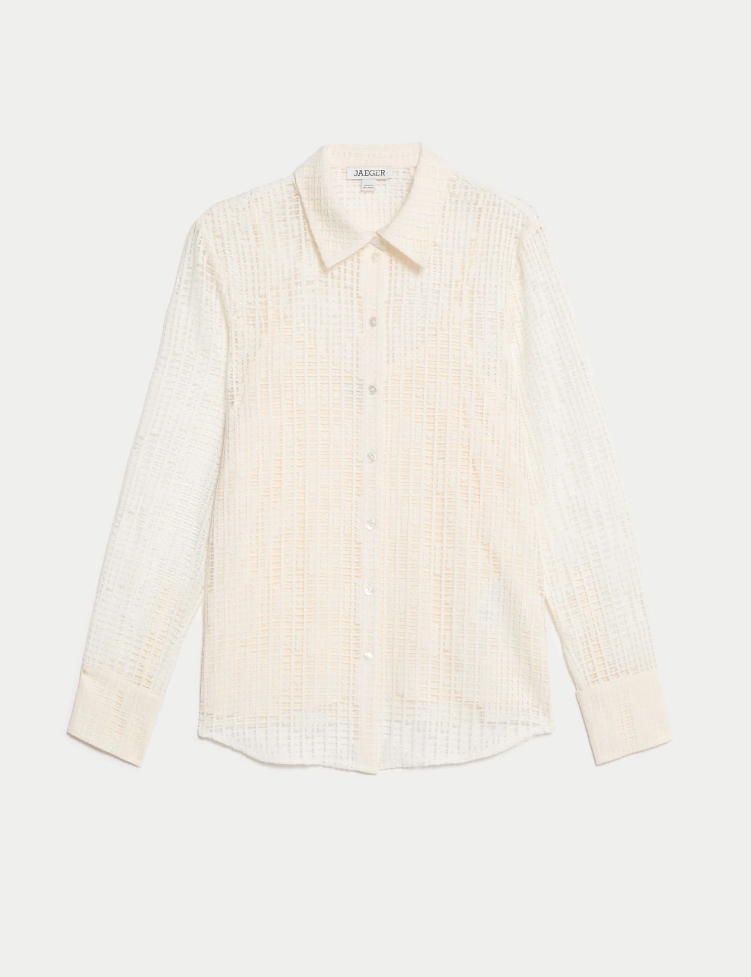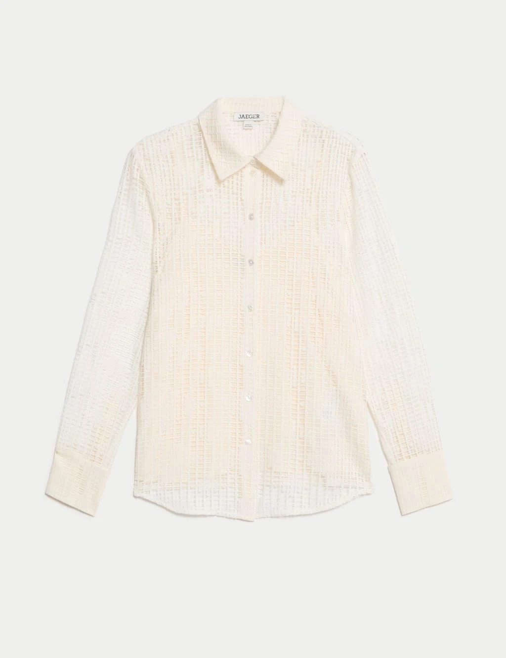 This cotton-rich diamond lace shirt from Jaeger brings a fresh feel to ensembles. Designed in a regular fit, this piece presents a classic collared neckline and button-through fastenings. Wear with wide-legged trousers for a dressed-up daytime look.