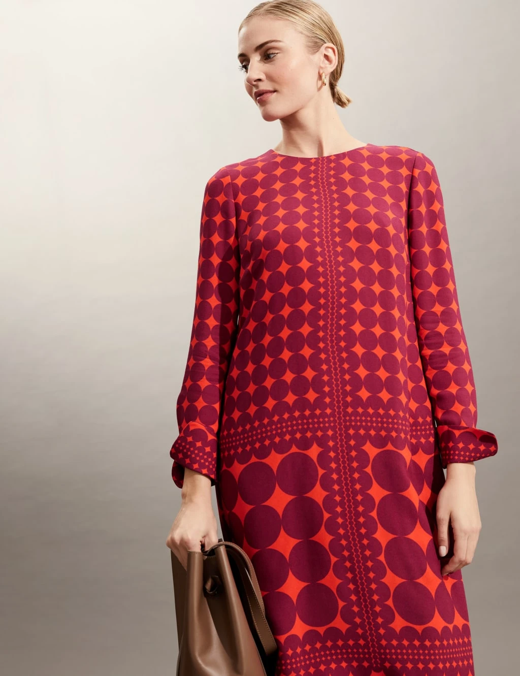 This dress from Jaeger has a striking geometric print that’s exclusive to the brand. It’s cut in a comfy regular fit, with a flowing shift silhouette that skims your figure. Long sleeves and a round neckline give an elegant look and the hemline sits at a versatile knee length. Team with heels for an effortless evening ensemble.