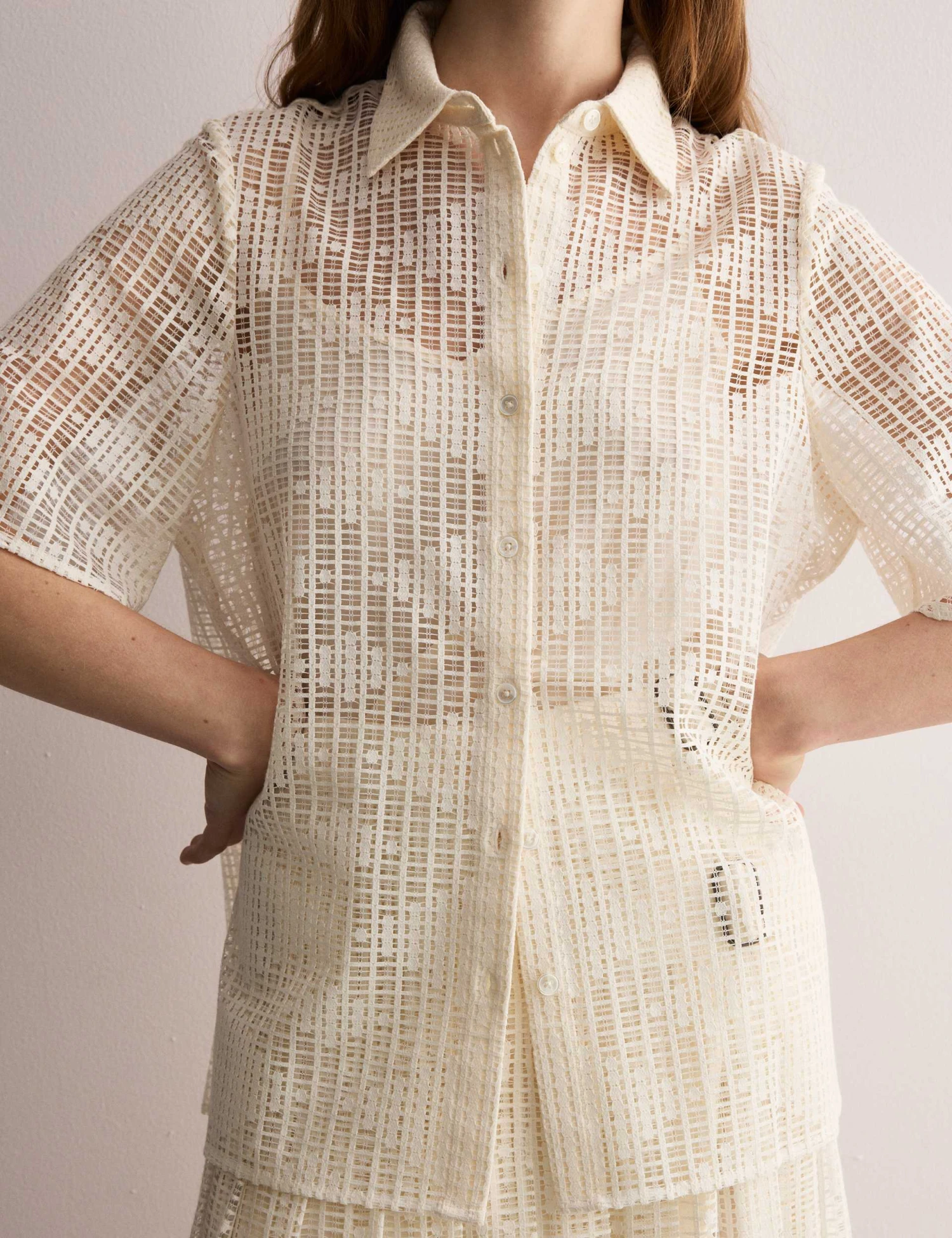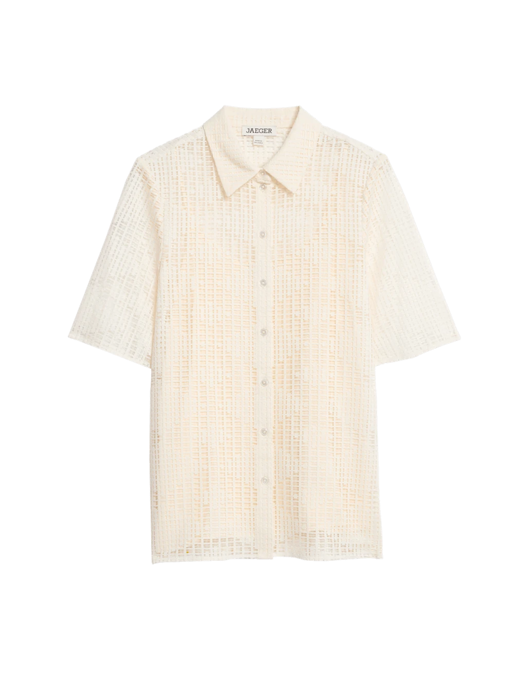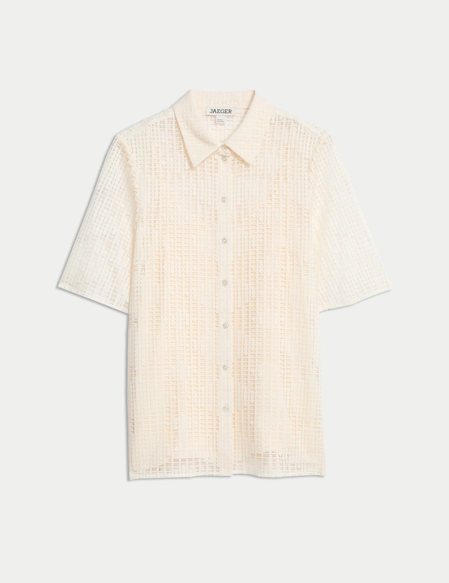 Sheer lace fabric gives this Jaeger shirt a feminine and romantic look. It’s designed in a classic regular fit with a smart collared neckline. The short sleeves make it an ideal choice for warm-weather outings, while the interior cami top provides elegant coverage.