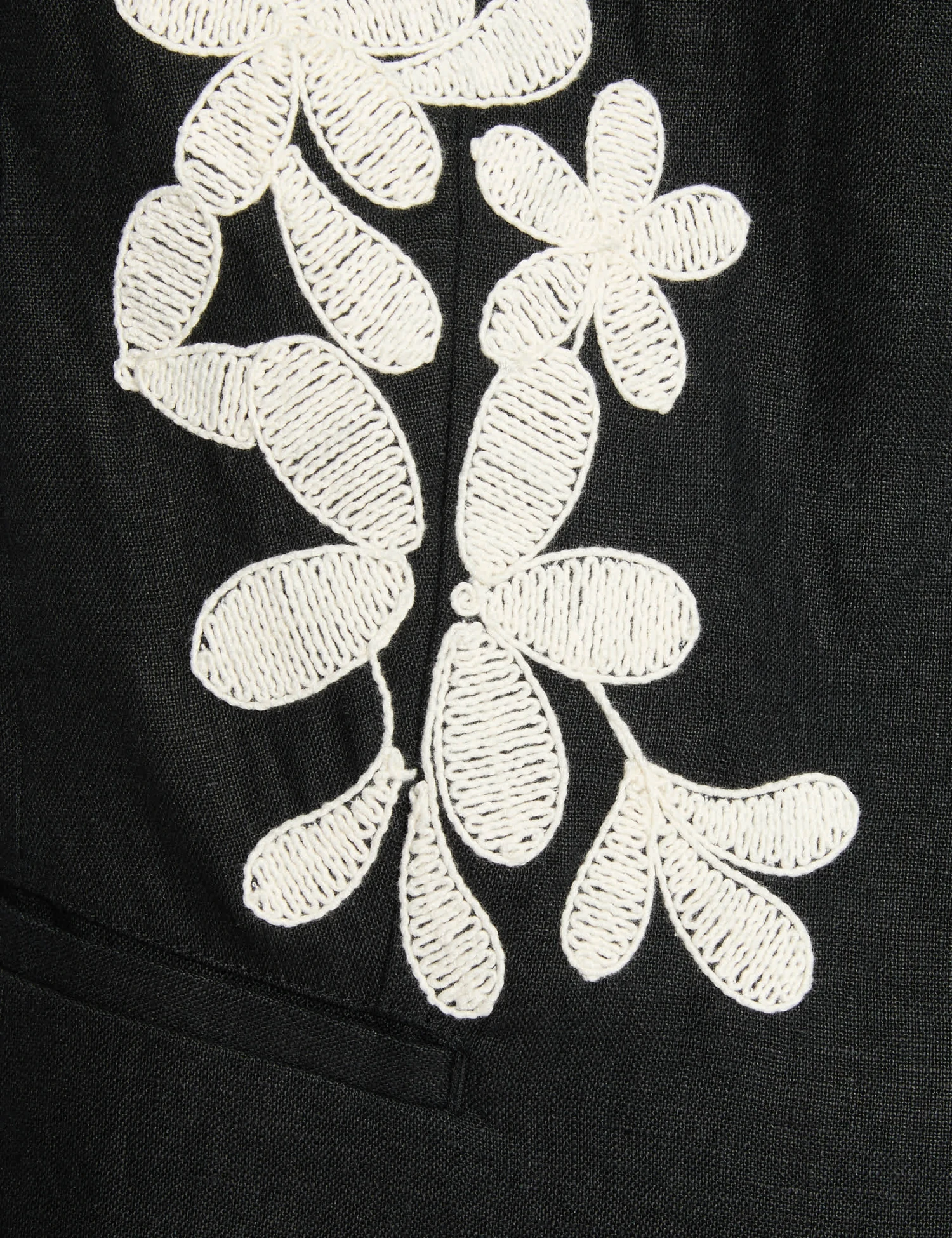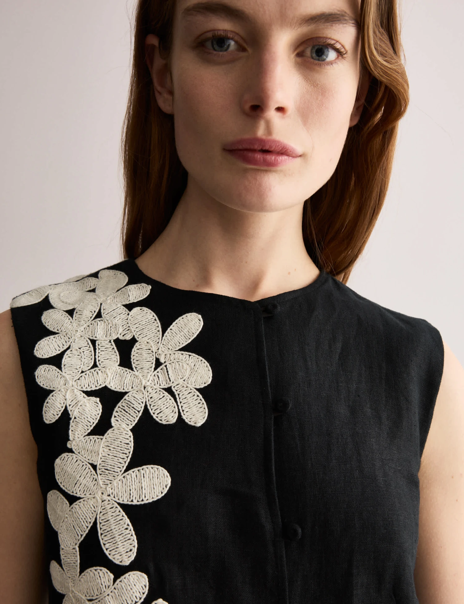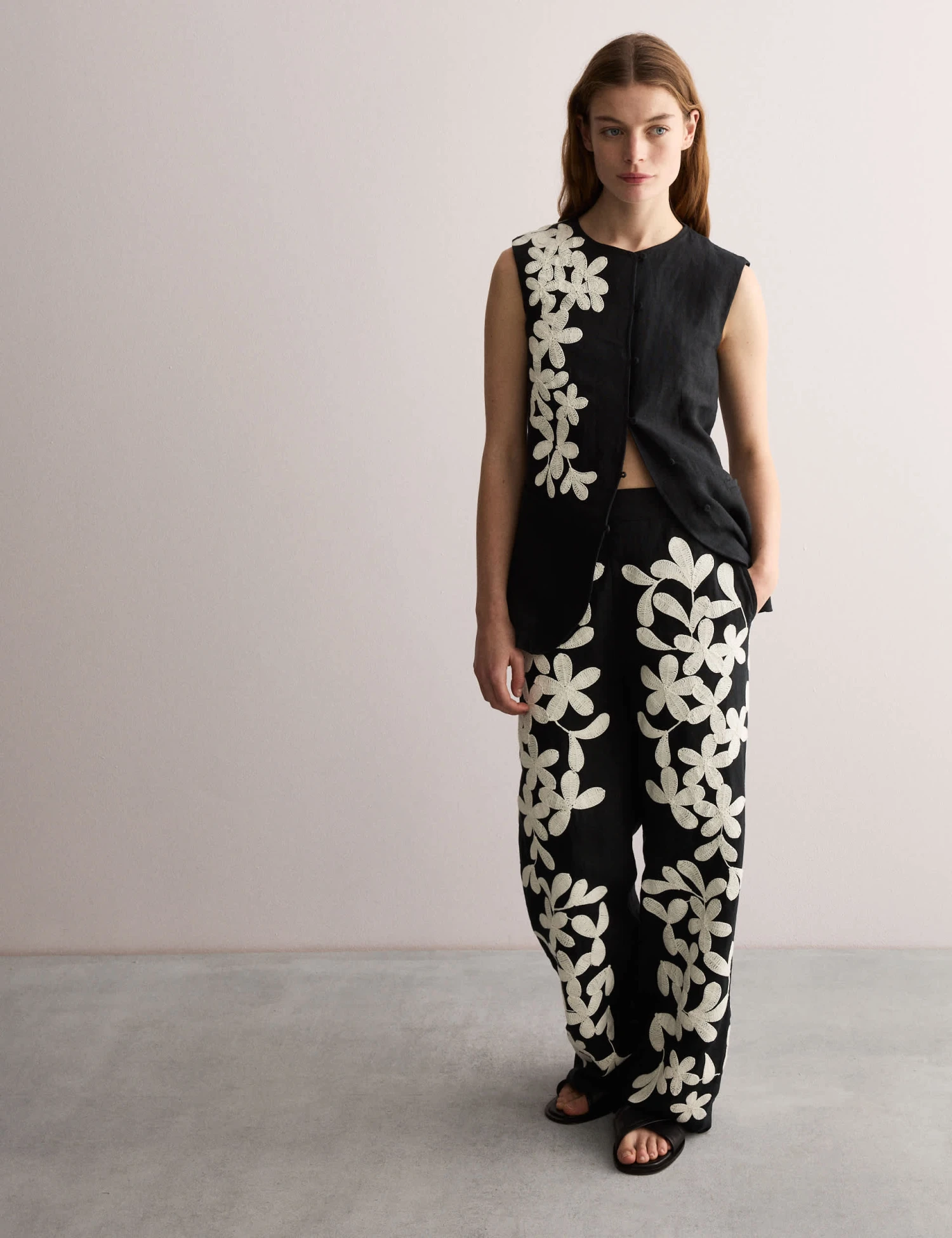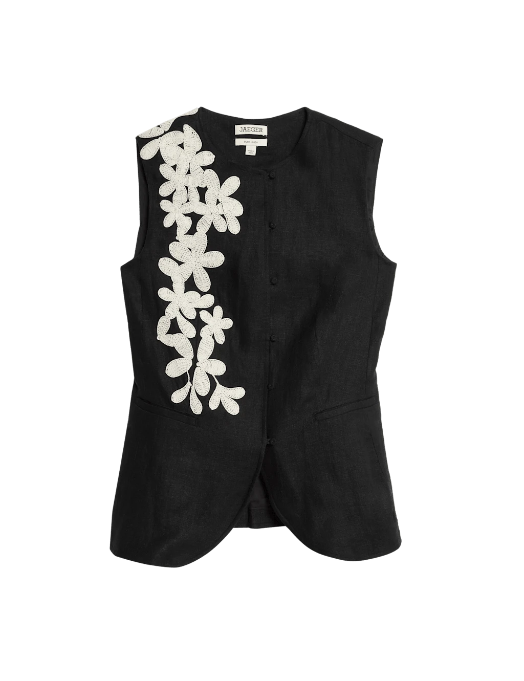 Bring an elevated touch to your wardrobe with this pure linen waistcoat by Jaeger. The elegant style is made in a regular fit with a crew neckline and self-covered buttons through to the curved longline hem. Placement floral embroidery creates a standout look. Complete the ensemble with the co-ordinating trousers.