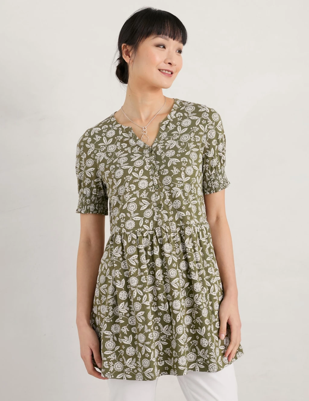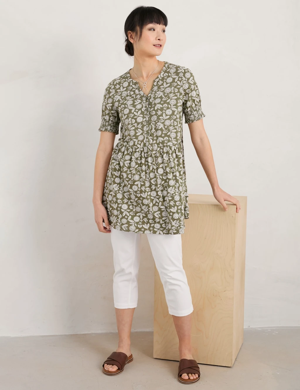 This organic cotton jersey tunic by Seasalt Cornwall brims with pretty details. It’s cut to a regular fit, with gentle gathering at the waist for easy-wearing comfort. A notch neckline gives way to a front button fastening, lending a neat look to the piece. All-over dainty florals and frills on the short sleeves add to its romantic appeal.
