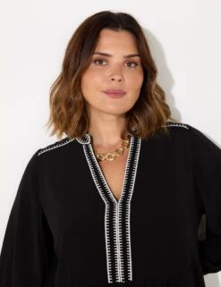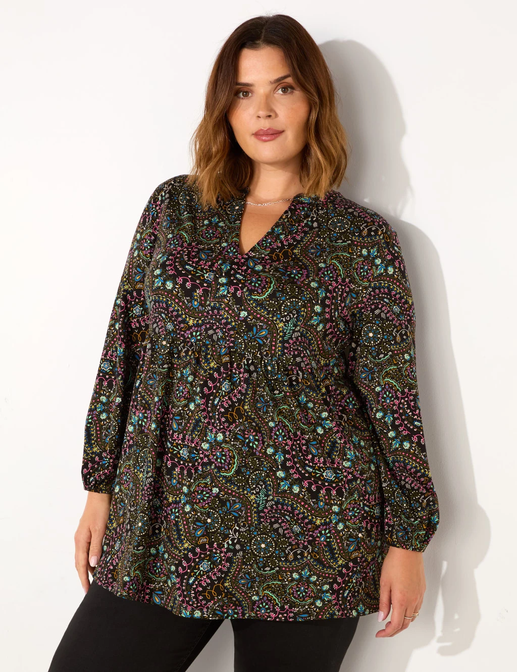 The vibrant paisley print of this jersey tunic by Live Unlimited London will add a burst of colour to your outfits. It’s cut in a regular fit, with a feminine v-neckline at the Nehru collar. Gathering at the bust creates a floaty hemline, to complement the long full sleeves.