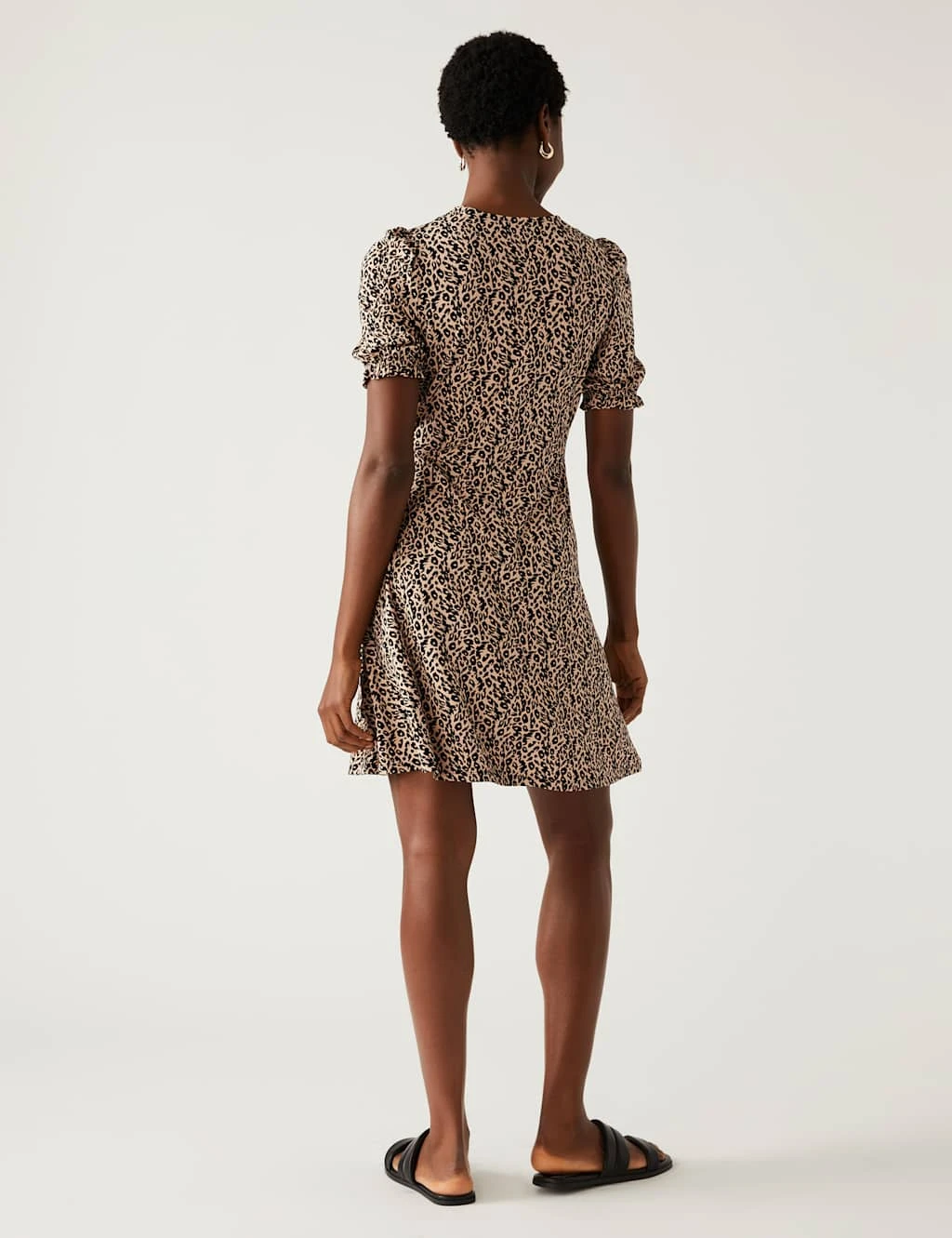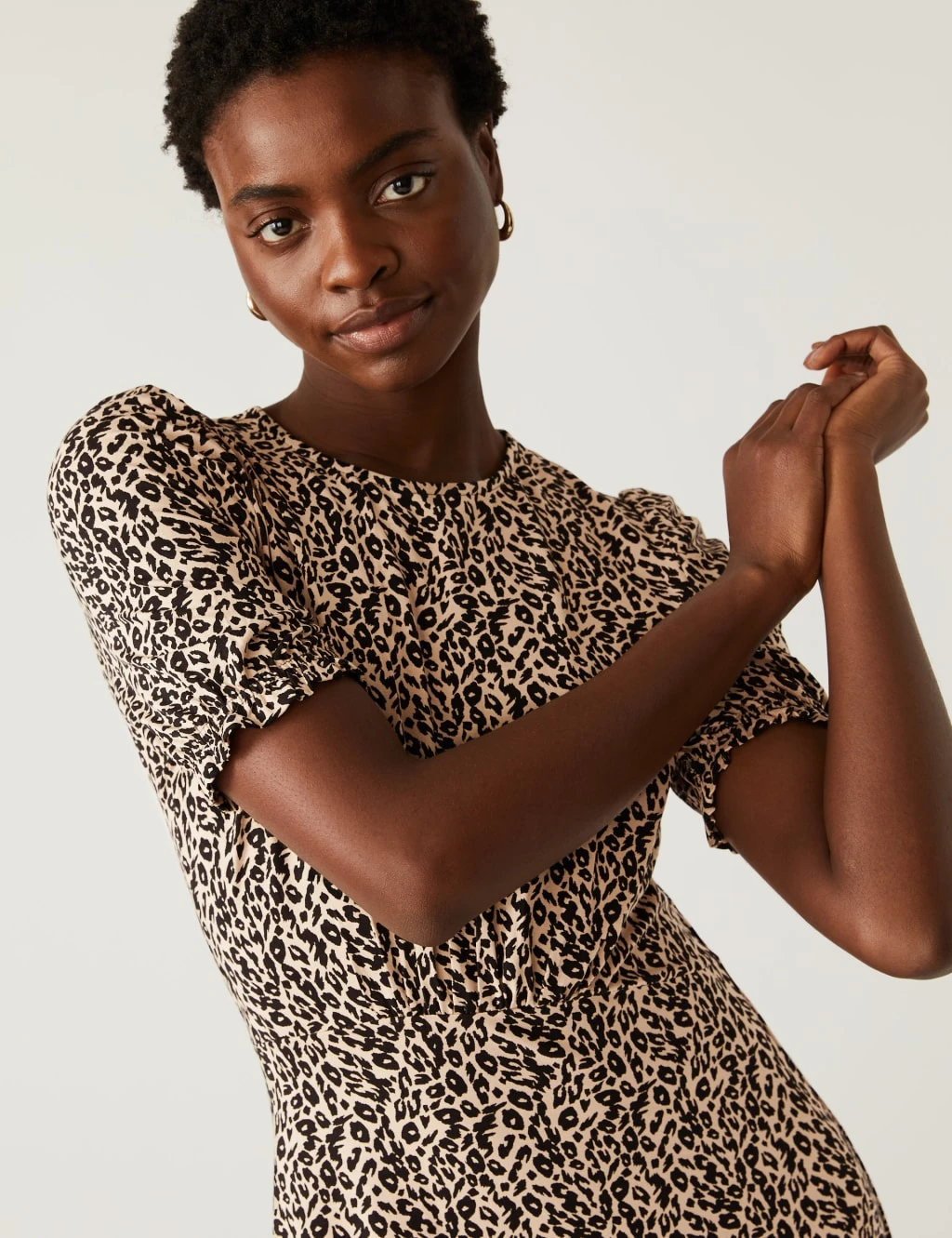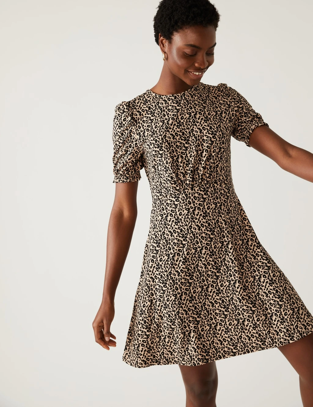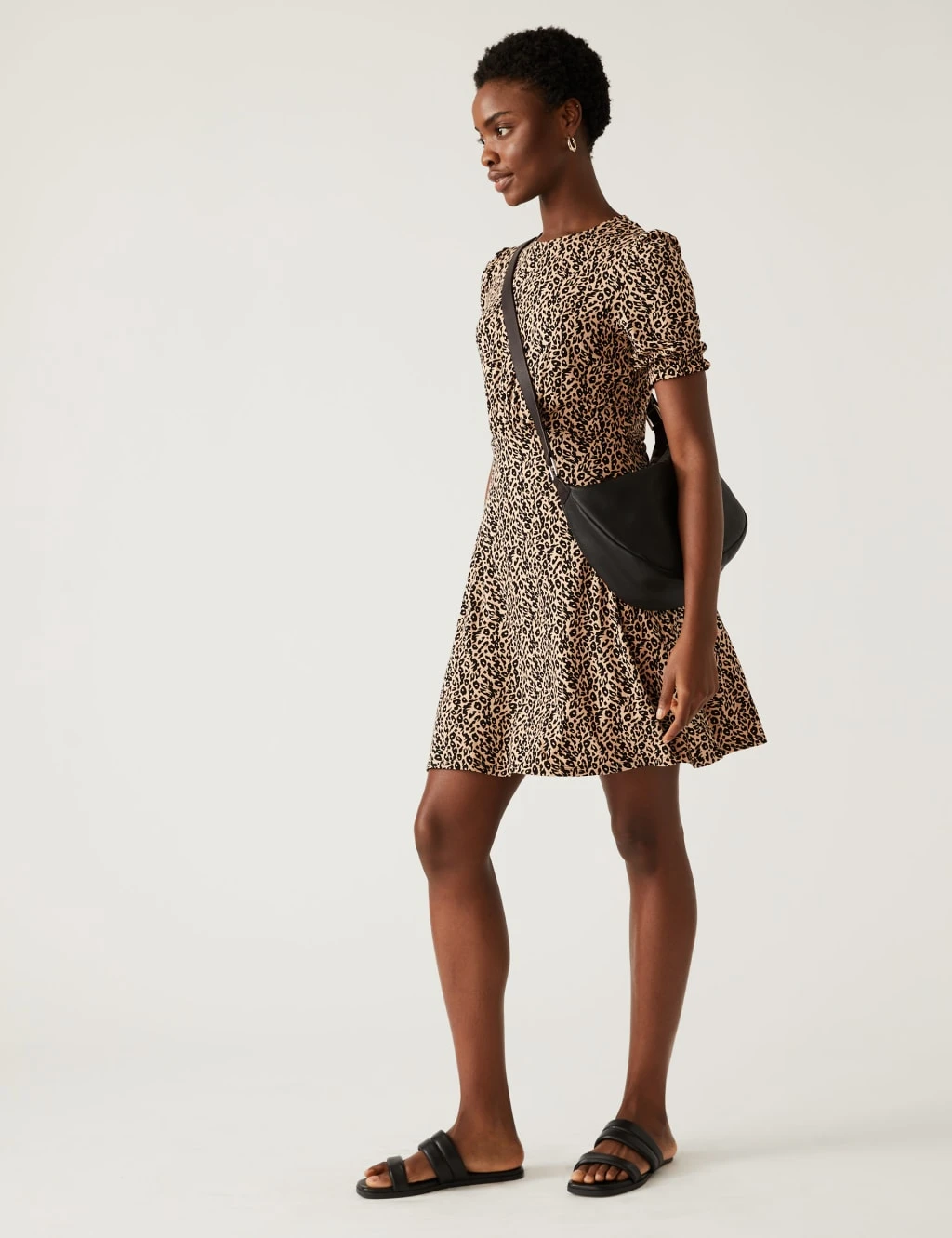 Add a pop of eye-catching print to your wardrobe with our jersey skater dress. It’s designed in a regular fit, with a sleek round neck and subtle pleats at the empire line for a slightly looser effect. Shirred frills on the short sleeves add pretty detail. This piece falls to a playful mini length and has added stretch in the fabric for extra comfort.