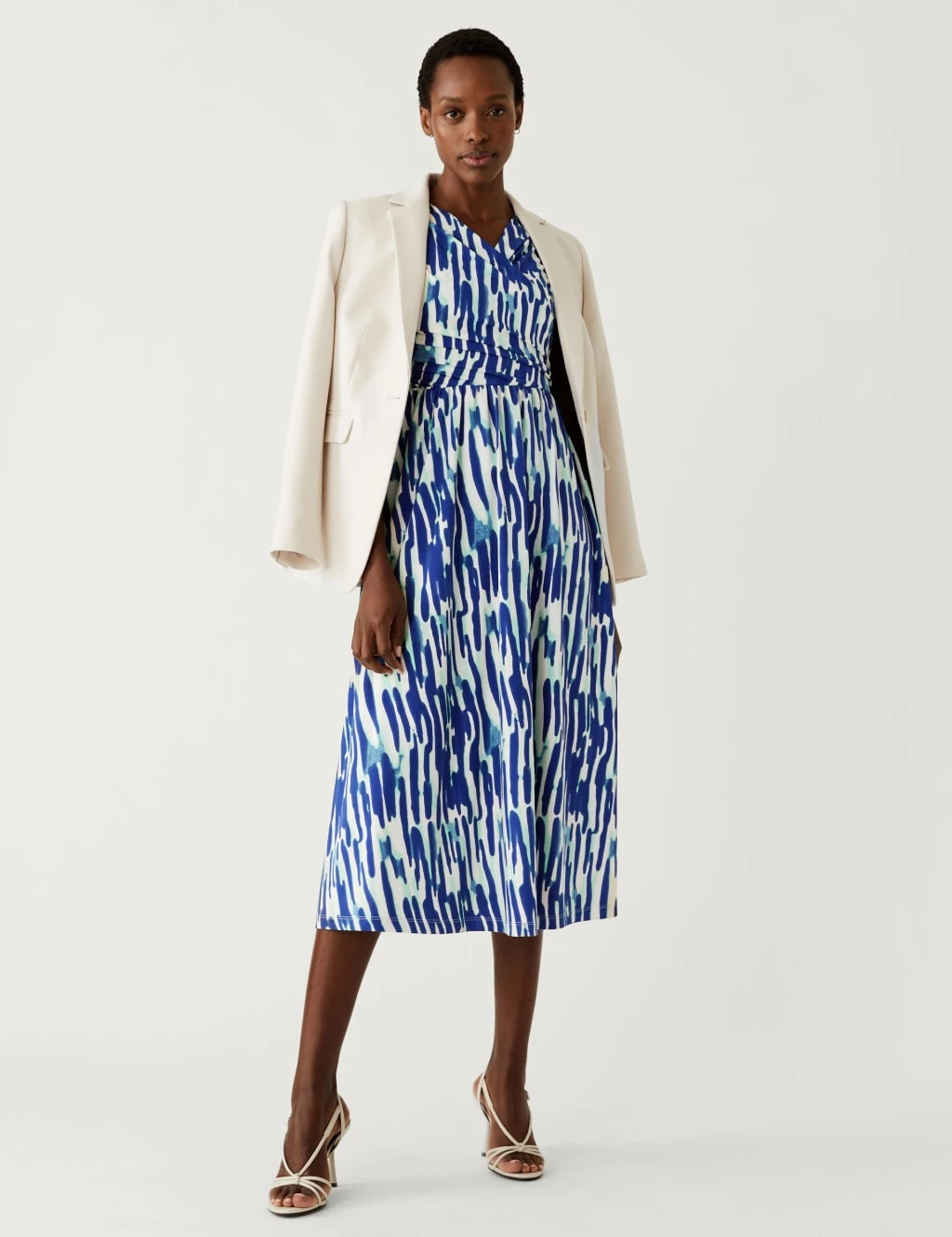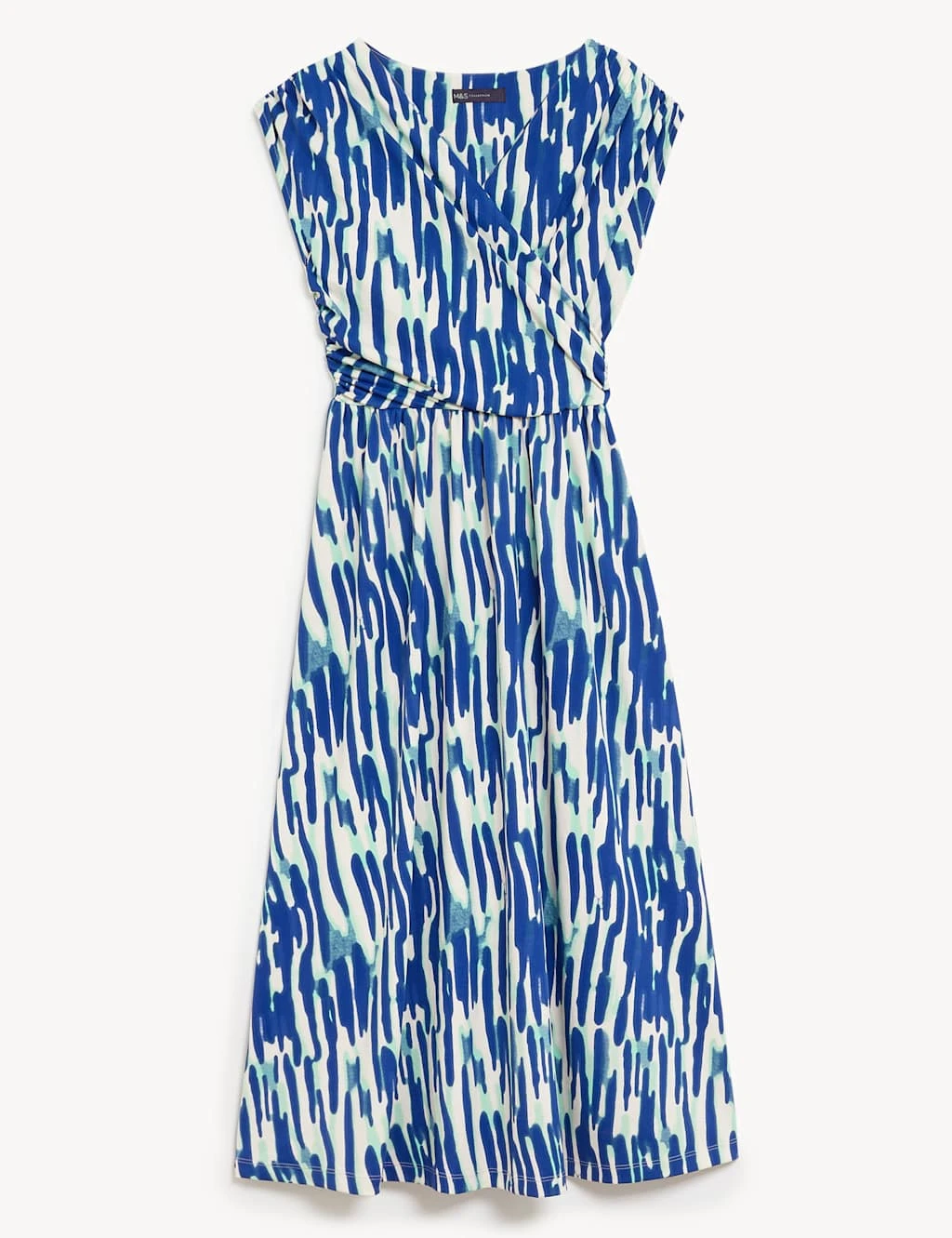 This striking printed dress is crafted from jersey for a flowing silhouette. It’s cut in a flattering regular fit and falls to a timeless midi length. The wrap-over front creates a feminine v-neckline, which is further enhanced by ruching. Added stretch gives more comfort and the sleeveless design makes it ideal for warmer days. M&S Collection: easy-to-wear wardrobe staples that combine classic and contemporary styles.