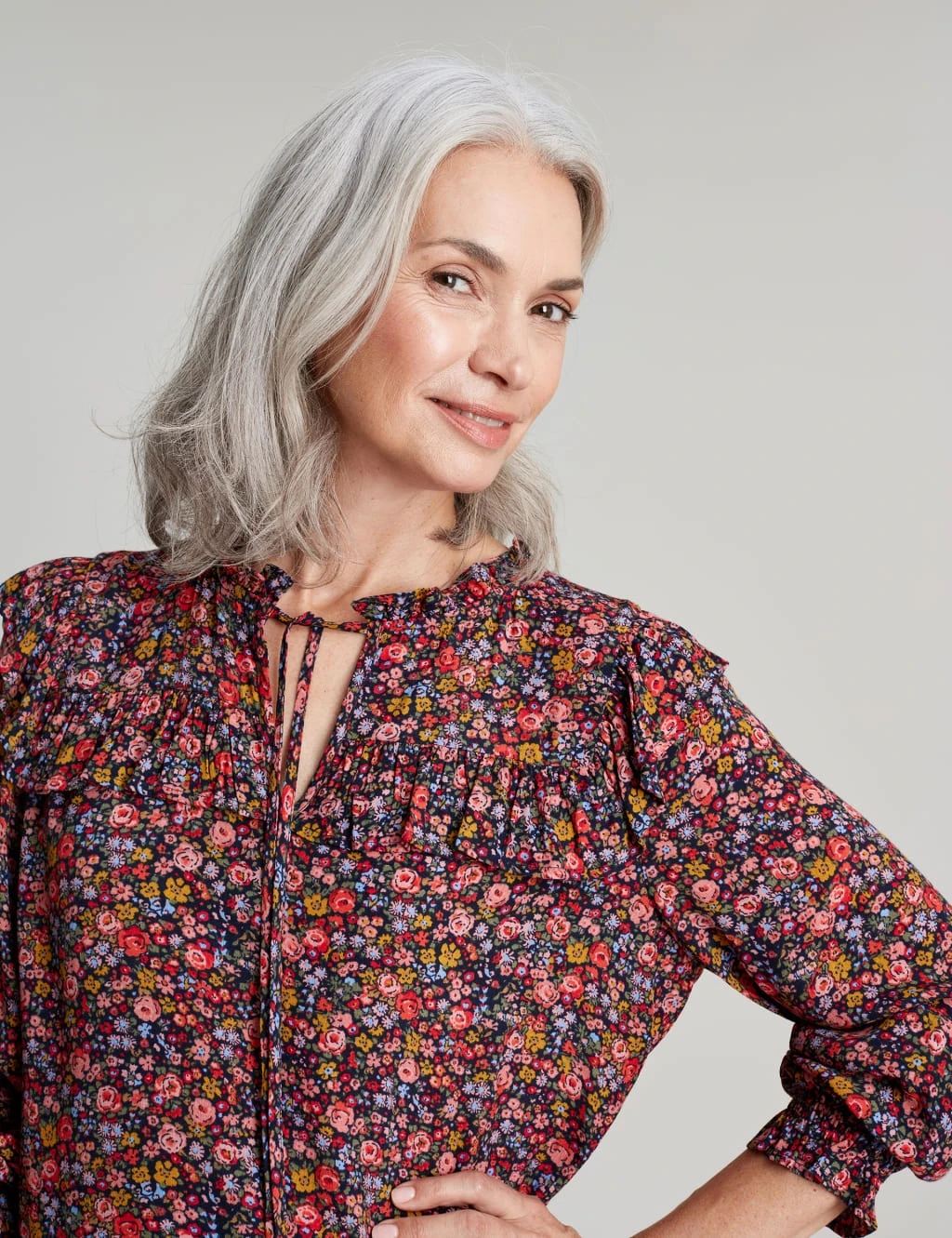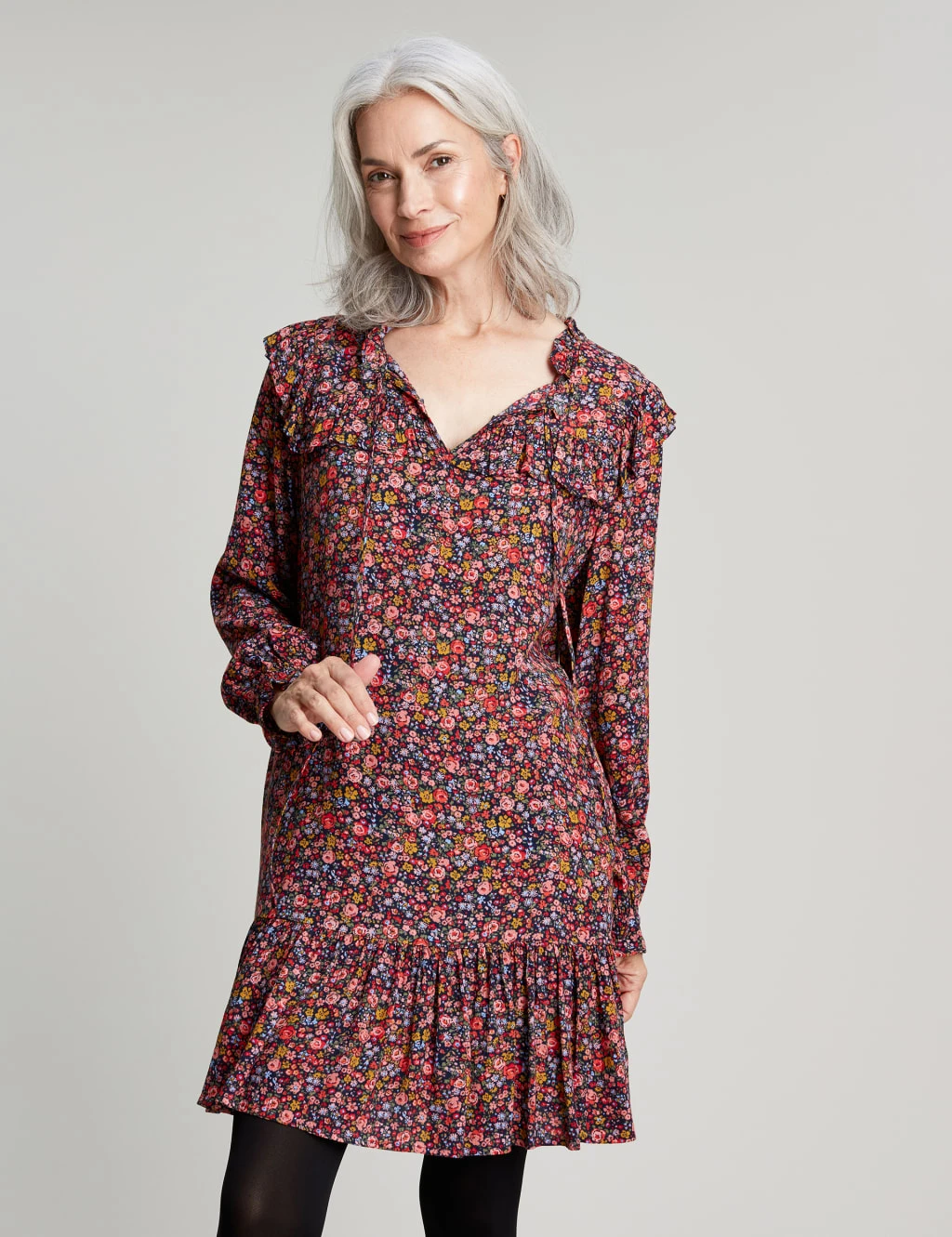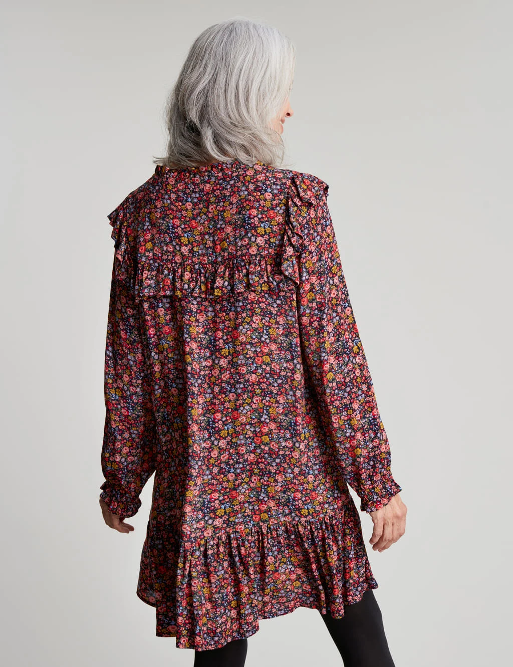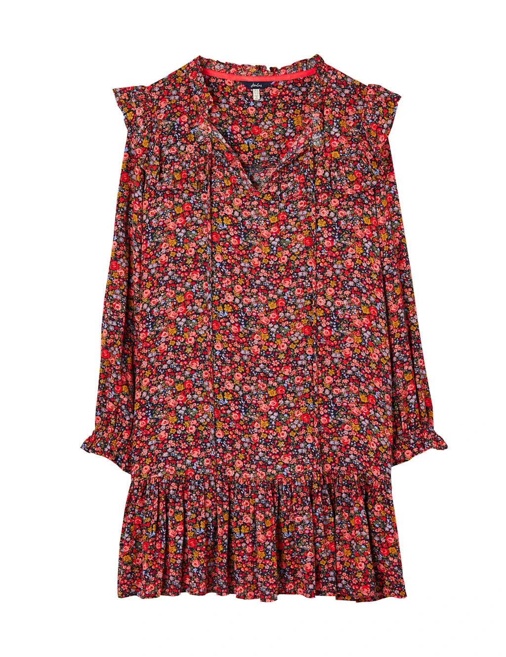Fun and feminine, this charming tunic by Joules is ready for whatever the day holds. It’s cut in a regular fit from cheerful floral fabric for a playful look. A ruffle tier at the knee-length hem accentuates the cheerful style, along with frills at the shoulders, neck and sleeve cuffs. Tie the cord at the neck in a neat bow for a dainty finish.