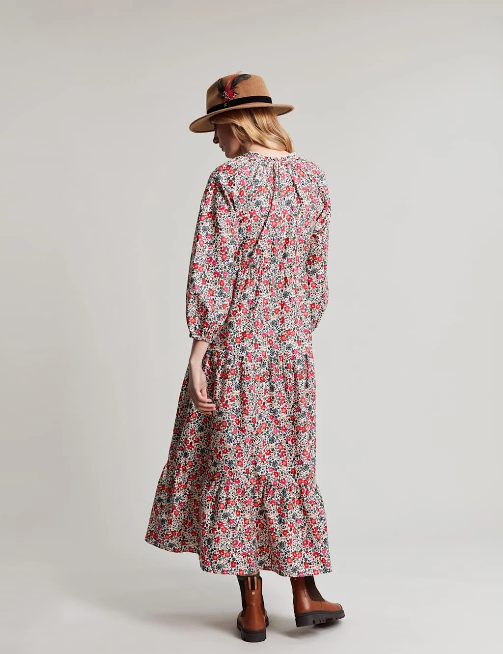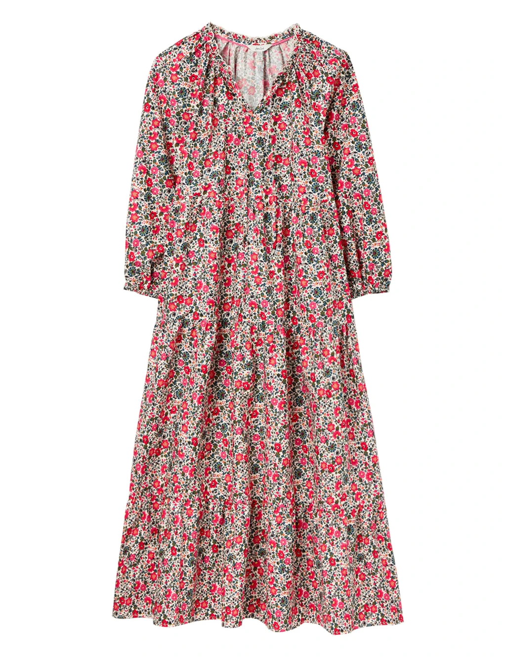 A hand-drawn ditsy floral print lends feminine charm to this pure cotton midaxi dress from Joules. It’s cut in an easy regular fit, with an open neckline highlighted by a scalloped trim and a pretty tie. The three-quarter raglan sleeves gather to elasticated cuffs, while the tiered skirt creates a flowing silhouette.