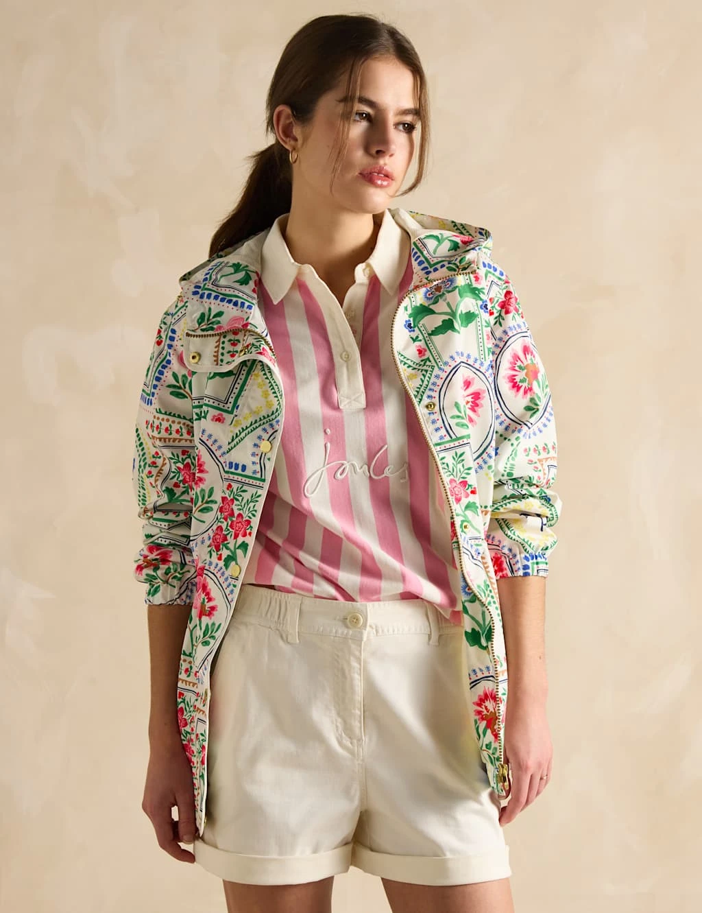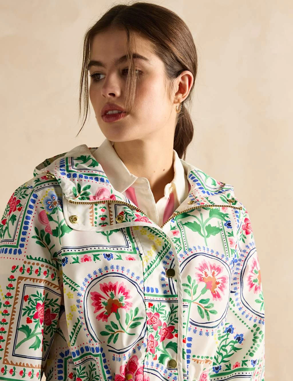 Enjoy a bright pop of print on rainy days with this floral raincoat from Joules. It comes in a comfy regular fit, with a drawstring hood and an internal adjustable waist for a flattering silhouette. The waterproof, lined design fastens with a front zip and poppers and is finished with jets at the pockets and a smart branded patch at the sleeve.