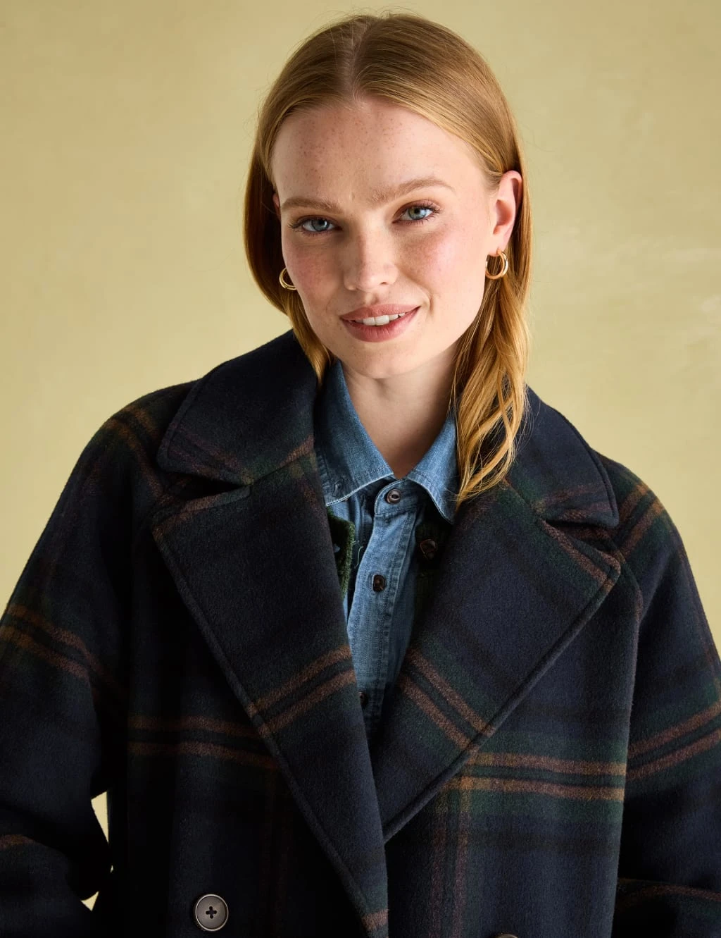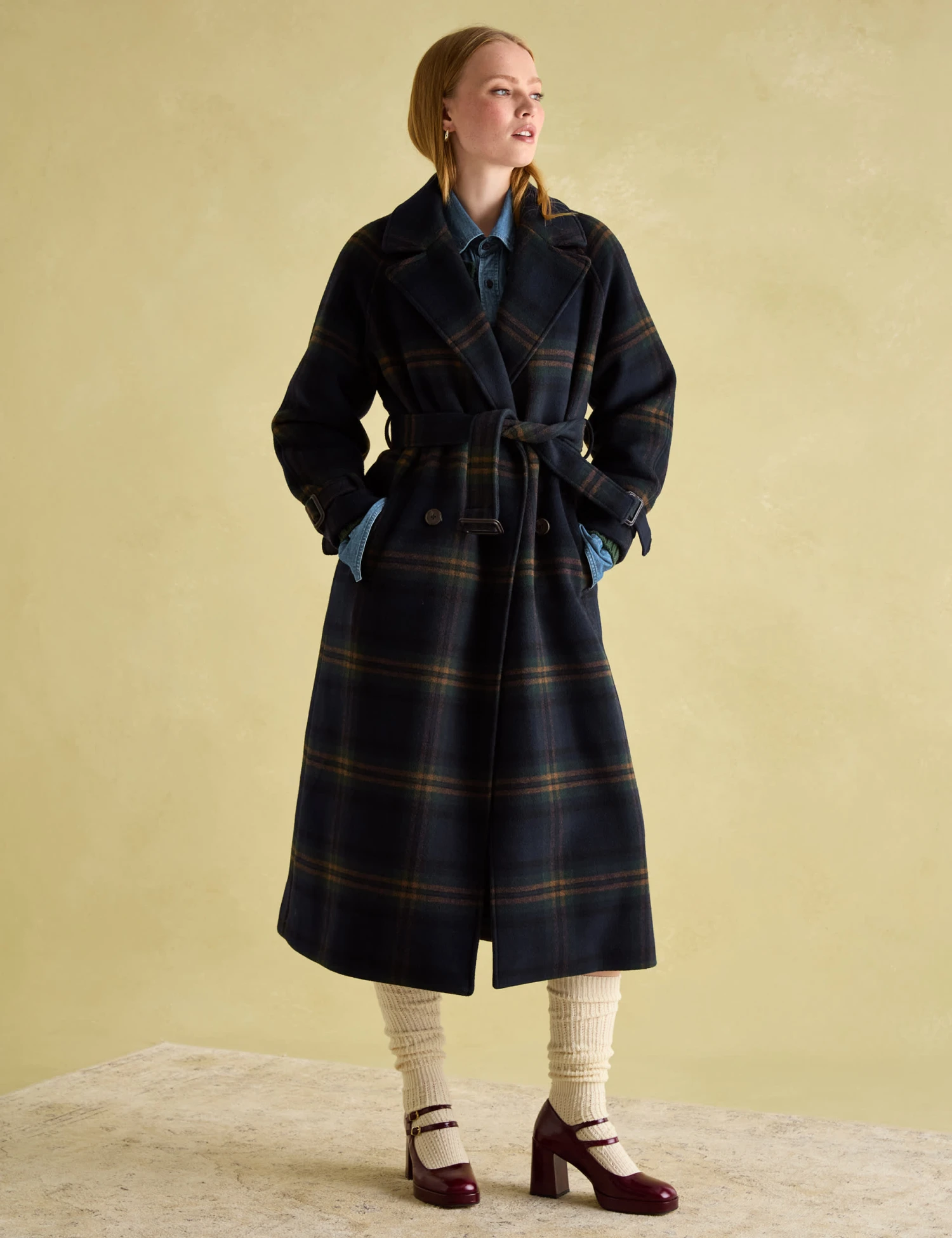 With its wool-blend fabric and timeless checked pattern, this coat from Joules is a stylish choice. It’s designed in an easy regular fit, with smart notched lapels and a double-breasted buttoned front. A self-tie belt and belted cuff straps add refined detail to this trench-inspired design.