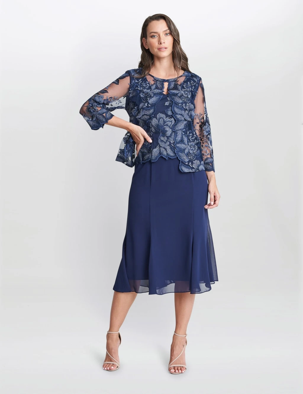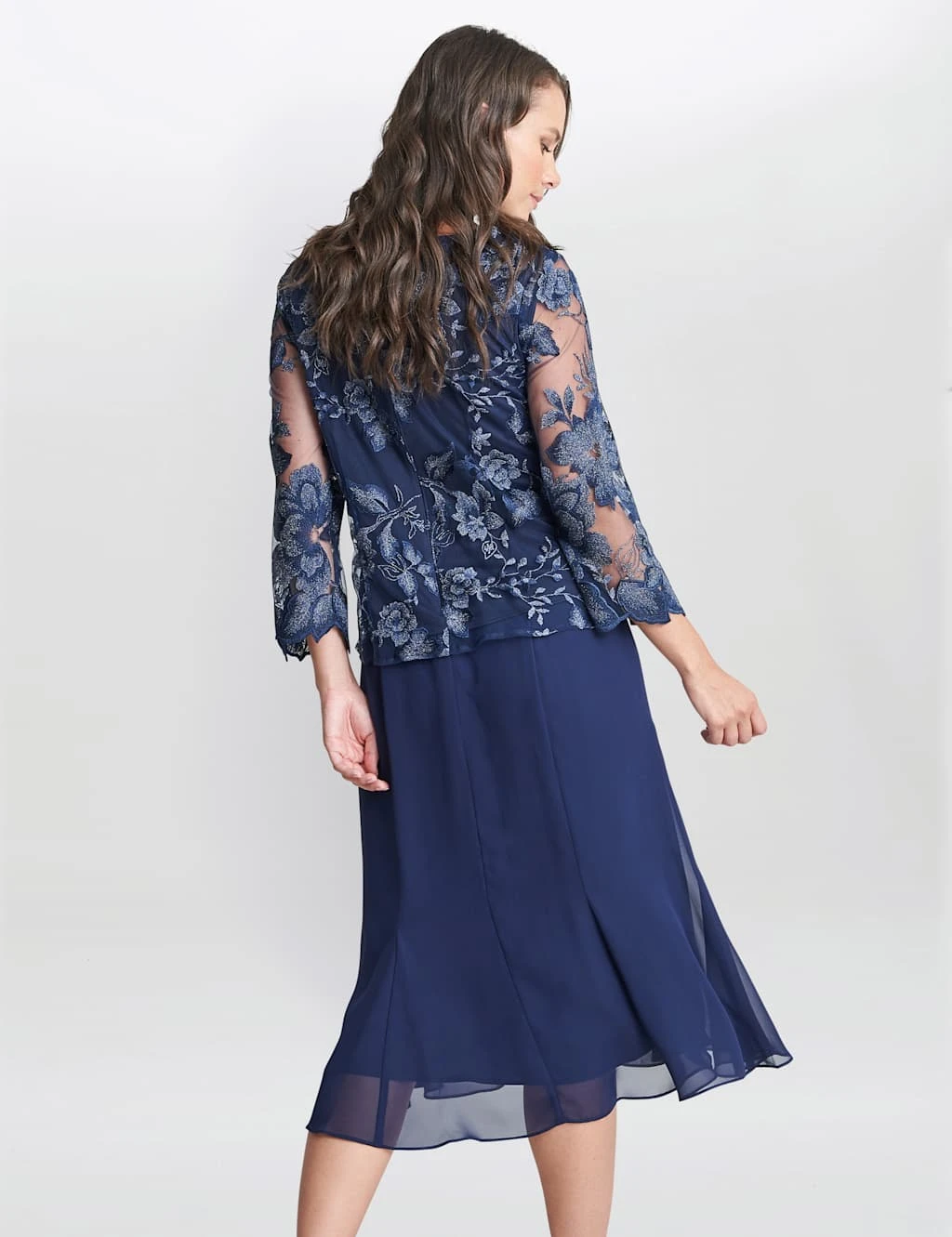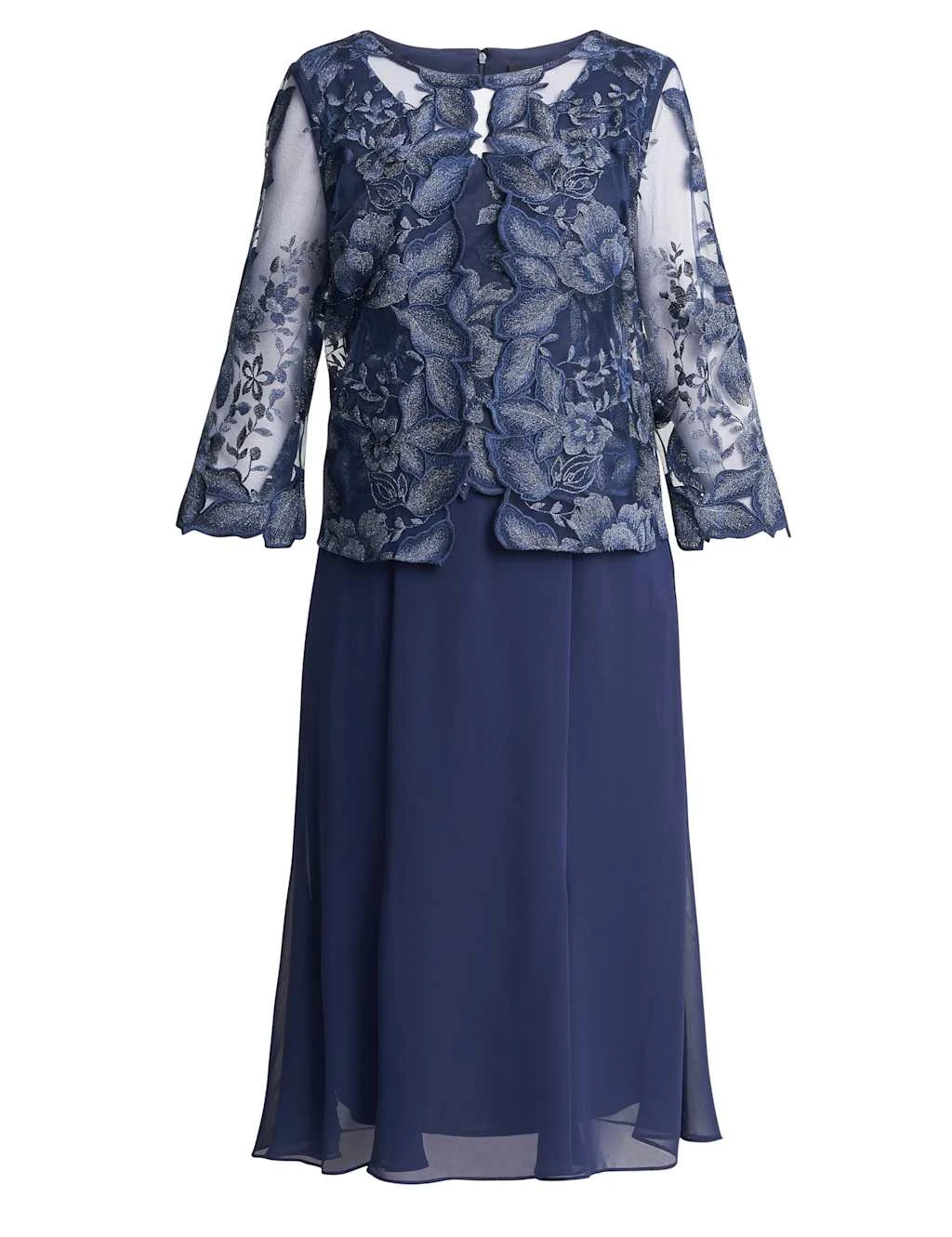 Dress for that special occasion with this swing dress and mock jacket ensemble by Gina Bacconi. Designed in a regular fit, the dress features a midi-length skirt crafted from floaty chiffon fabric. The round-necked bodice has a floral lace overlay, which co-ordinates with the mock jacket. Elegant three-quarter sheer sleeves complete the look.