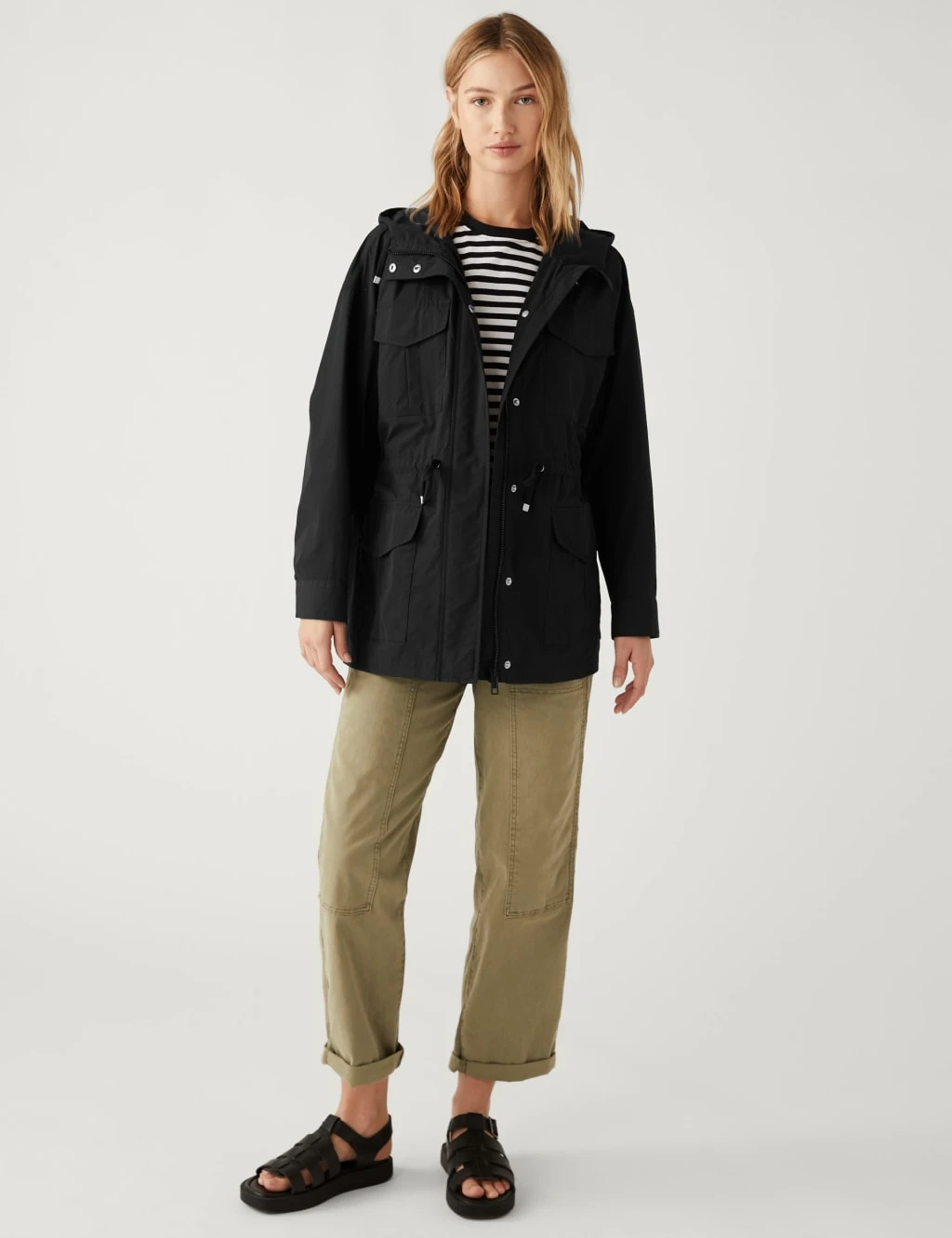 Unpredictable summer showers are no match for this lightweight utility-style jacket. It’s cut to a comfortable regular fit with a popper front closure over the zip to keep the elements at bay. A drawstring on the waist offers shaping for a flattering silhouette. Patch pockets on the chest and double-entry hip pockets add to its practical appeal. The jacket is finished with our water-repellent Stormwear™ technology and an oversized hood to keep out the rain.