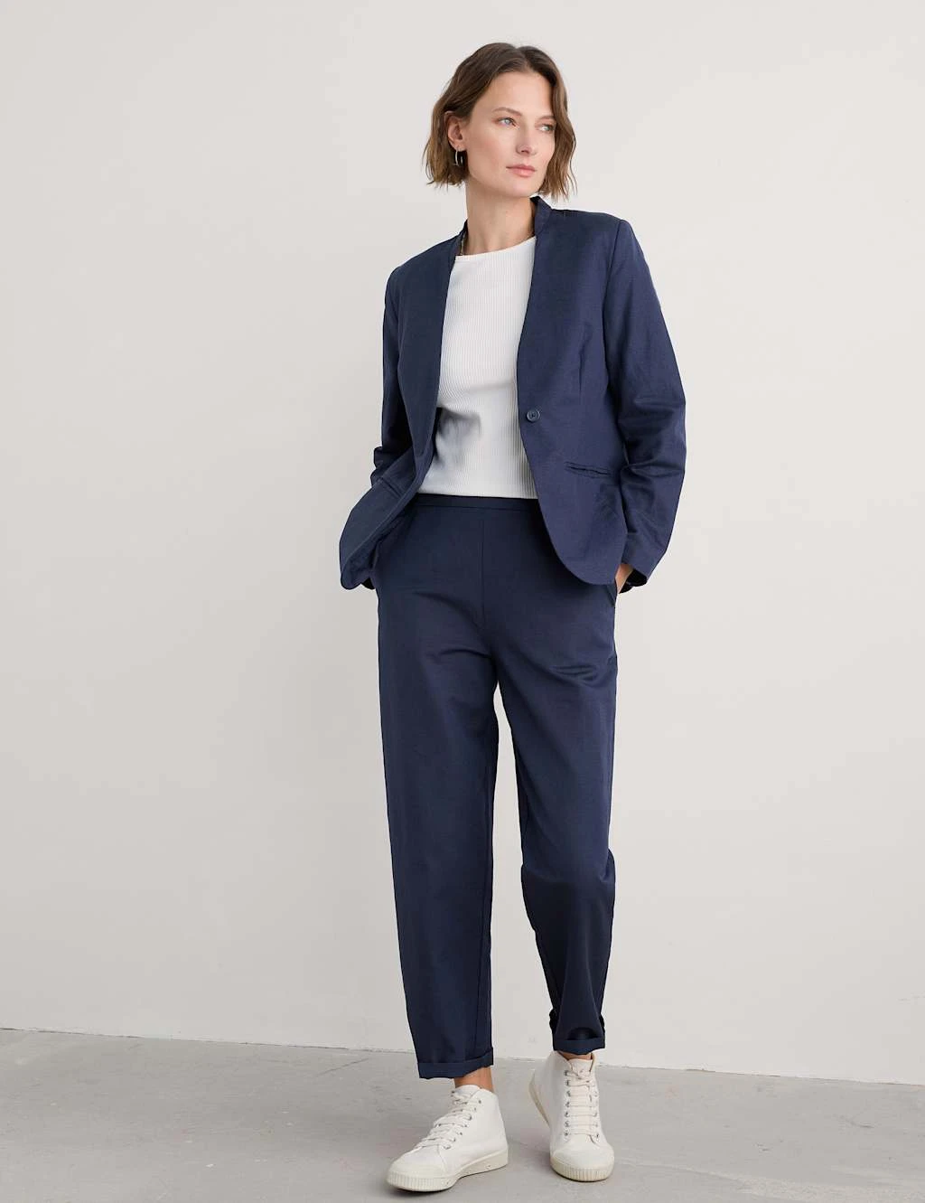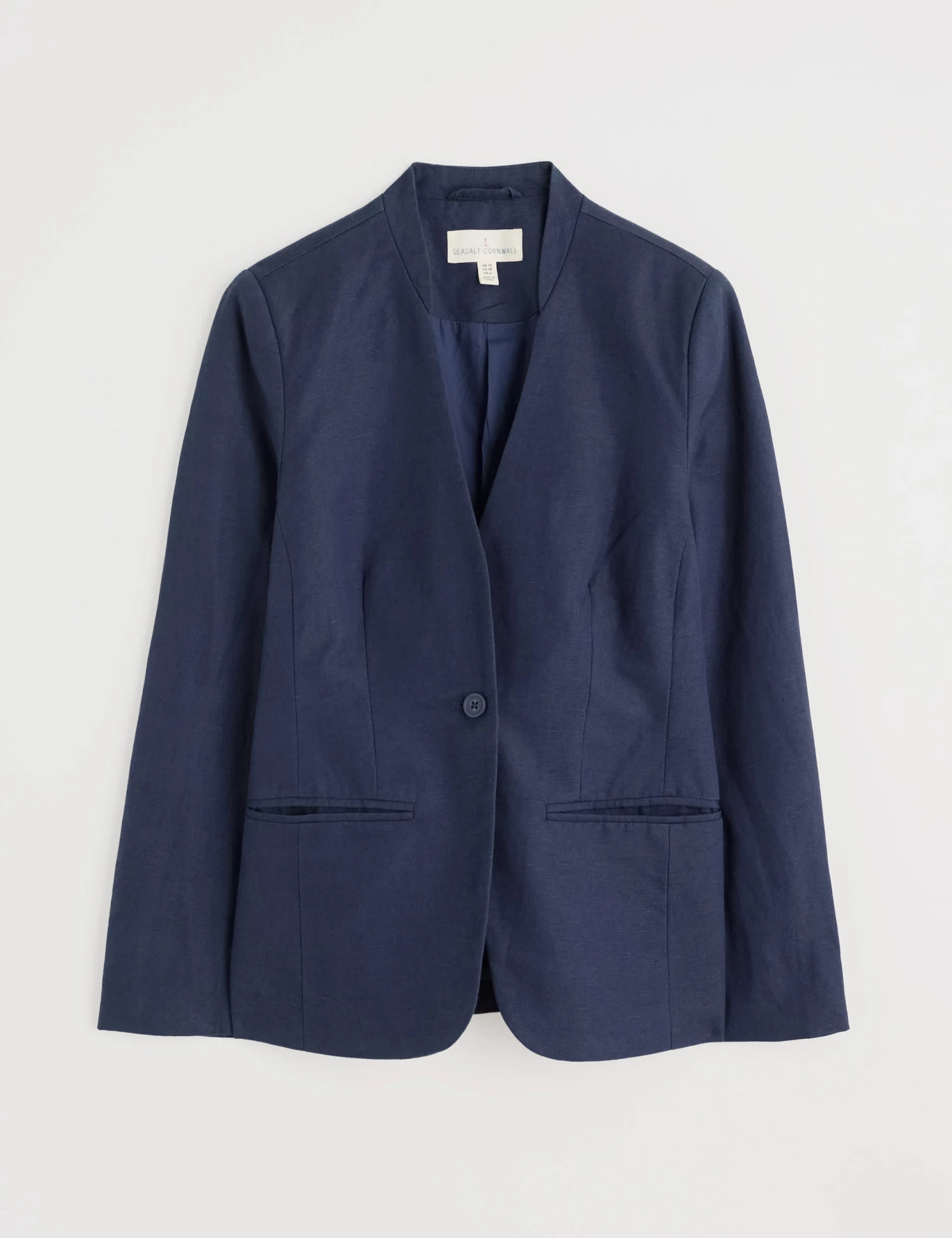 This linen and cotton blend blazer from Seasalt Cornwall is a smart choice for warmer days. It’s cut in a sleek slim fit, with a flattering single-breasted design and a one-button closure that cinches the waist. A stand collar and welt pockets add timeless tailoring details.