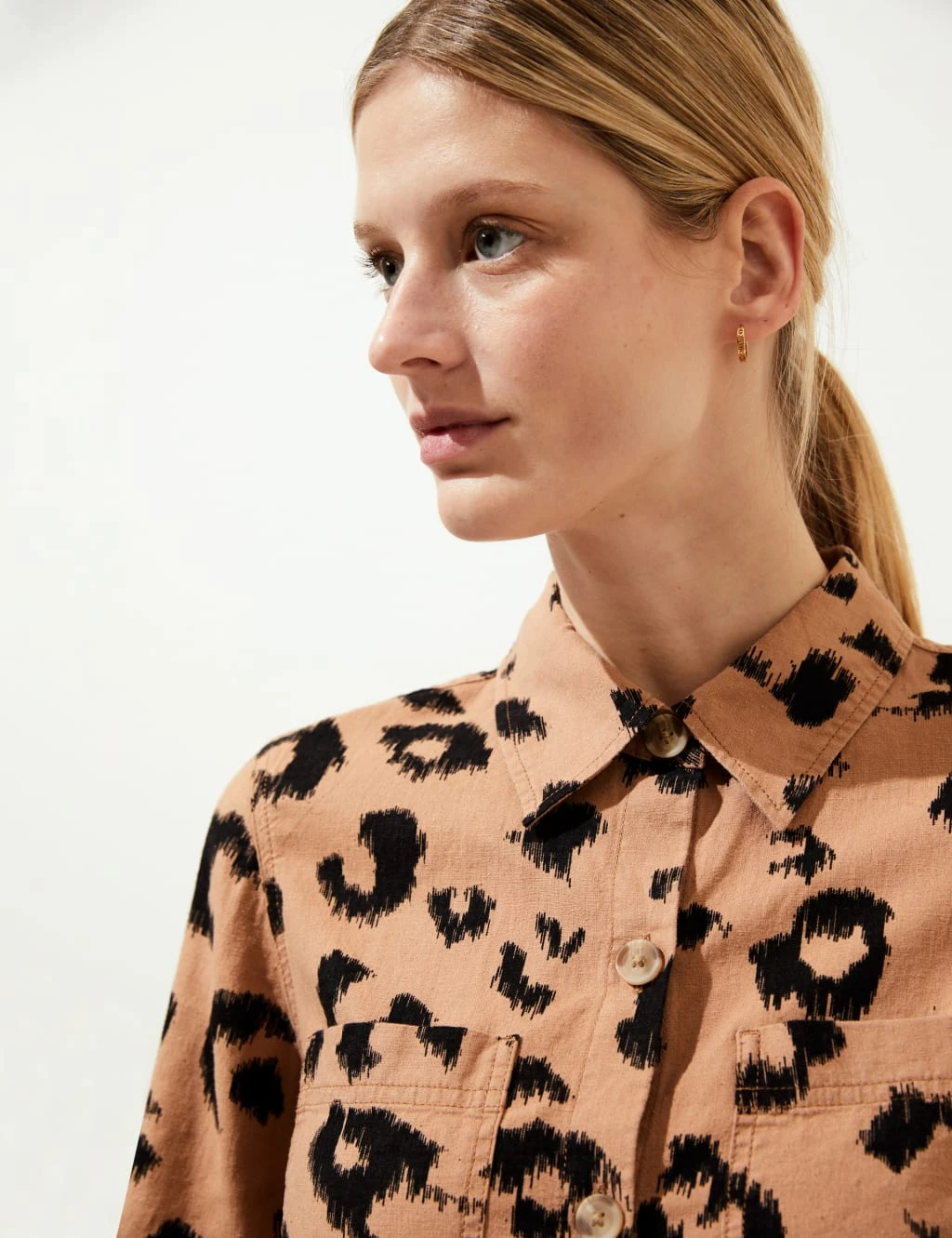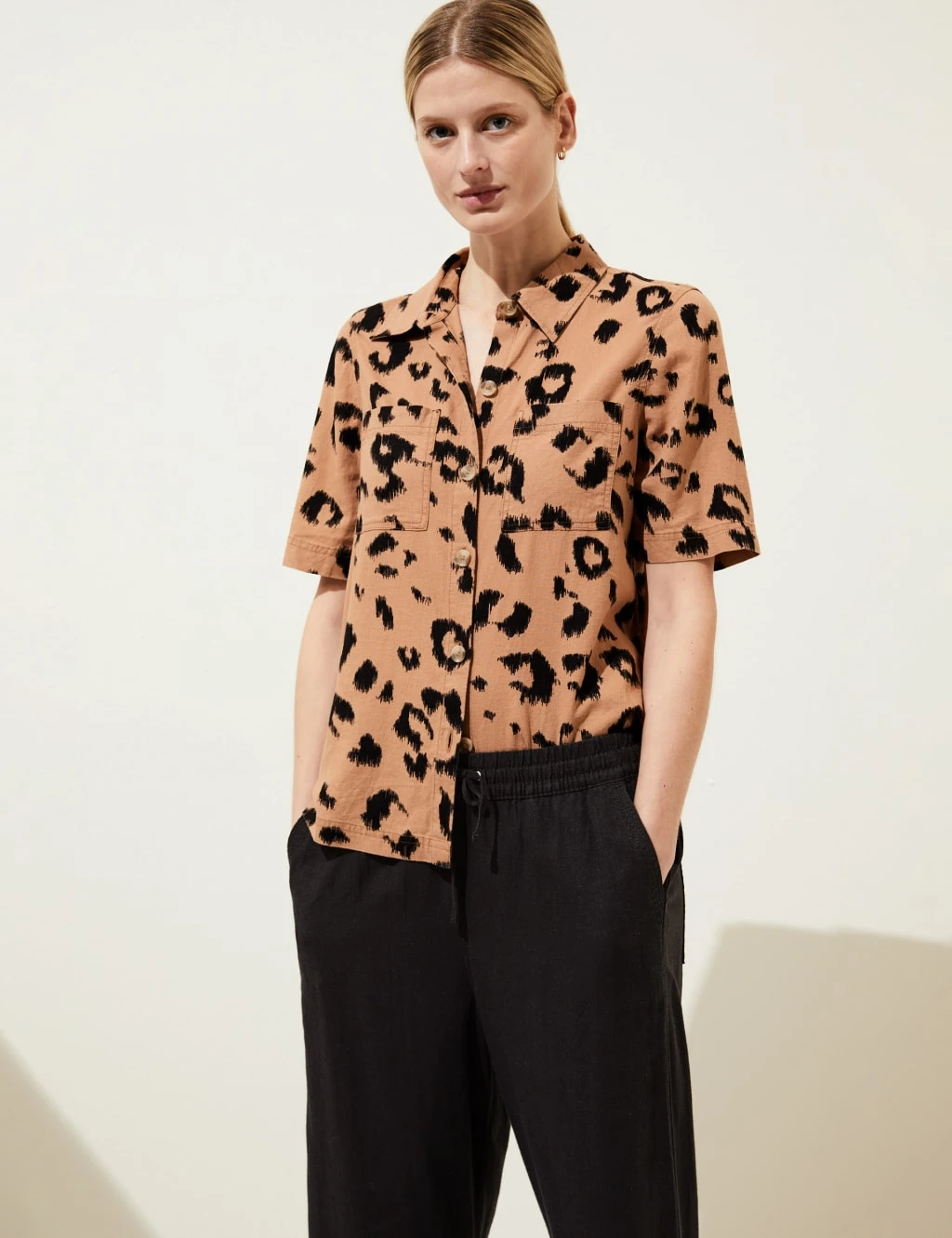 Release your wild side with this animal print shirt, cut from luxurious linen-rich fabric. It comes in a regular fit with a utility-inspired look, thanks to the chest pockets and short sleeves. A collared neckline and button-down front create a smart finish.