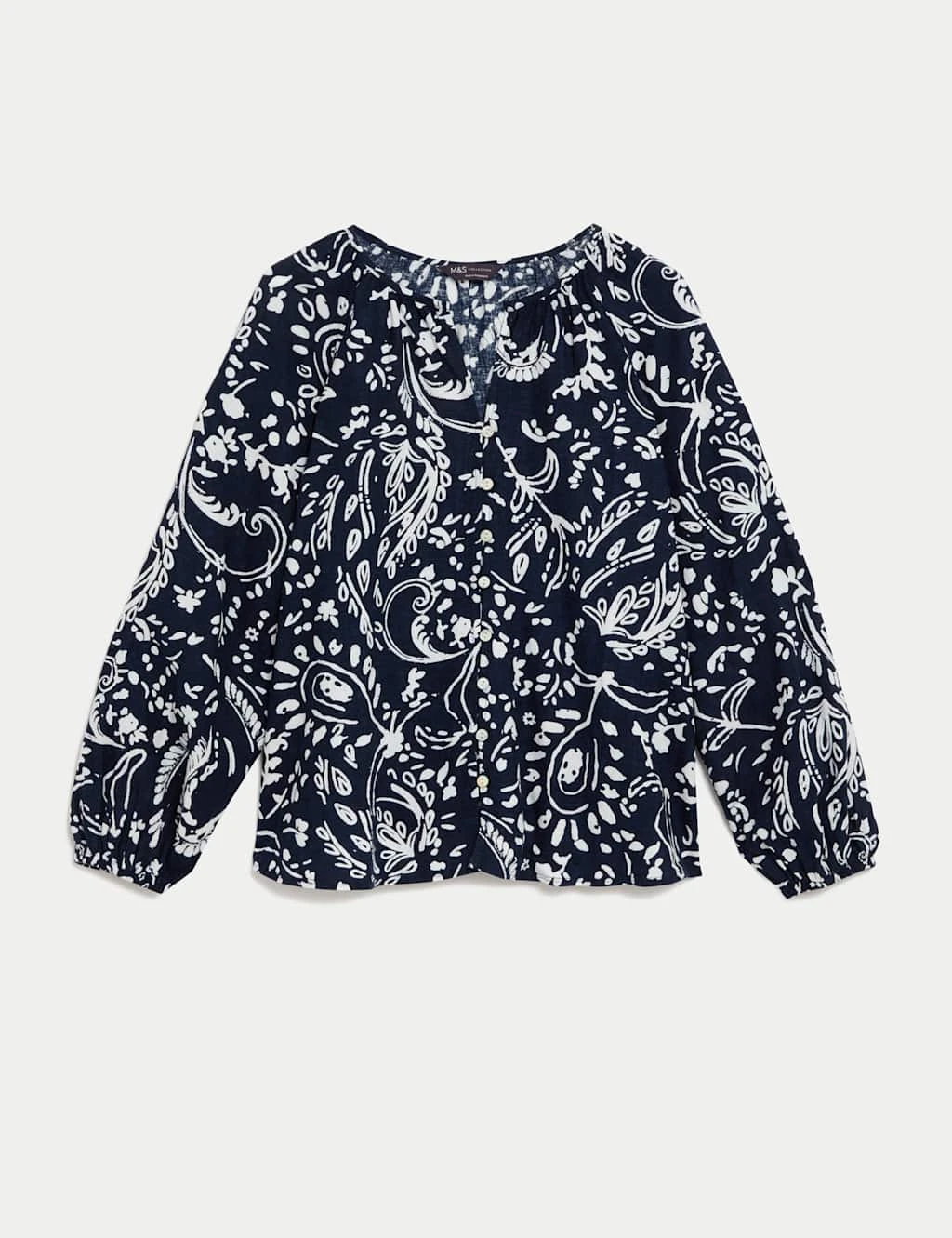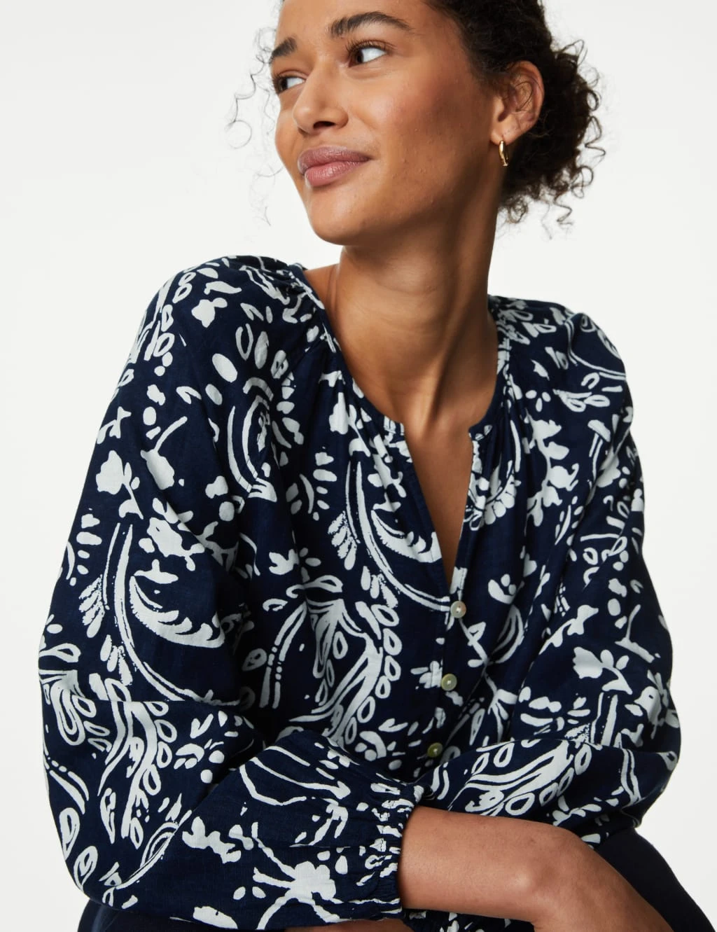 With its distinctive print, this linen-rich blouse brings a stand-out look to any outfit. It’s cut to a regular fit, with a notch v-neckline leading to a button-up front. The long sleeves feature elasticated cuffs for extra volume, adding to the laid-back feel.