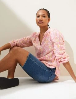 Our printed blouse is made from linen-rich fabric for a breathable feel. It’s cut to a comfortable relaxed fit, with an elegant v-neckline and rounded hem. The long sleeves finish in elasticated cuffs for a touch of volume and feature a distinctive pleated detail just above the wrists. M&S Collection: easy-to-wear wardrobe staples that combine classic and contemporary styles.