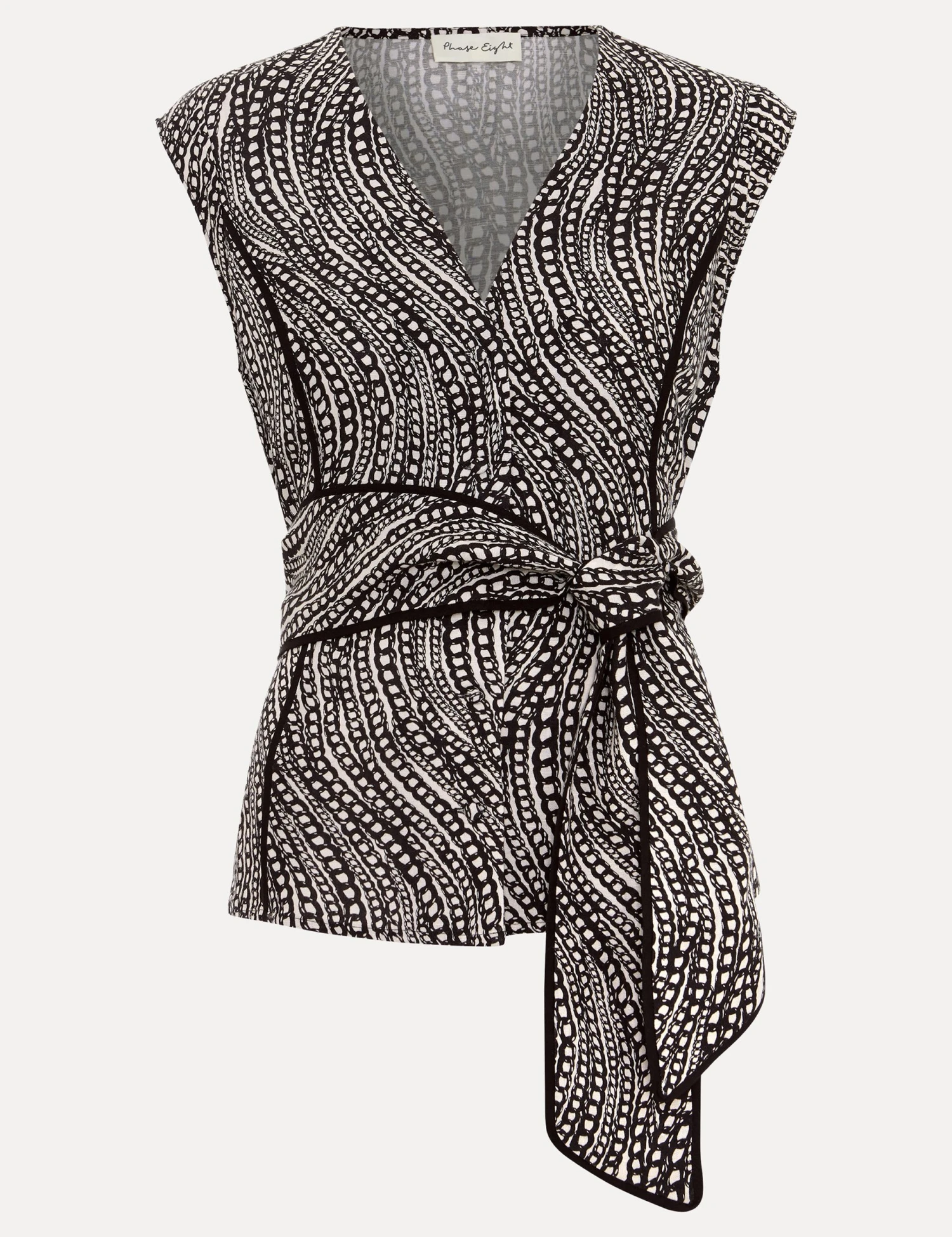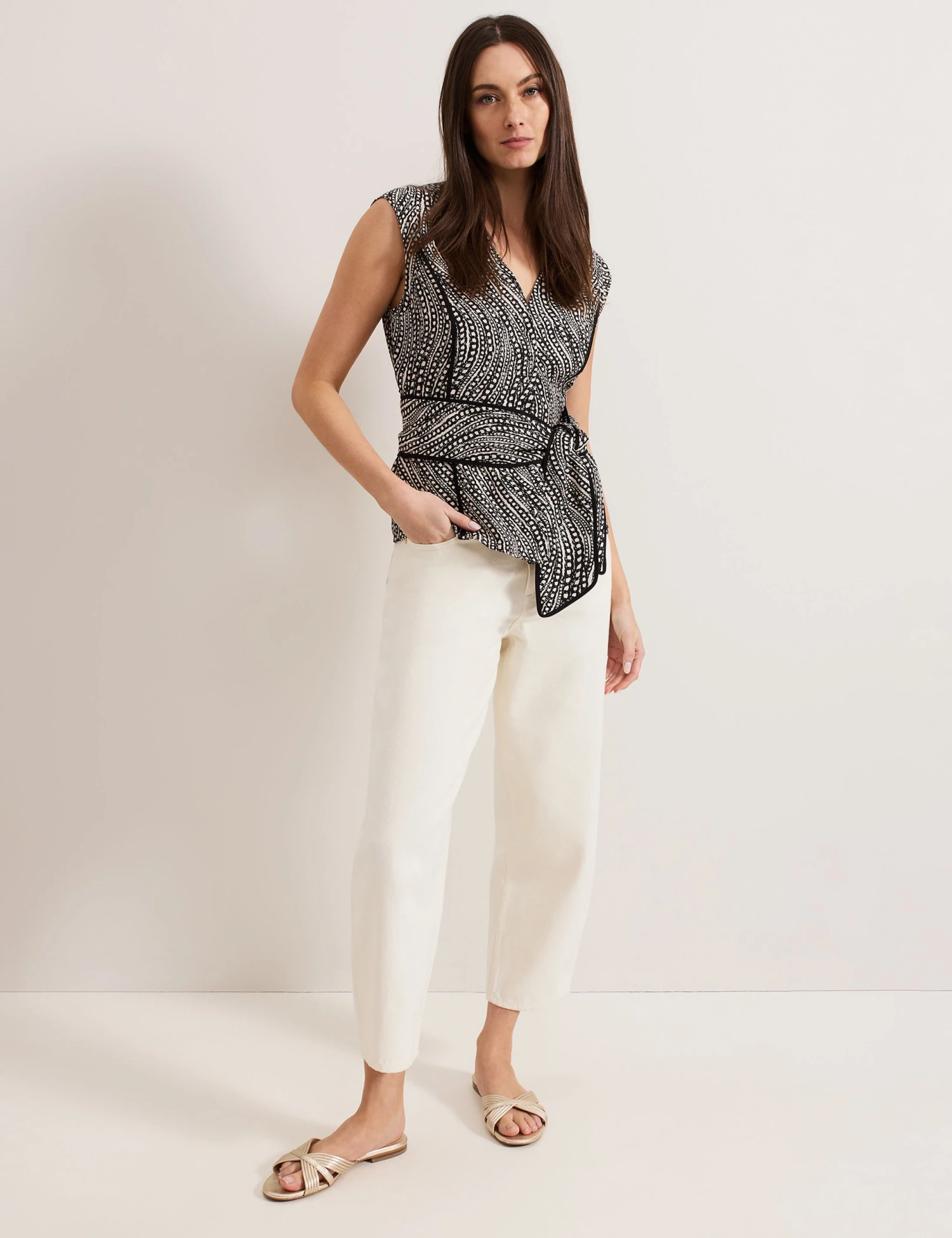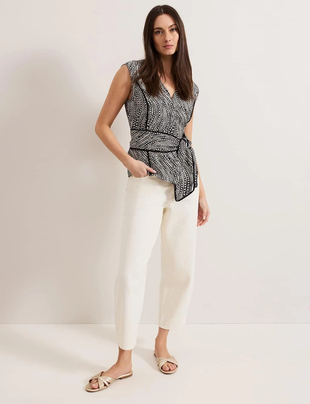 This linen-rich sleeveless top from Phase Eight is a breathable choice for the warmer months. It’s cut in a comfy regular fit, with covered button fastenings and a feminine v-neckline. A tie detail cinches the waist for flattering shaping, while a bold abstract print ensures a standout look.