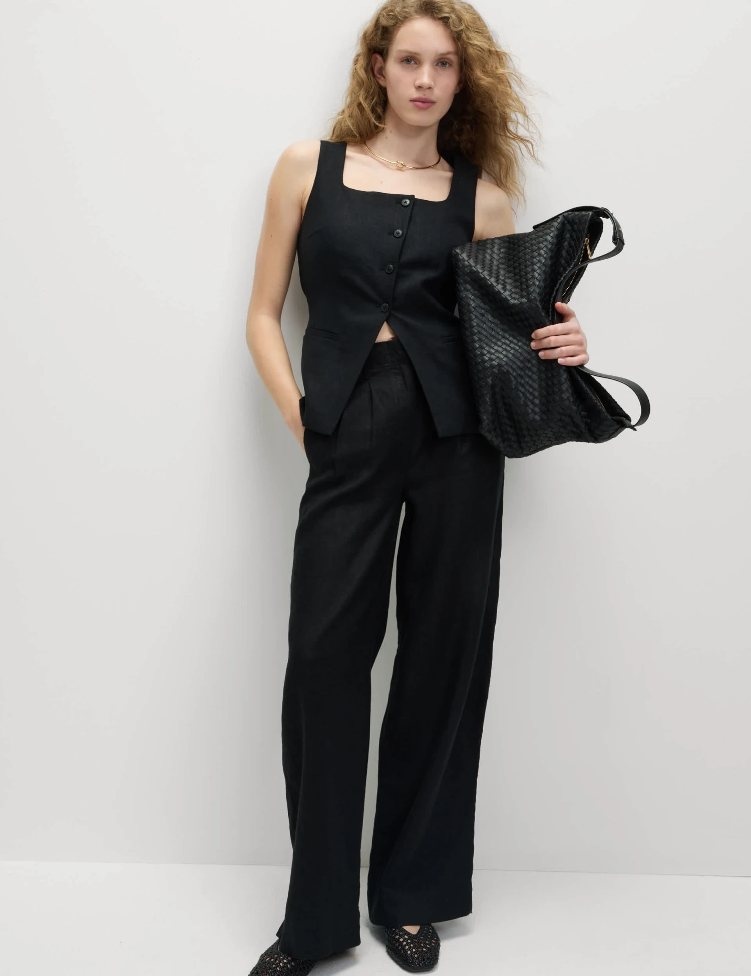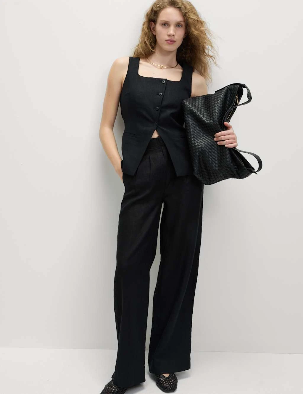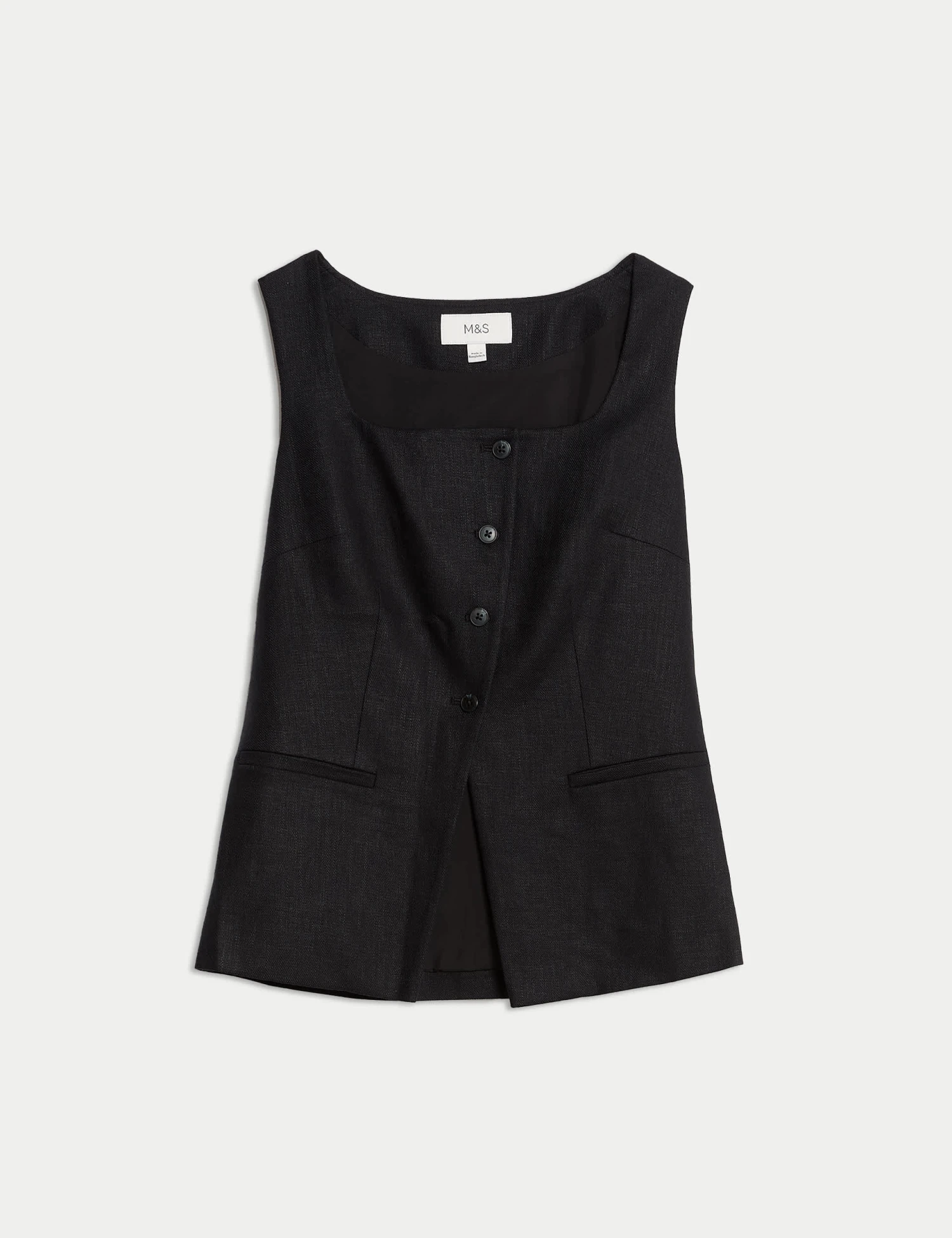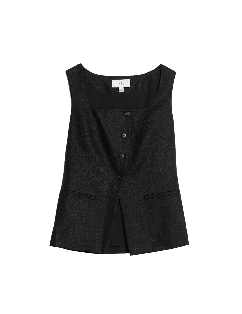 This chic waistcoat is crafted from linen-rich twill for a sophisticated look and lightweight feel. It’s cut to a flattering tailored fit with a contemporary square neckline. Classic button fastening down the front and welt pockets add traditional flair.M&S Collection: easy-to-wear wardrobe staples that combine classic and contemporary styles.