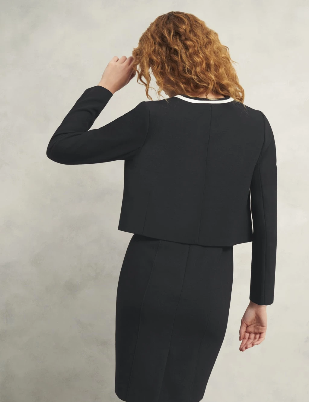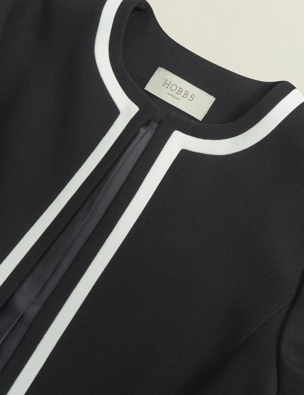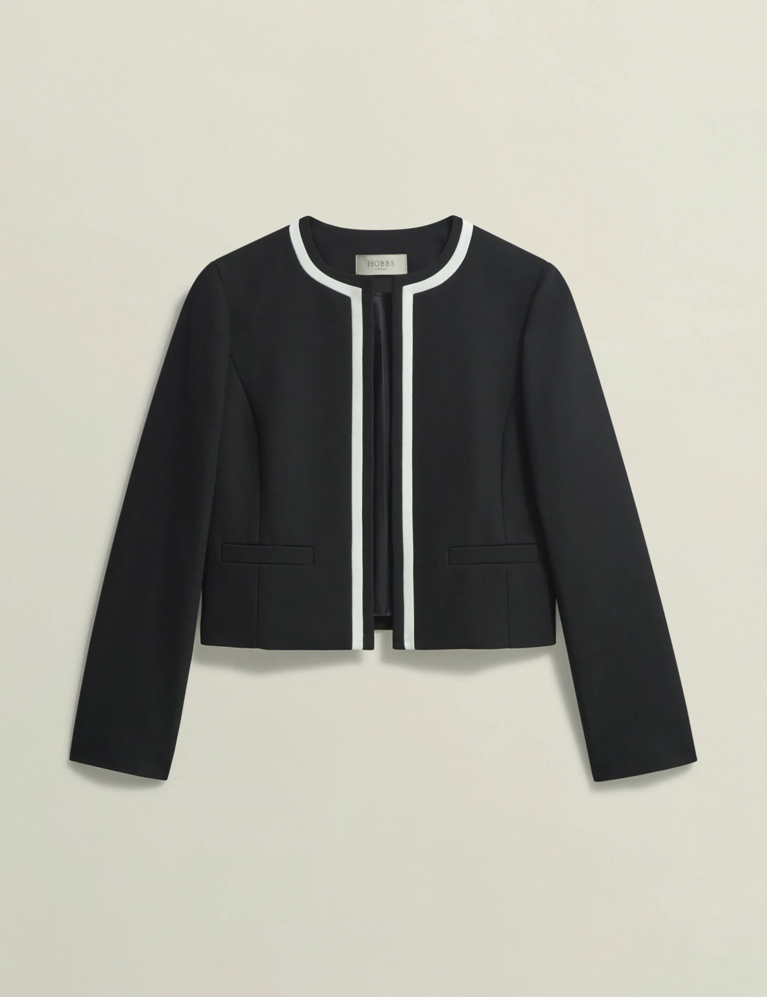 Bring an impeccable finish to wedding or special occasion ensembles with this eye-catching jacket from Hobbs. Designed in a regular fit with added stretch in the fabric, it’s fully lined for comfort and features a round, collarless neckline. The cropped length and monochrome palette with contrasting trim gives sartorial style to this open-fronted piece.