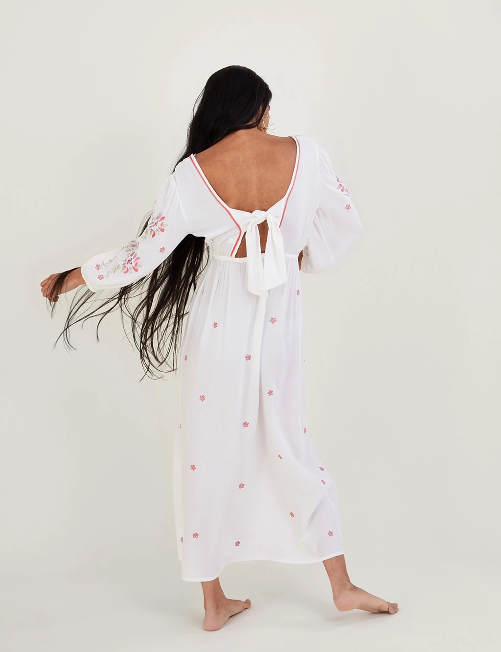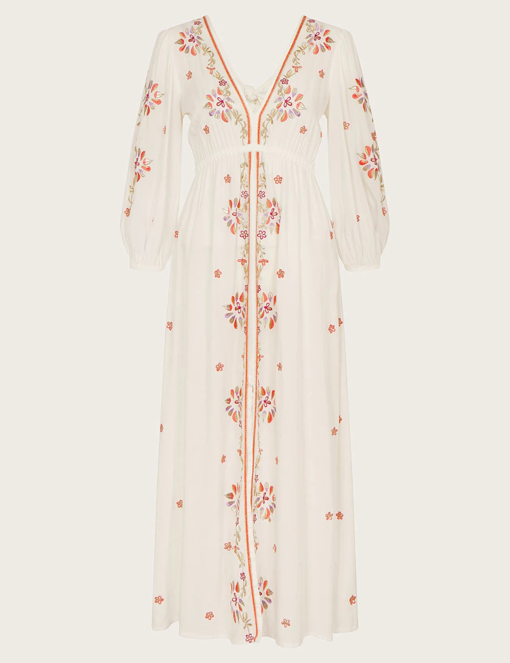 Pretty embroidery brings a feminine feel to this breezy beach dress from Monsoon. The maxi-length design features a v-neckline and striking tie detail at the back. Gathering at the waist and the cuffs of the three-quarter sleeves adds delicate volume.