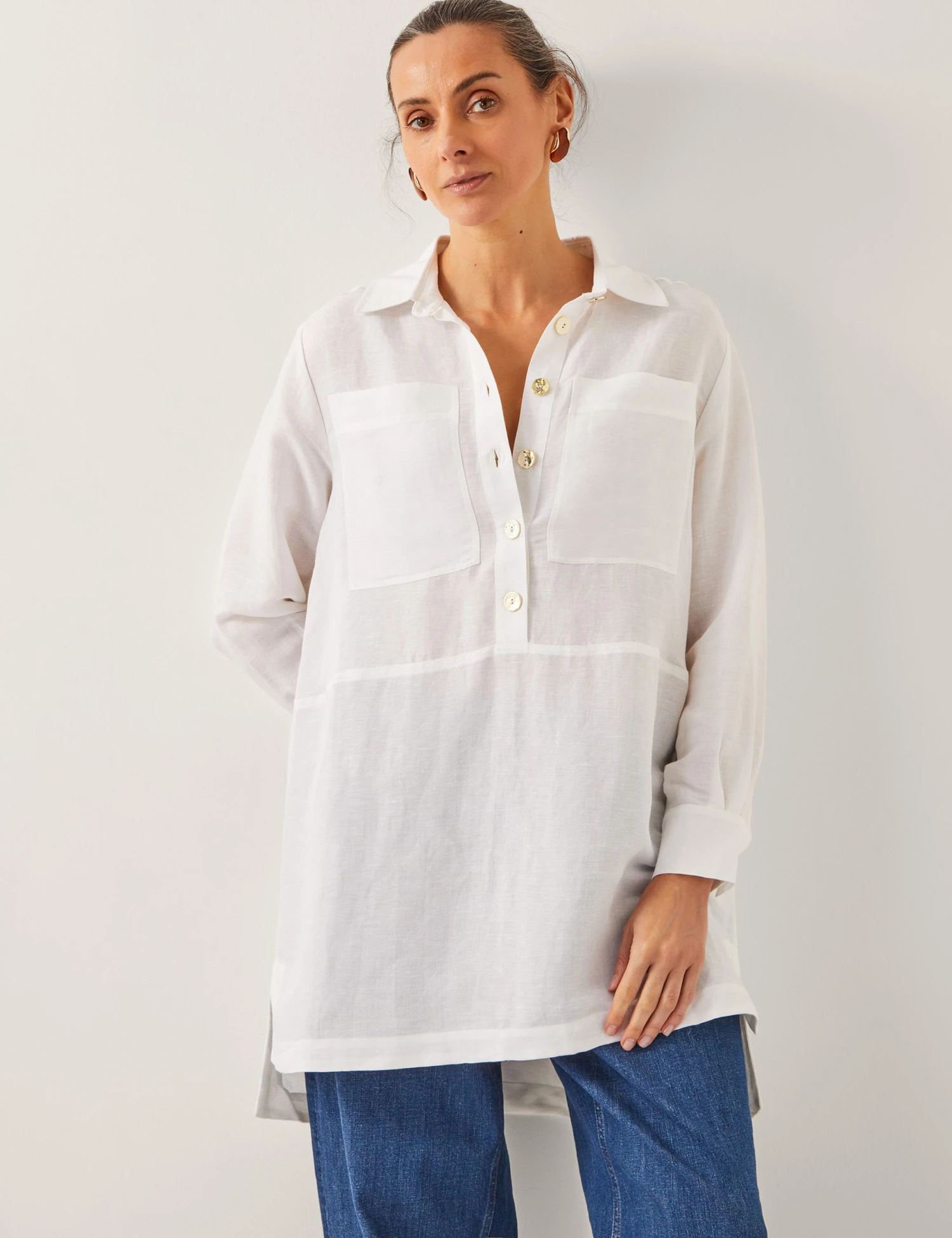 This long-sleeved tunic by Monsoon is made from a linen blend to bring all-day comfort. The regular-fit design features a collared neckline that leads to a button placket at the front to give a smart look. Two chest pockets offer a handy touch. This versatile longline style comes with a curved hem for a flattering finish.