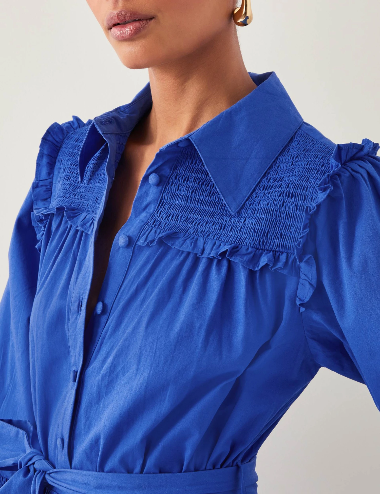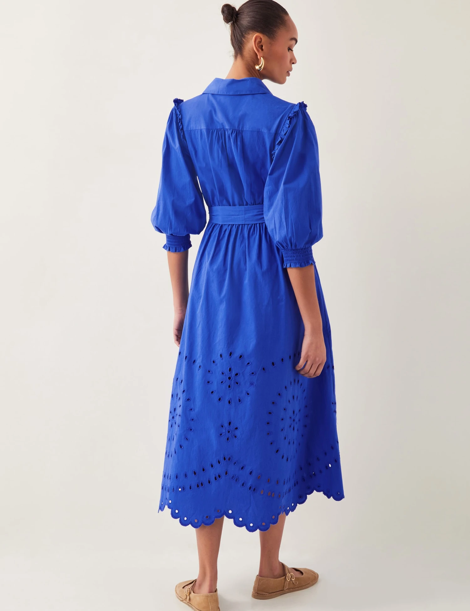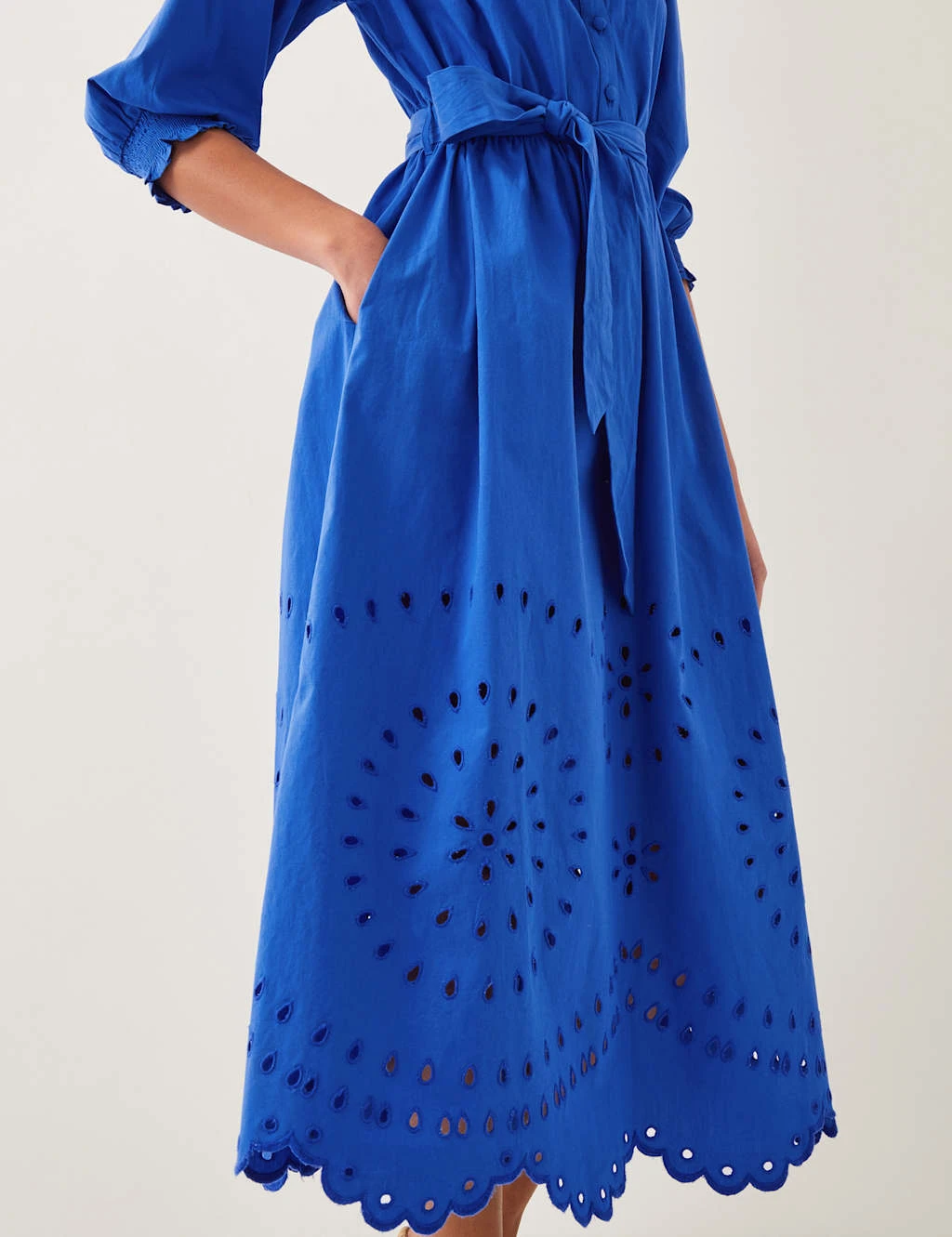 This pure cotton Monsoon skater dress is brimming with intricate broderie detailing for a statement look. It’s made in a regular fit, with a collared neckline and distinctive shirred panels at the chest. Long puff sleeves with pretty shoulder frills and shirred cuffs add volume. Covered buttons decorate the bodice and there’s a broad fabric tie at the waist. The broderie skirt flares out to midi length and features an attractive scalloped hem.