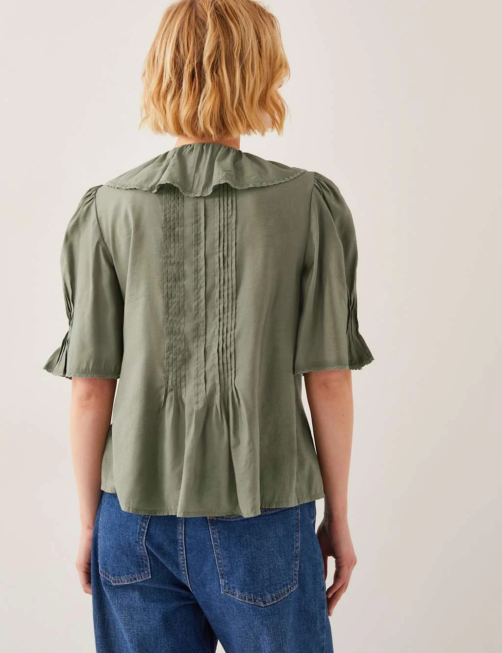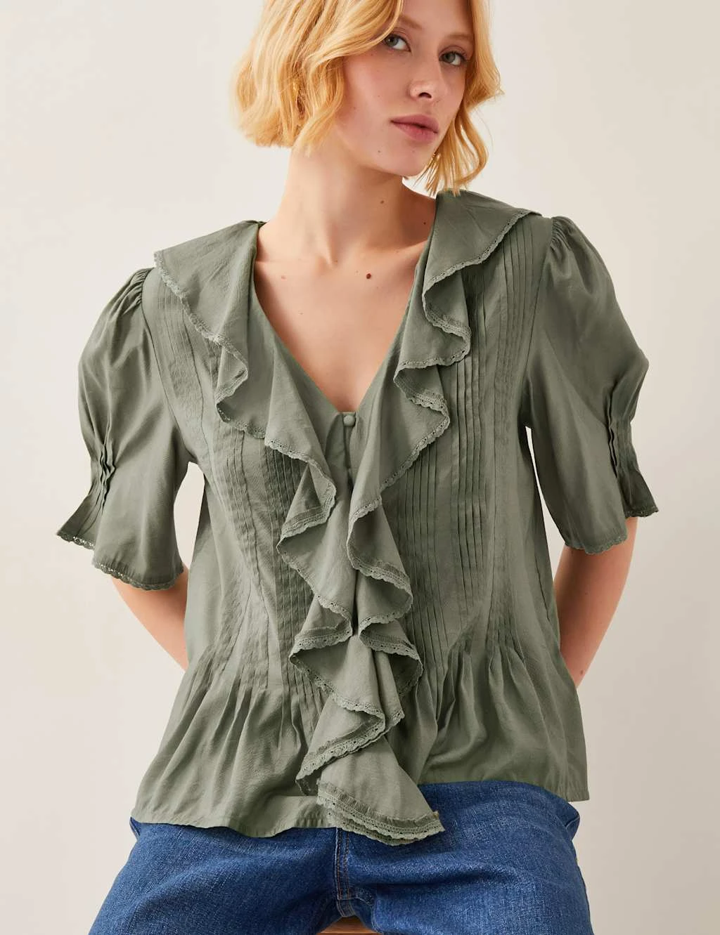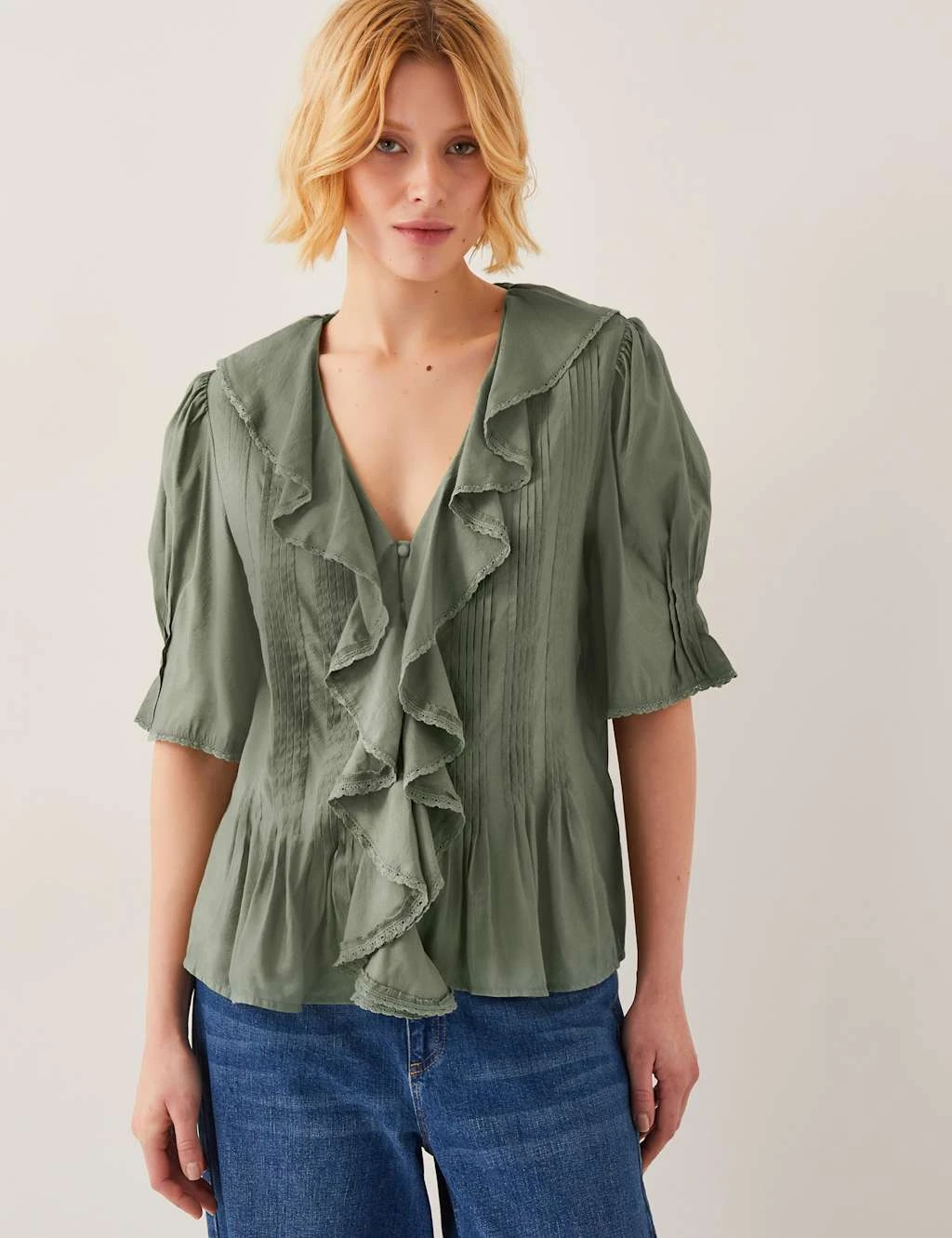 Tap into the boho trend with this floaty blouse from Monsoon. It’s cut in a comfy regular fit, with a feminine v-neckline and a frilled collar that flows down the front. Lace trims and pintucks on the bodice and three-quarter sleeves add a touch of texture. The button fastenings are covered for a neat finish.