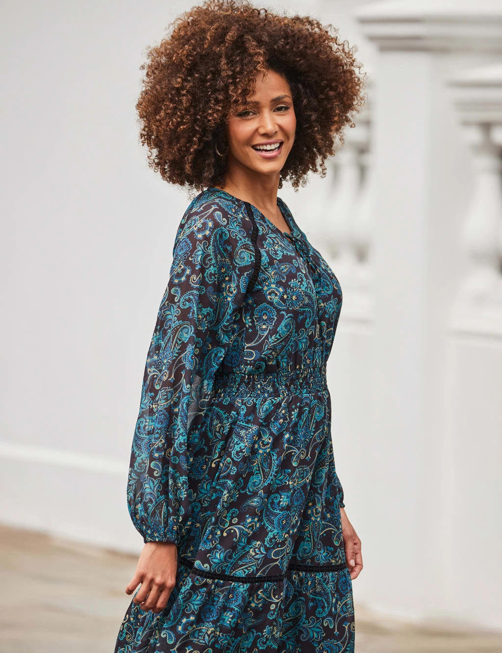 Welcome boho style to your wardrobe with this paisley dress from Sosandar. It’s cut in a flattering fit-and-flare silhouette that skims the body before flaring out into a tiered knee-length skirt. A tie v-neckline and long blouson sleeves complete the elegant styling.