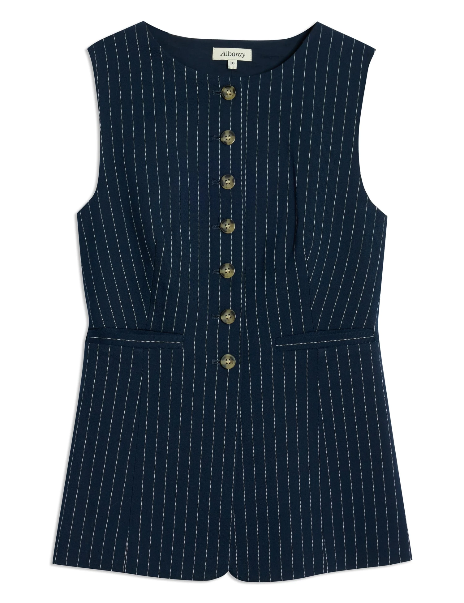 This waistcoat from Albaray is crafted from a soft-touch fabric with a hint of stretch for flexibility. It’s designed in a regular fit with a sharp pinstripe pattern for a contemporary look. The collarless piece features a single cinch fastener at the back and two front welt pockets.