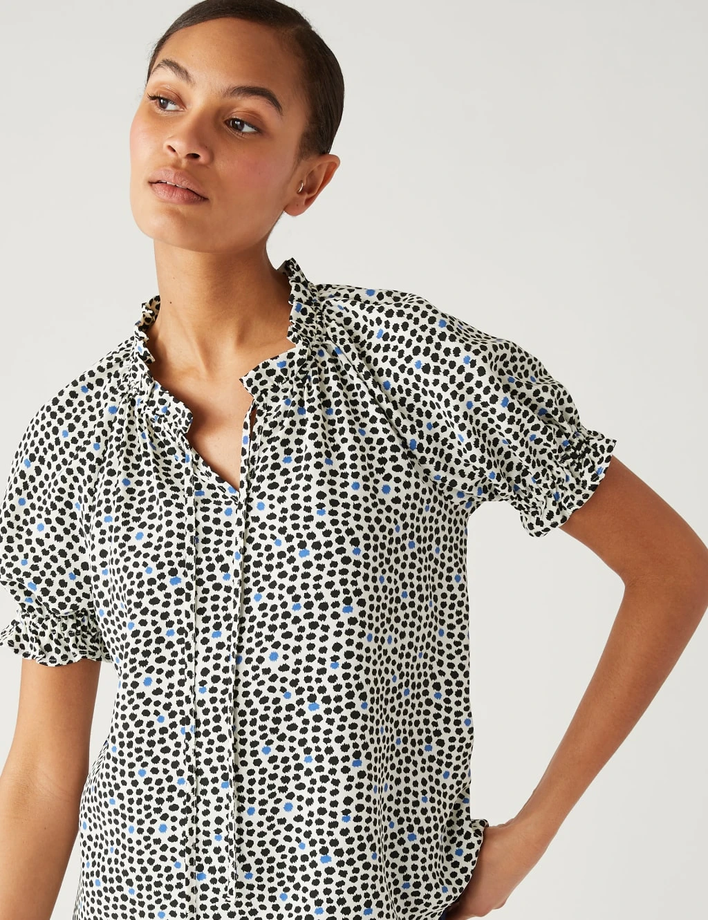 This polka dot blouse makes a striking impression with its elegant tie neck and ruffled trim. It’s designed in a classic regular fit, with short gathered sleeves that end in pretty frilled cuffs.